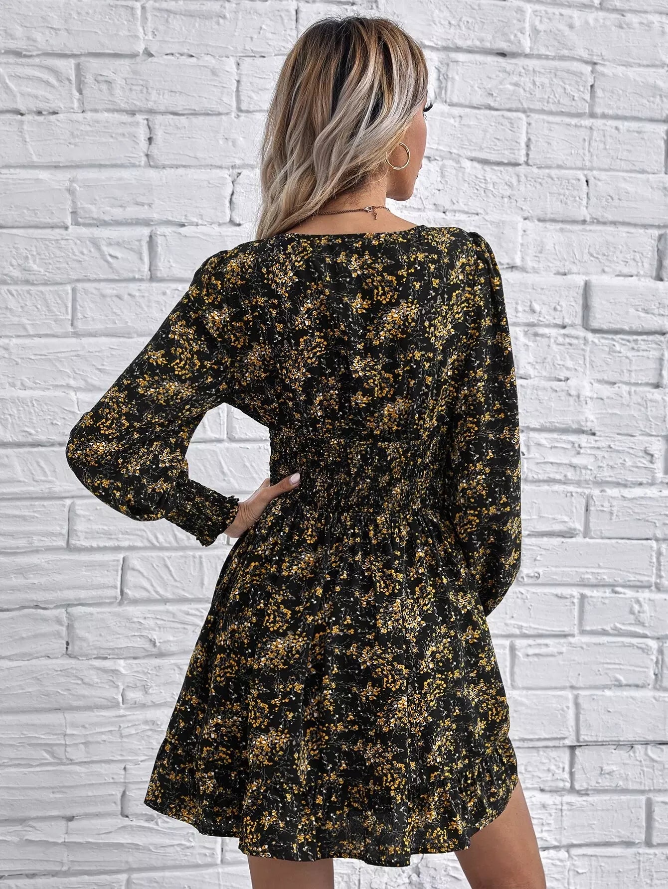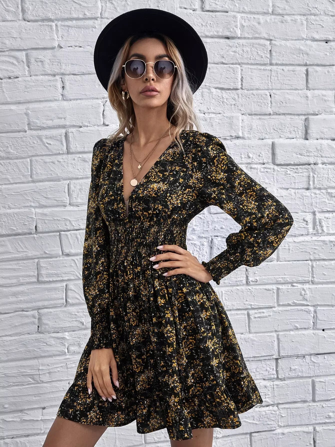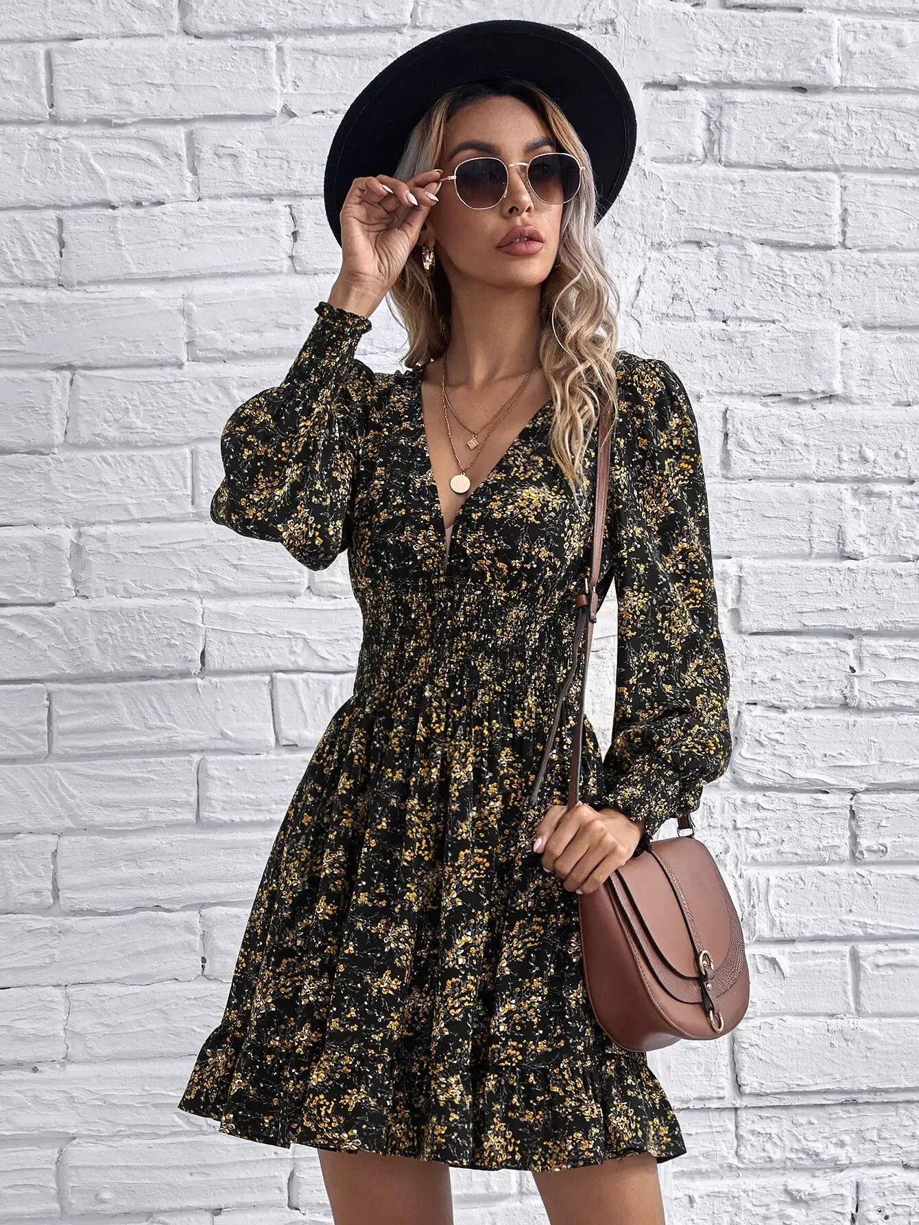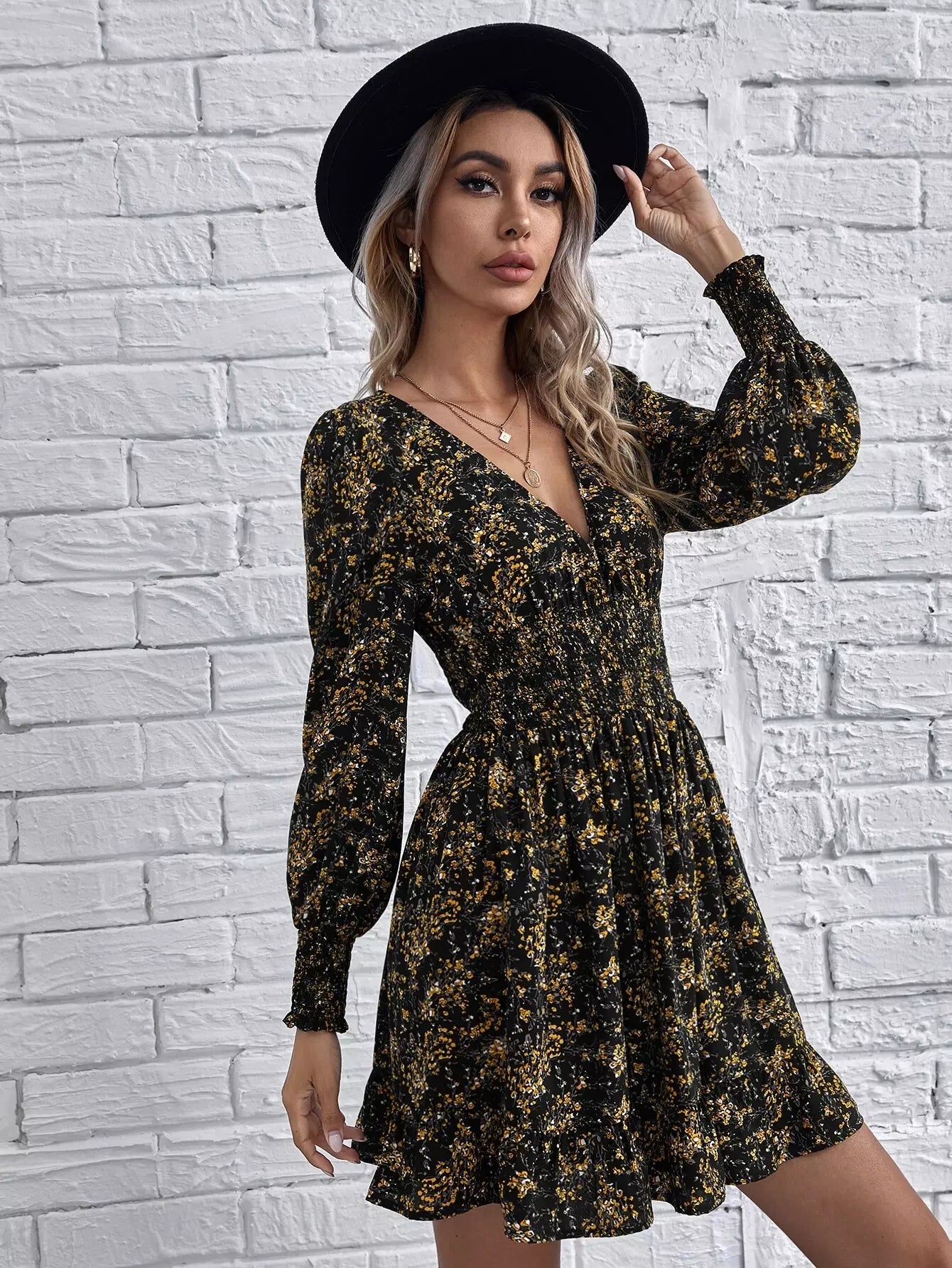 فستان مطبوع بالكامل على شكل حرف V بياقة على شكل حرف V بياقة على شكل درابزين بحافة كشكش