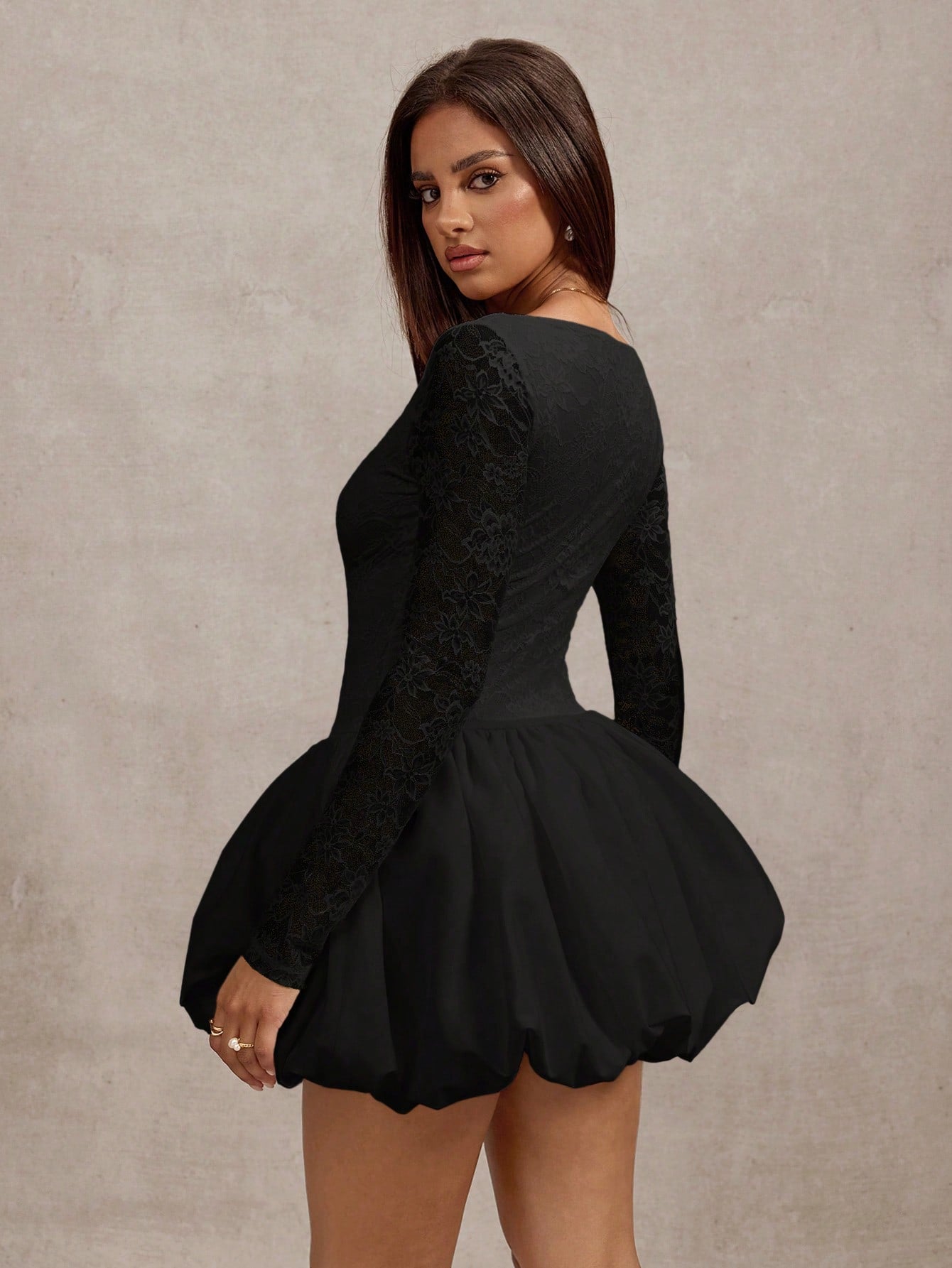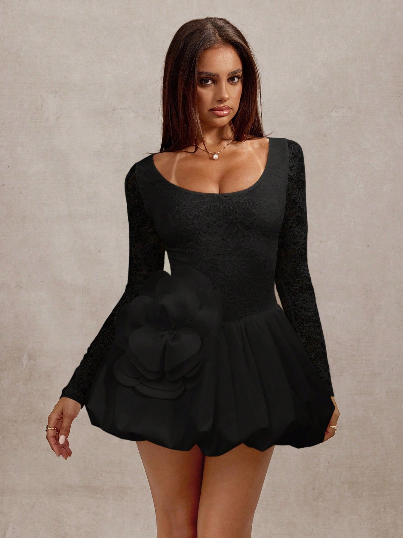 BAE Elegant Floral 3D Lace Square Collar Long Sleeve Bodycon Flared Dress, Suitable For Spring/Summer,