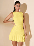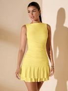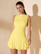 فستان قصير من BAE نسائي أبيض سادة بدون أكمام ومكشكش، ضيق وواسع الطبقات لفصل الصيف.