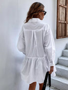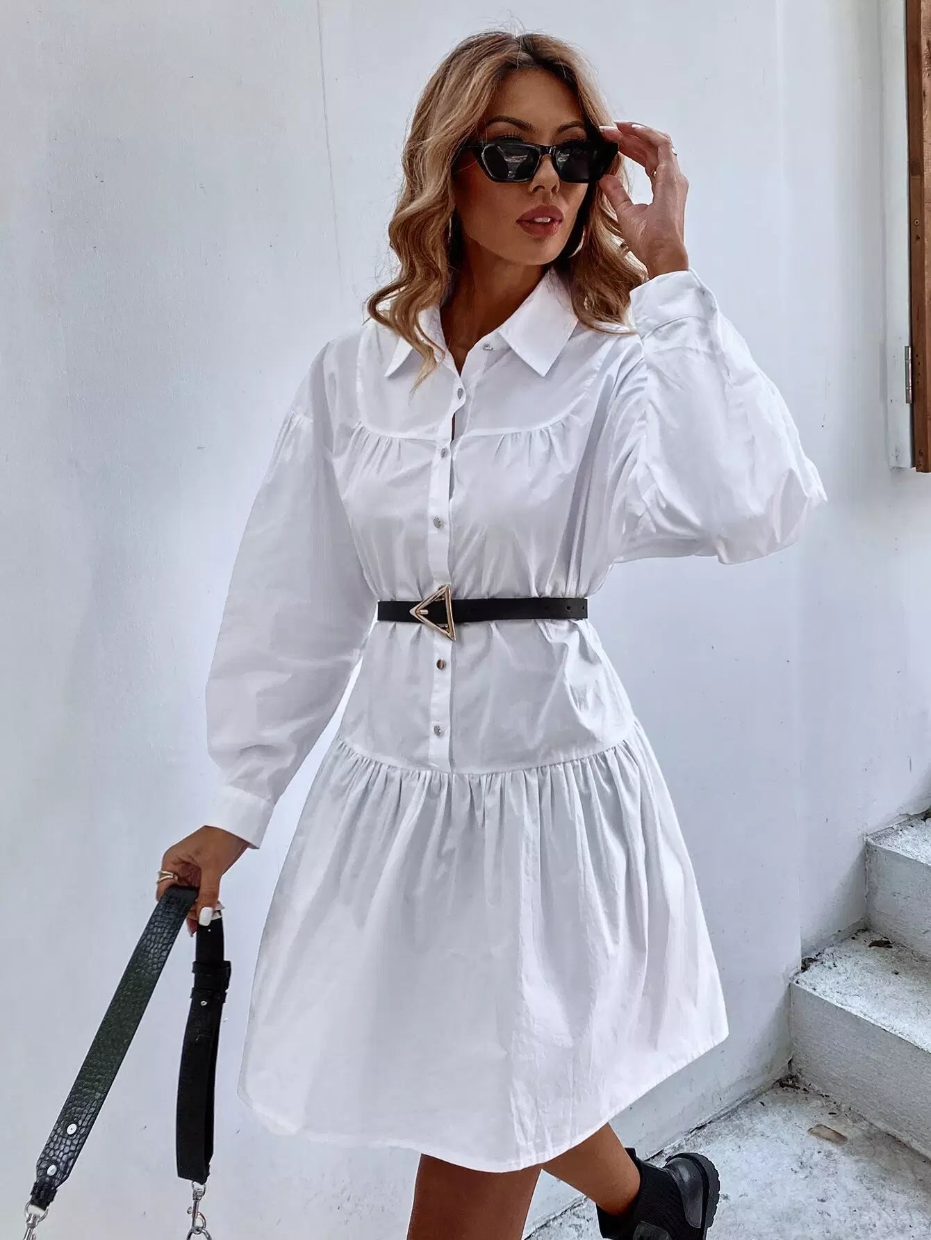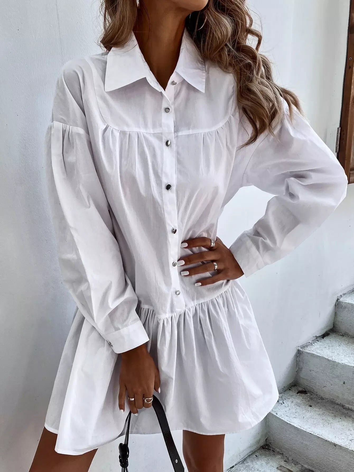 للنساء - فستان قميص بحاشية مكشكشة بأزرار أمامية بدون حزام