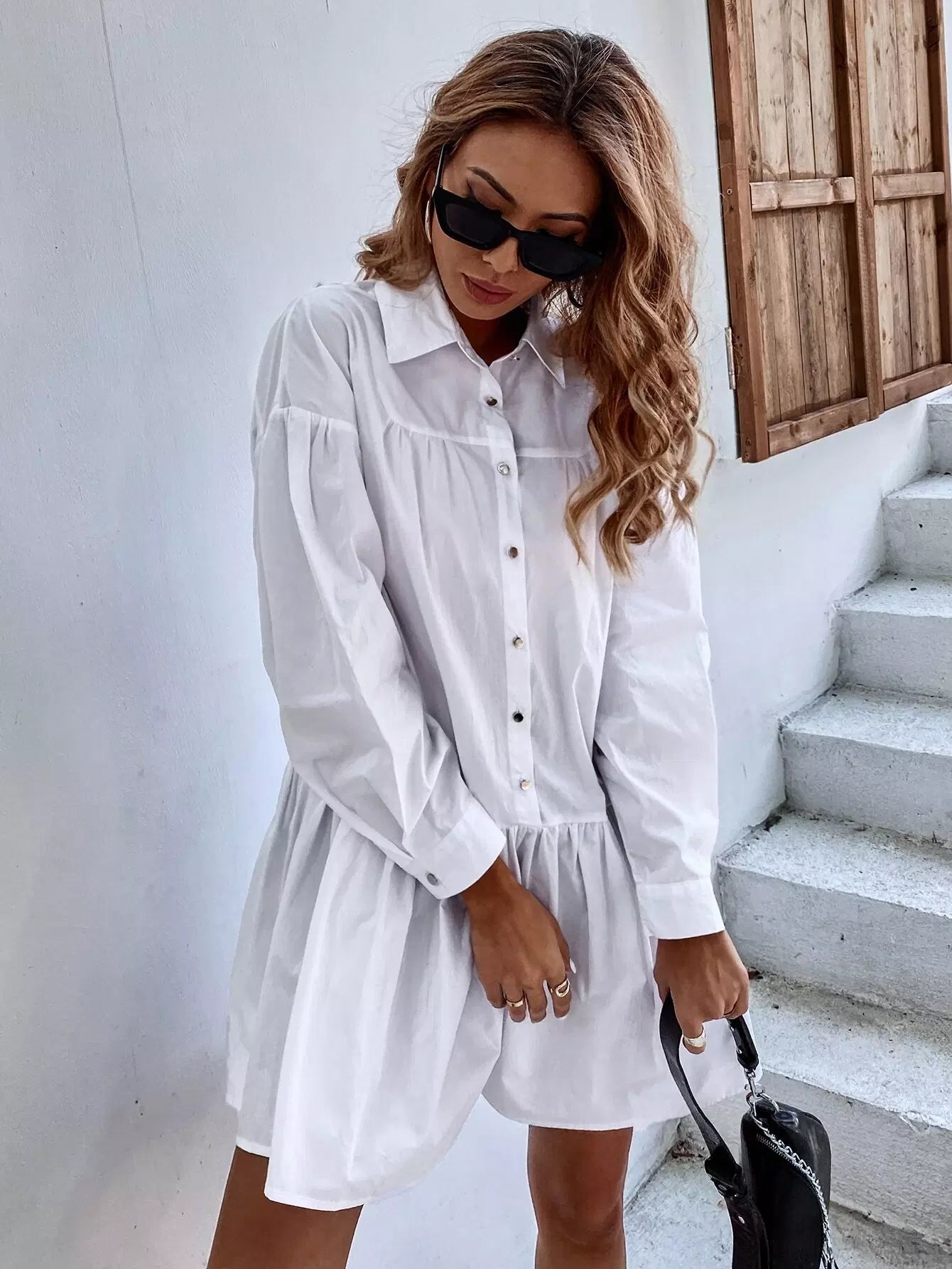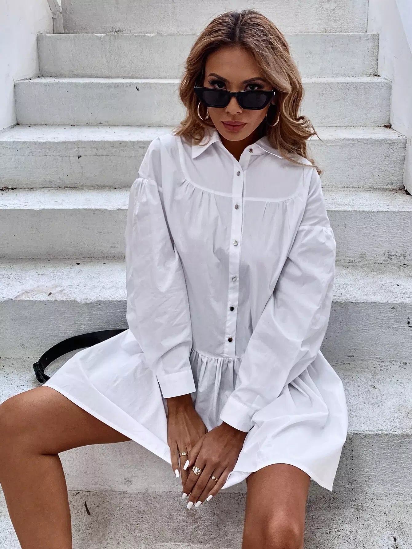 فستان قميص بحافة كشكش من الأمام بأزرار بدون حزام