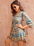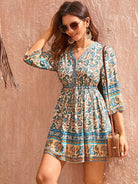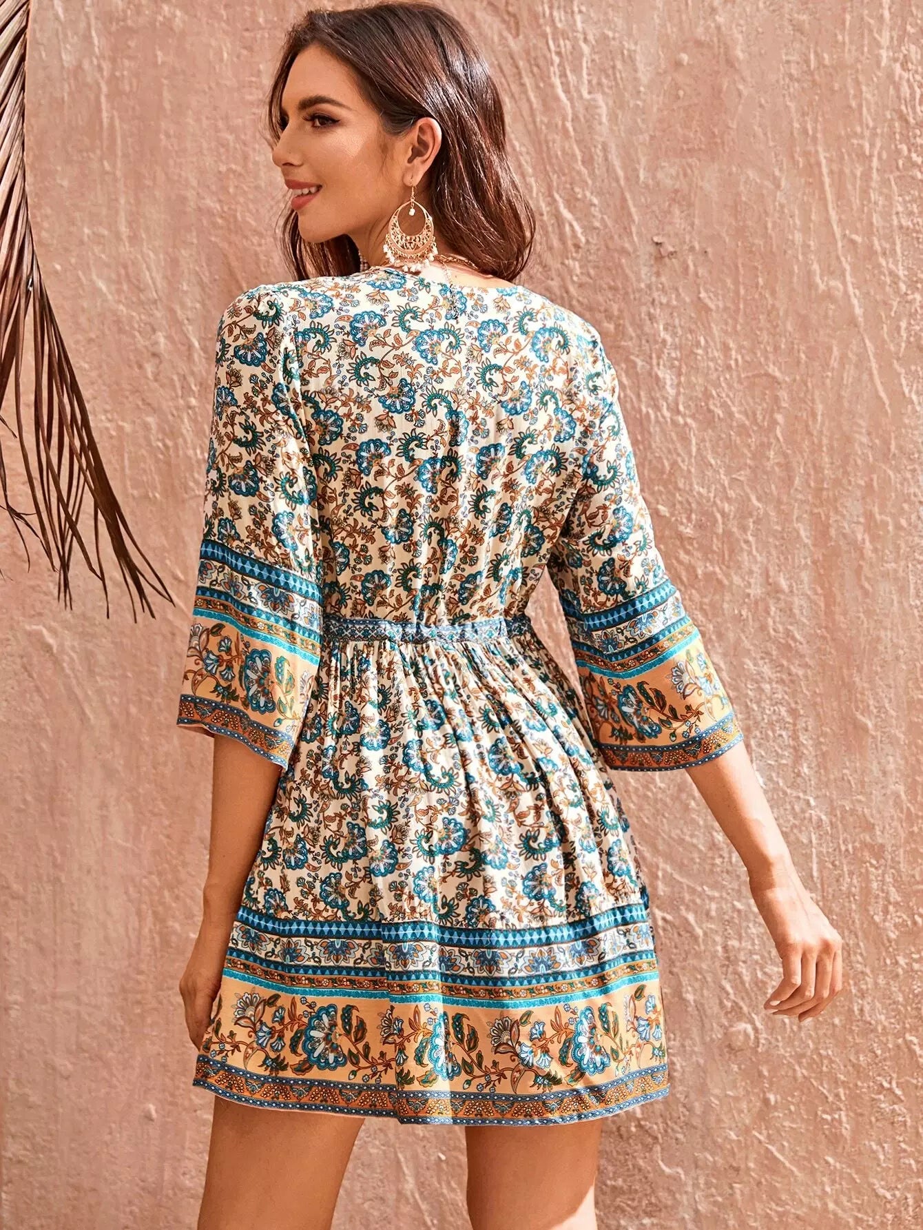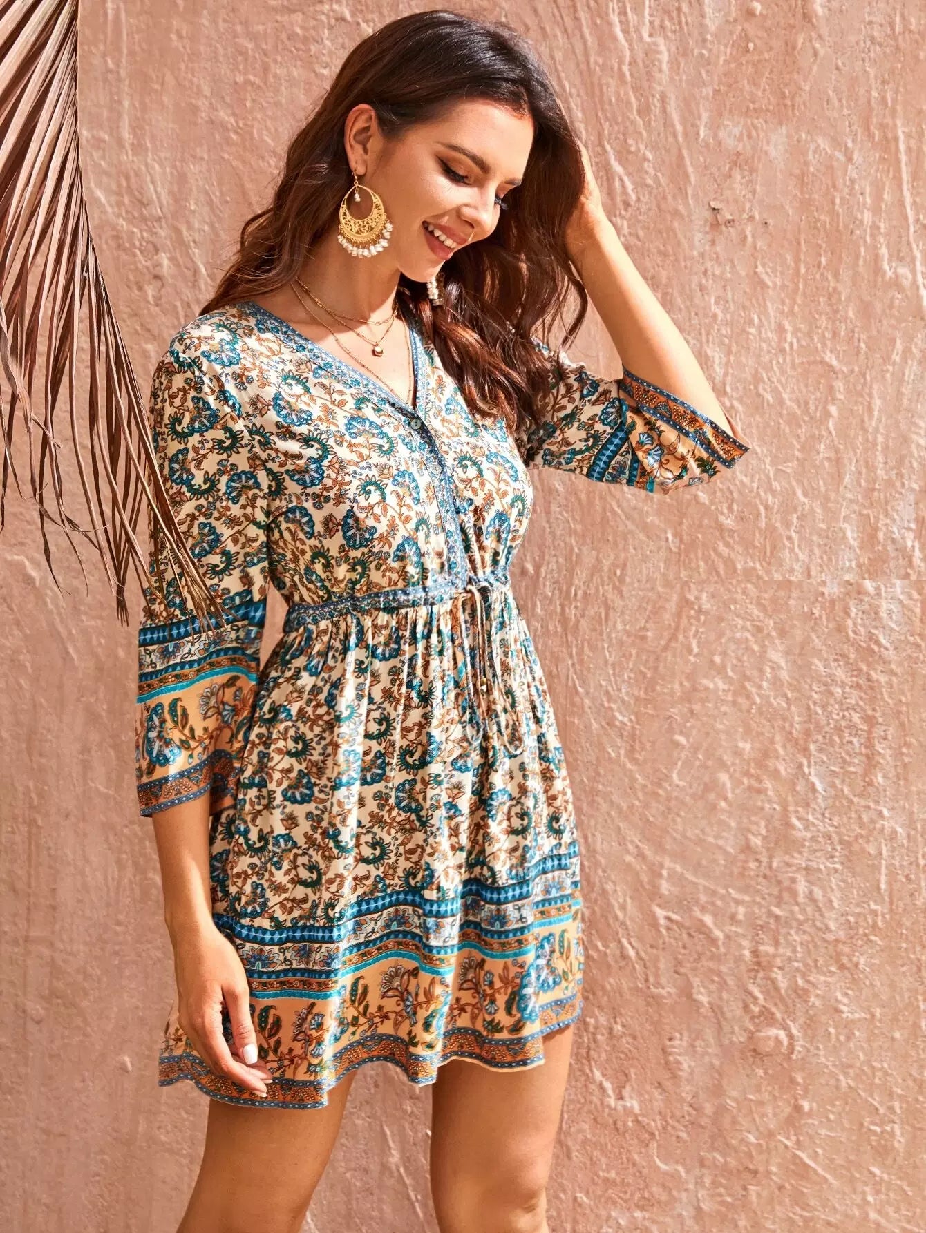 فستان قصير بأزرار من خلال خصر برباط على شكل أزهار على شكل حرف A