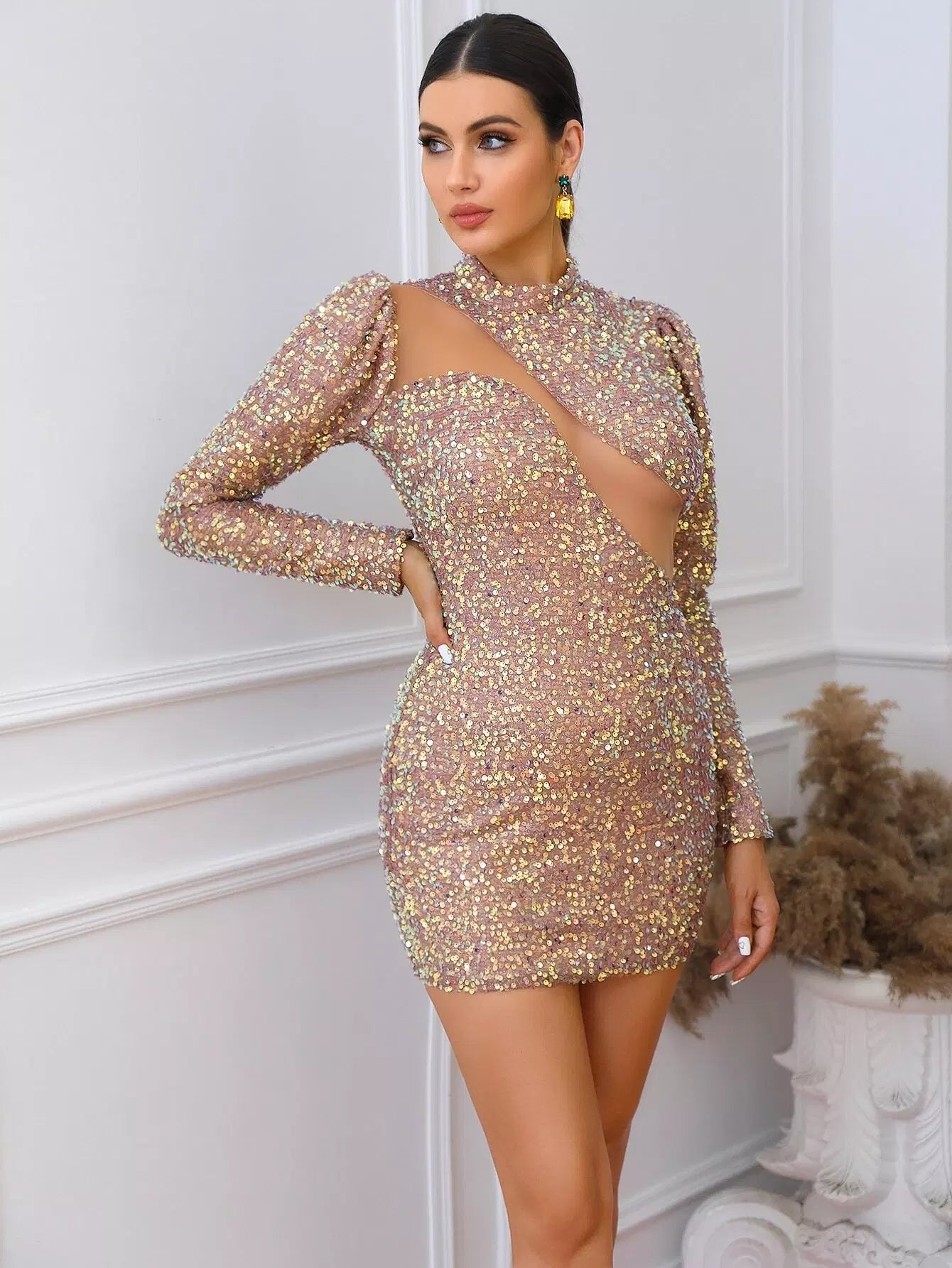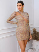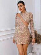 فستان بوديكون بأكمام شبكية منتفخة من الترتر المنفوش بلون مغاير