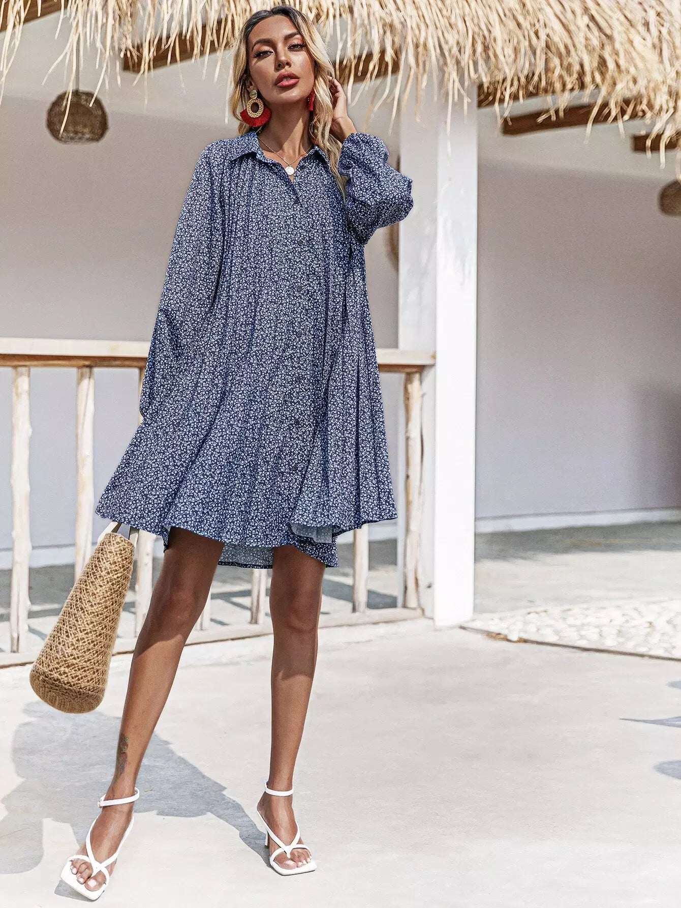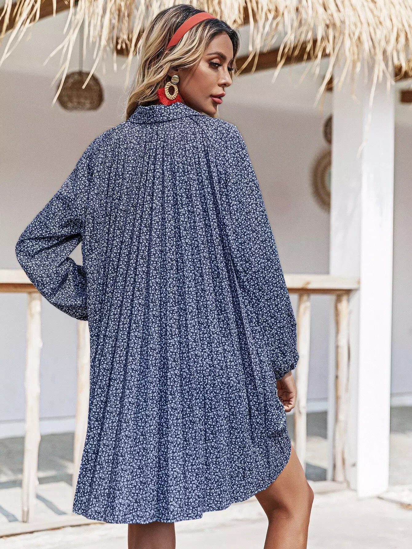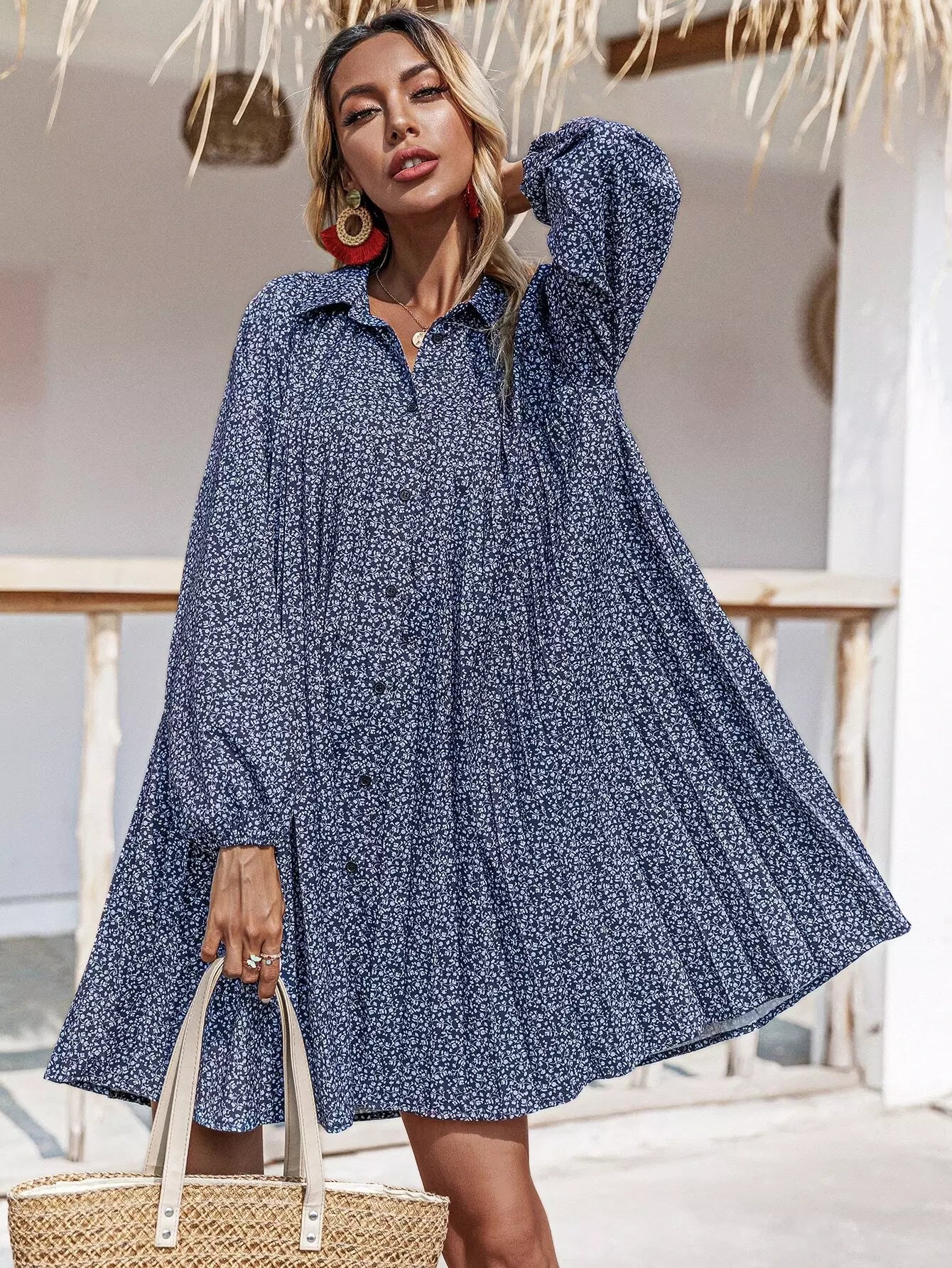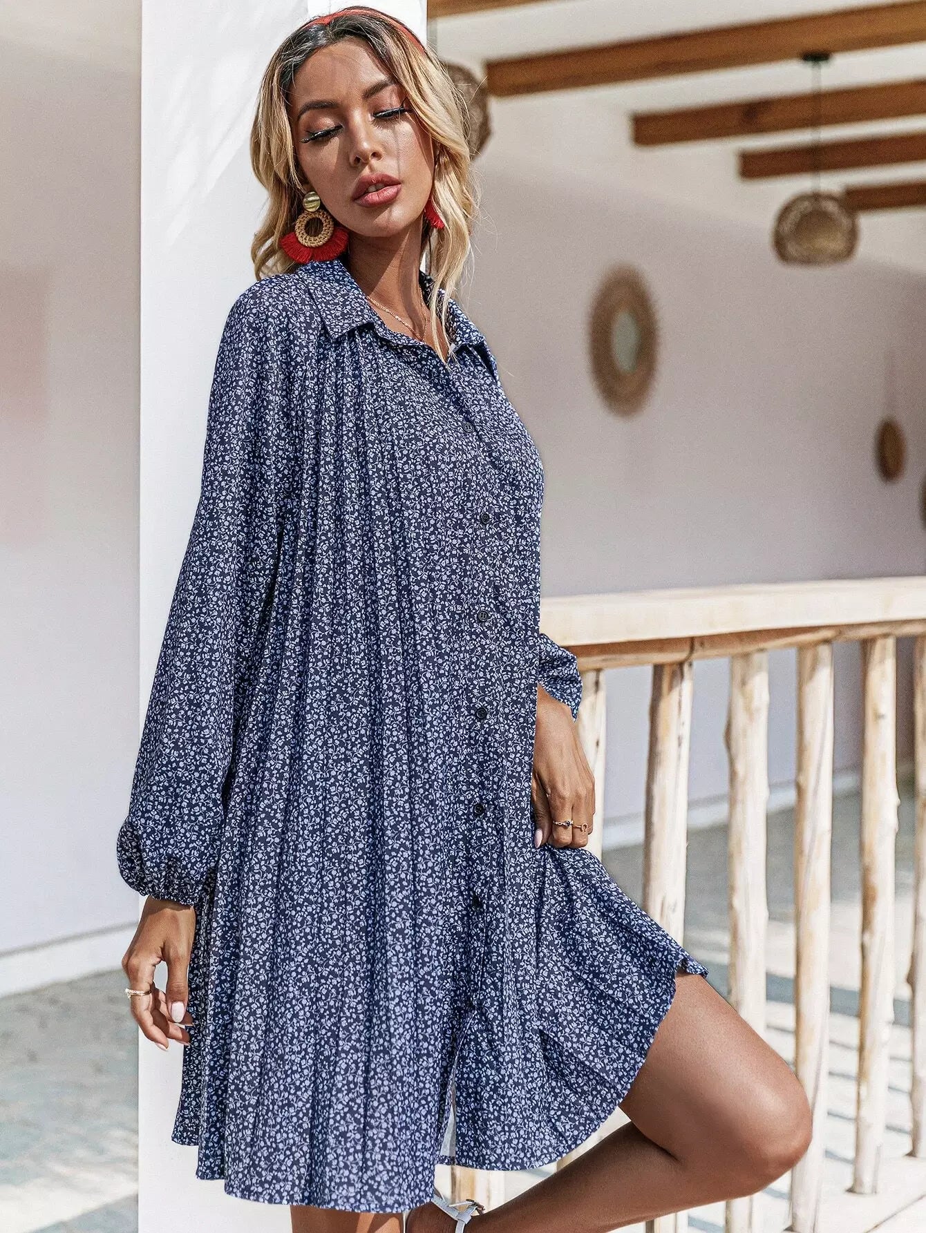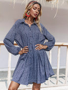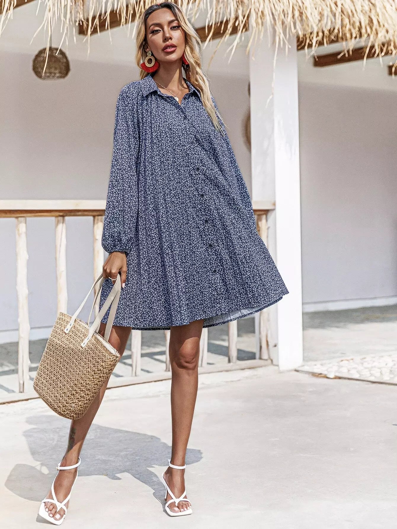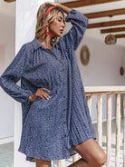 فستان قميص بأزرار أمامية مزين بالورود