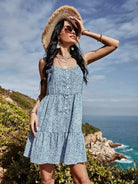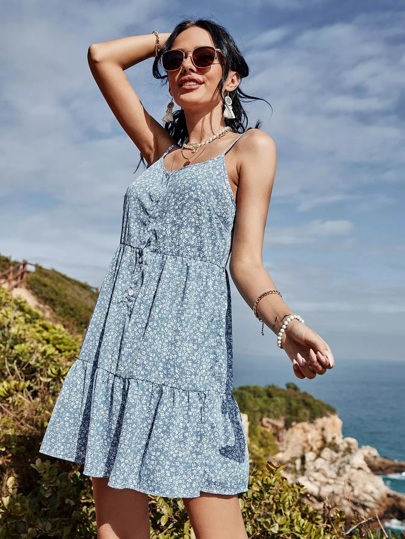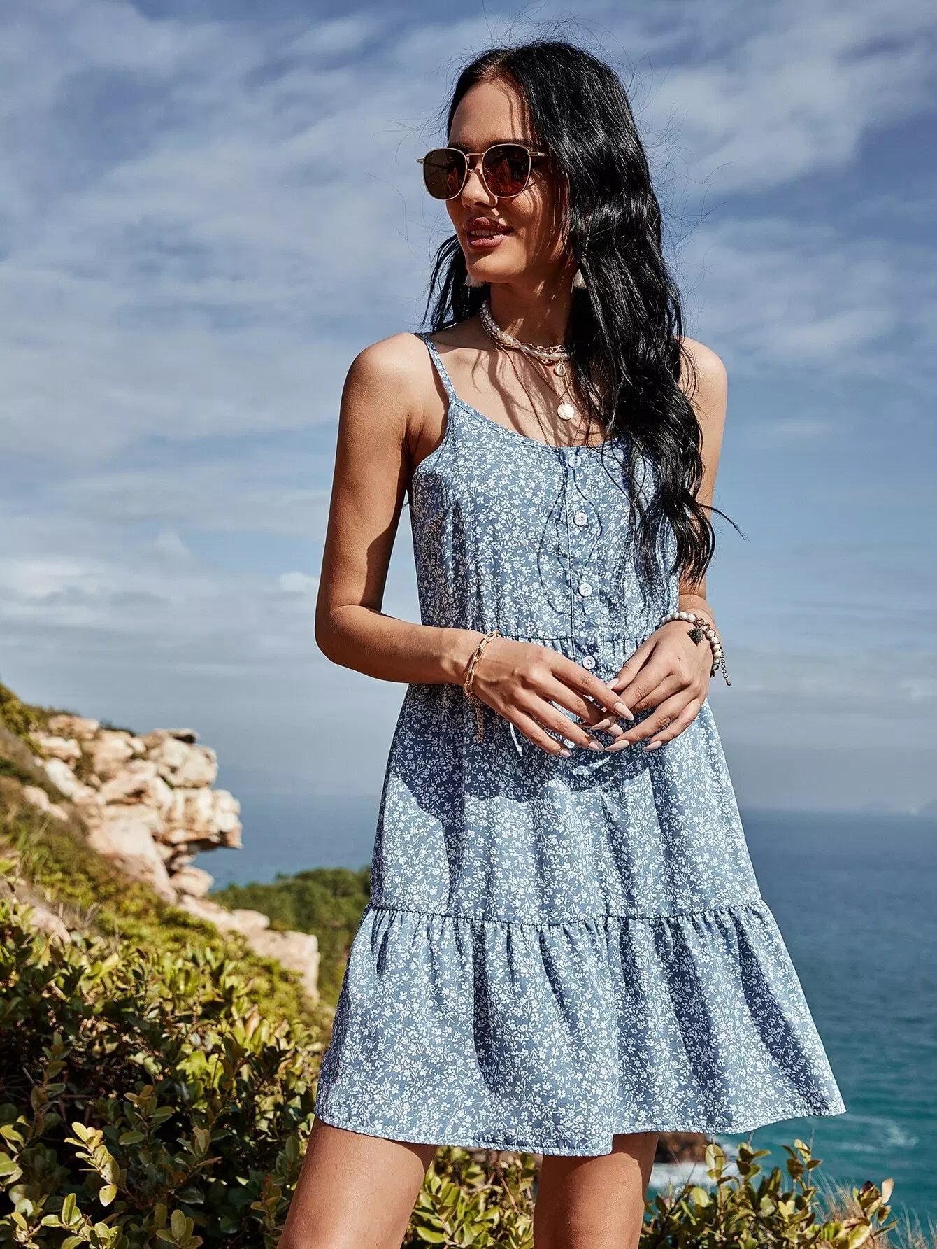 فستان كامي بطبعة زهور صغيرة مع أزرار أمامية وحاشية مكشكشة