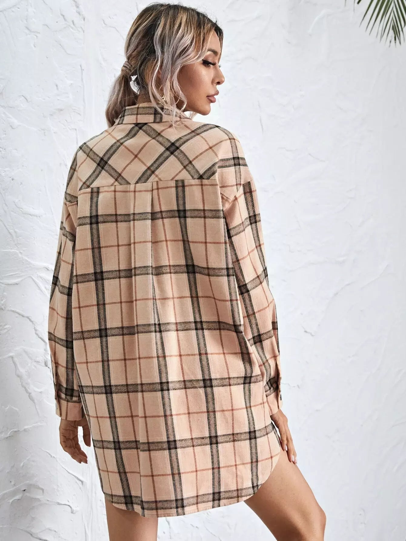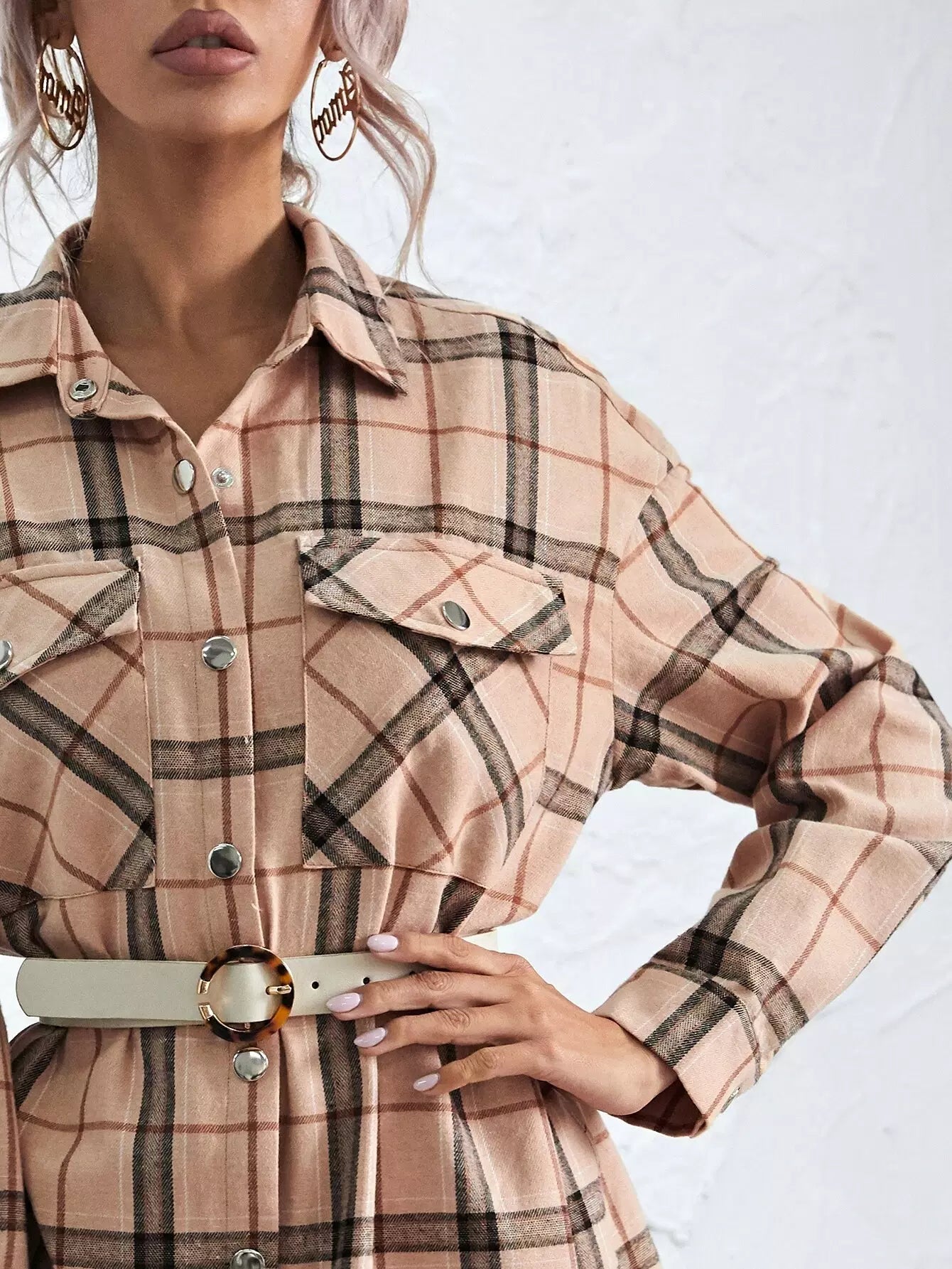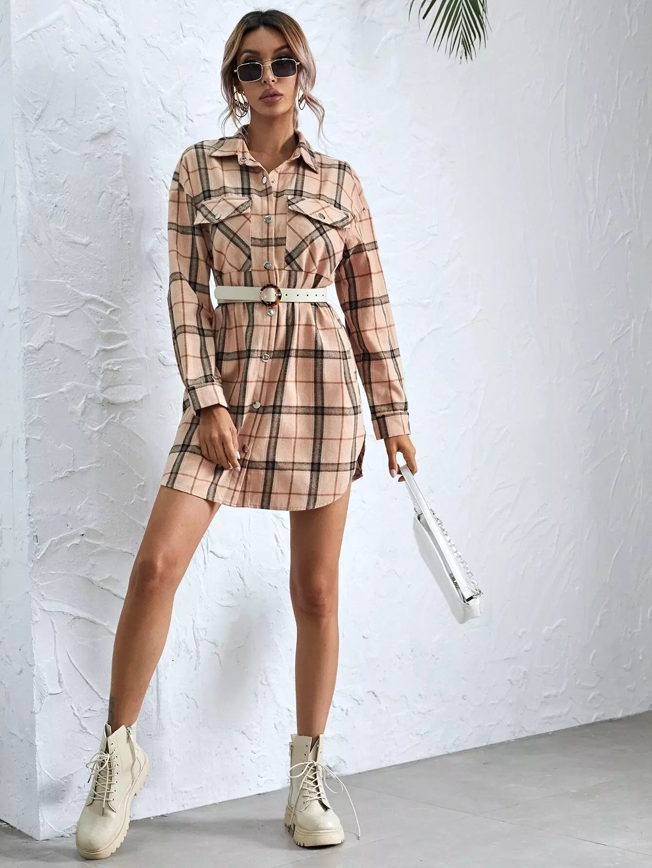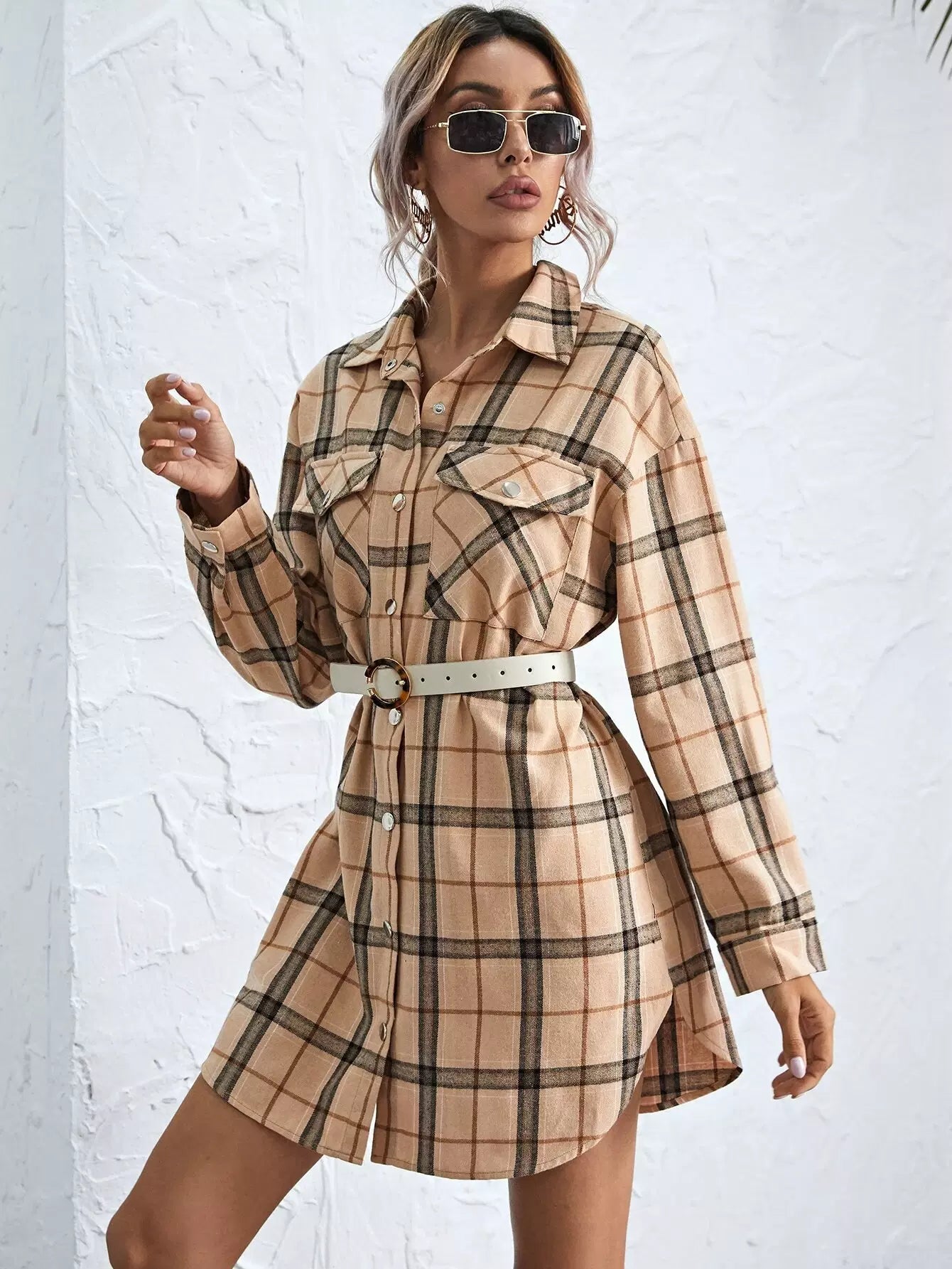 فستان قميص منقوش بكتف منسدل وجيب بقلاب وحاشية منحنية بدون حزام