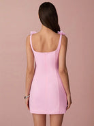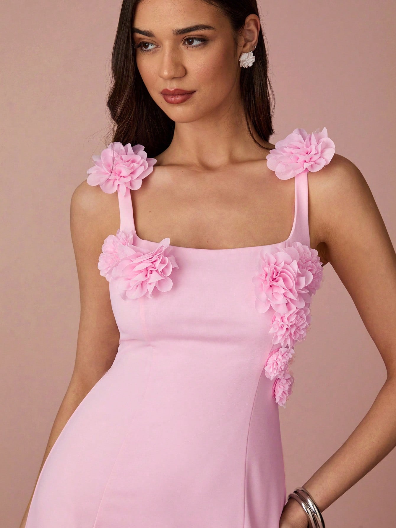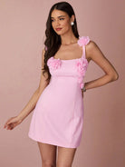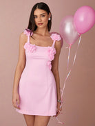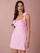 Enchnt Spring/Summer Romantic Women Summer Pink 3D Floral Square Collar Neck Halter Mini Dress, Sweet&Elegant