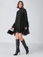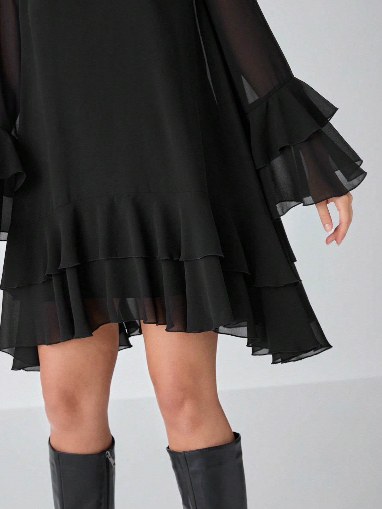 فستان نسائي رومانسي أنيق ورومانسي من Enchnt لربيع وصيف، من الشيفون الأسود المرقّع بأكمام طويلة وبسيط