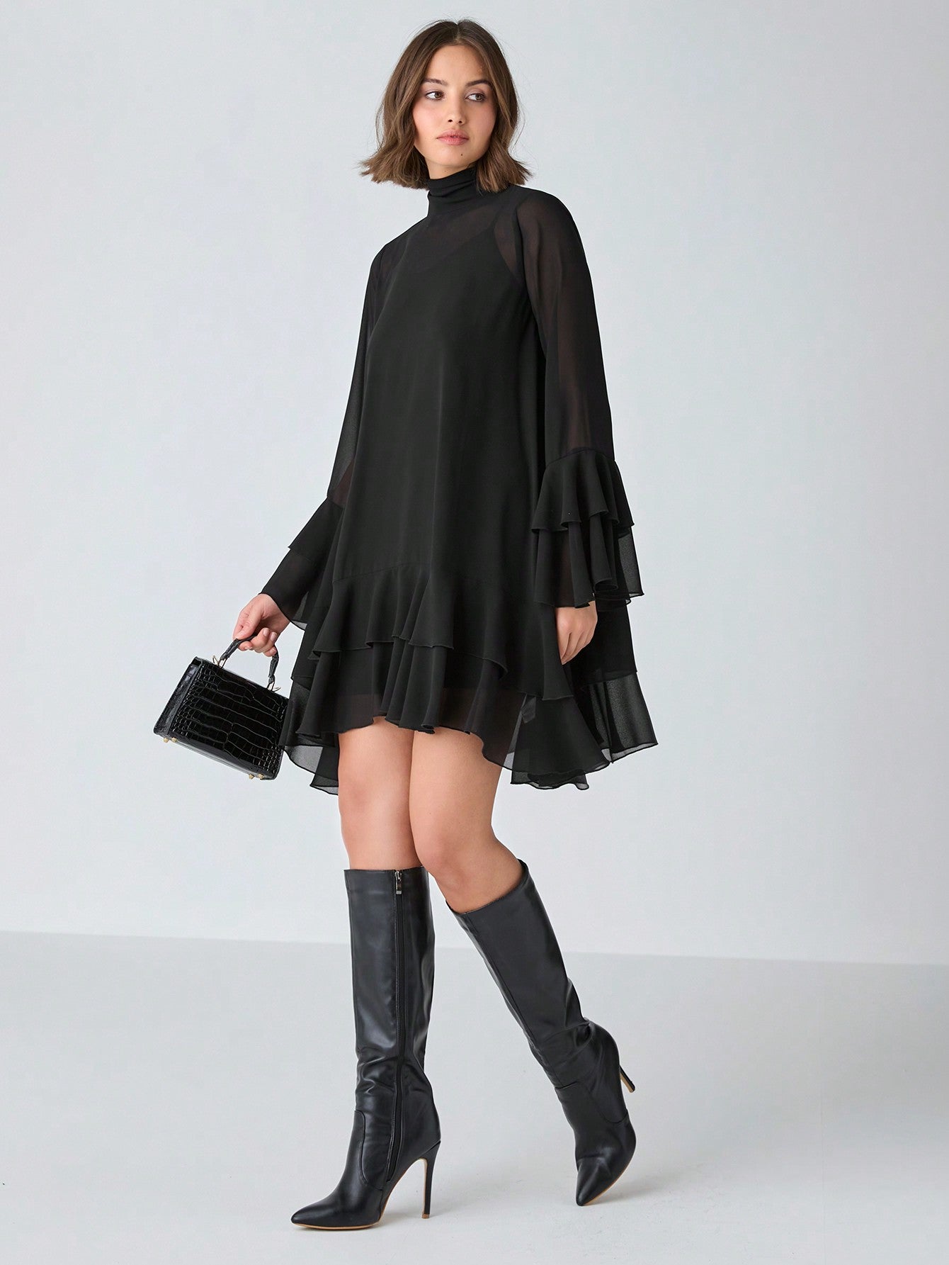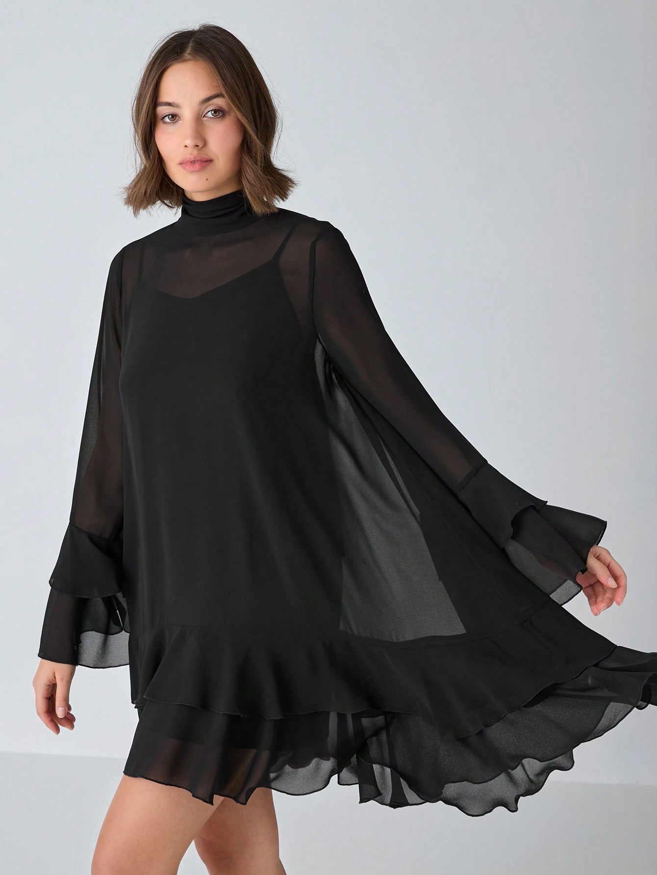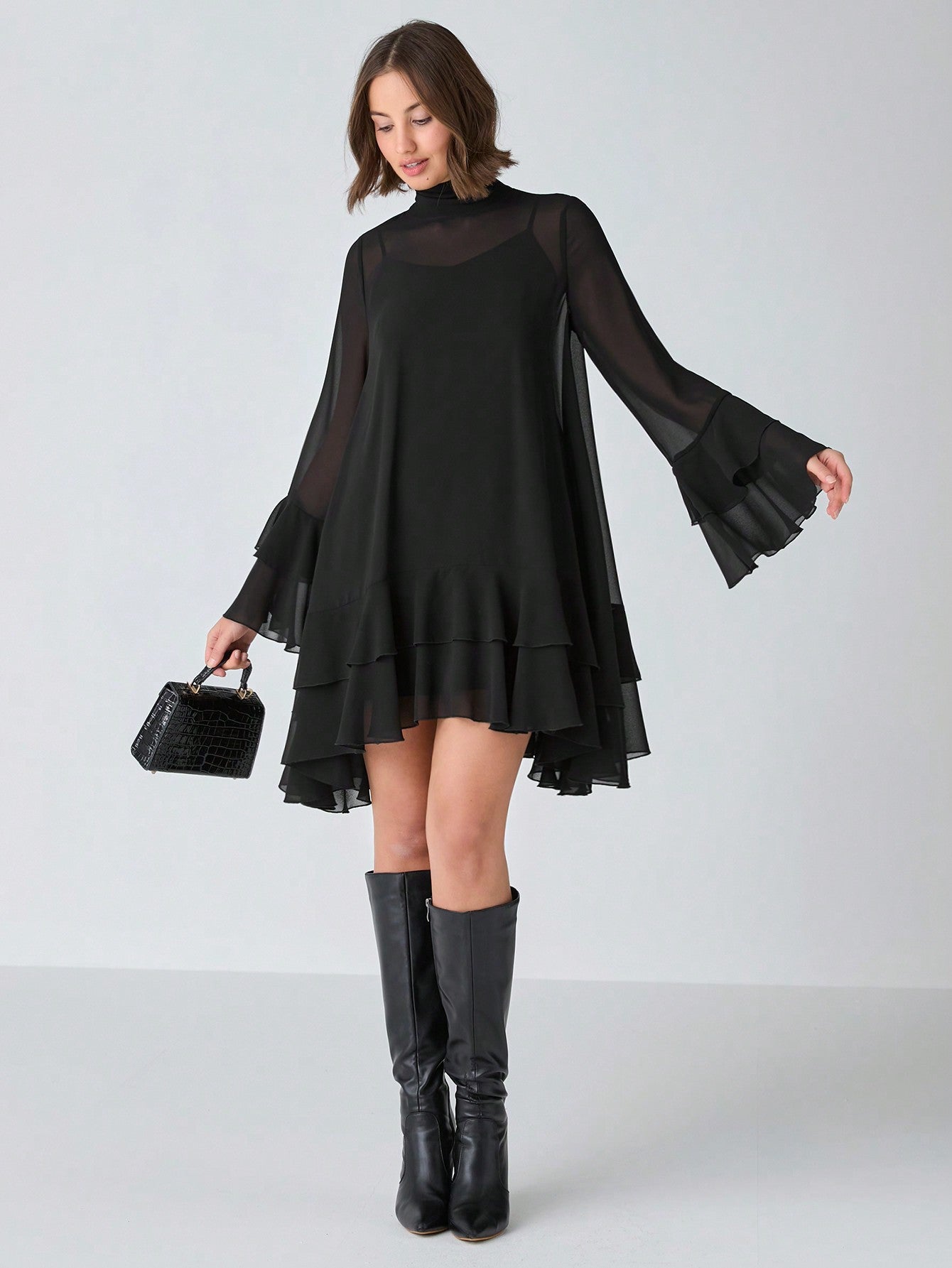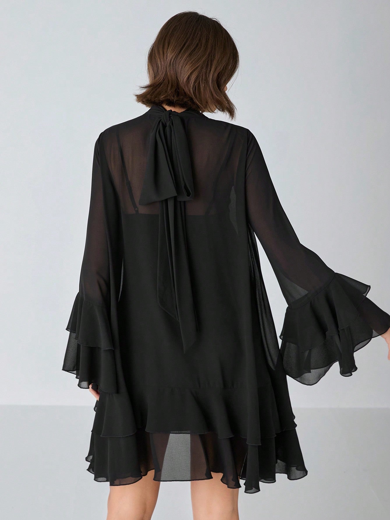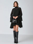 Enchnt Spring/Summer Romantic Women's Elegant And Romantic Black Chiffon Patchwork Long-Sleeved Simple