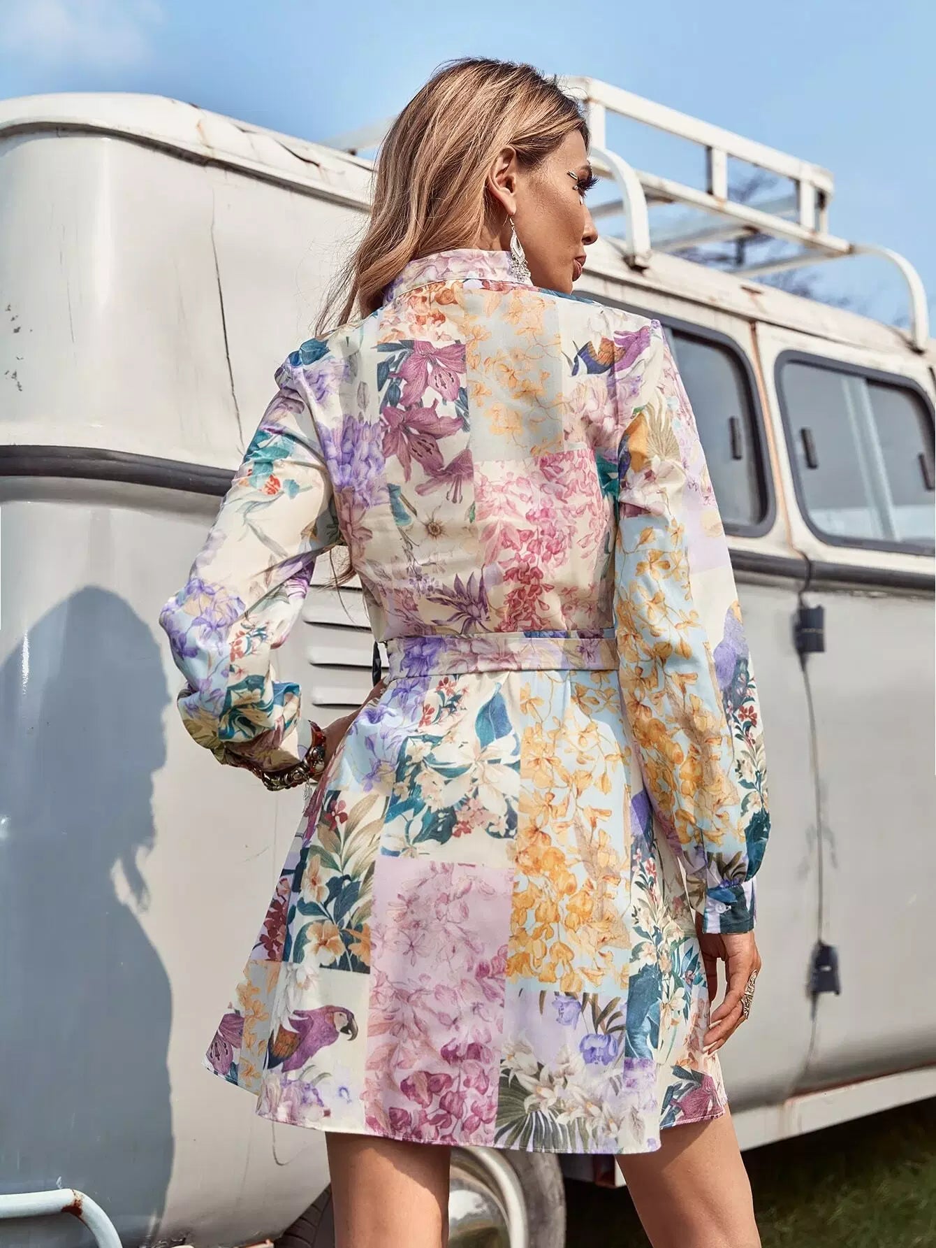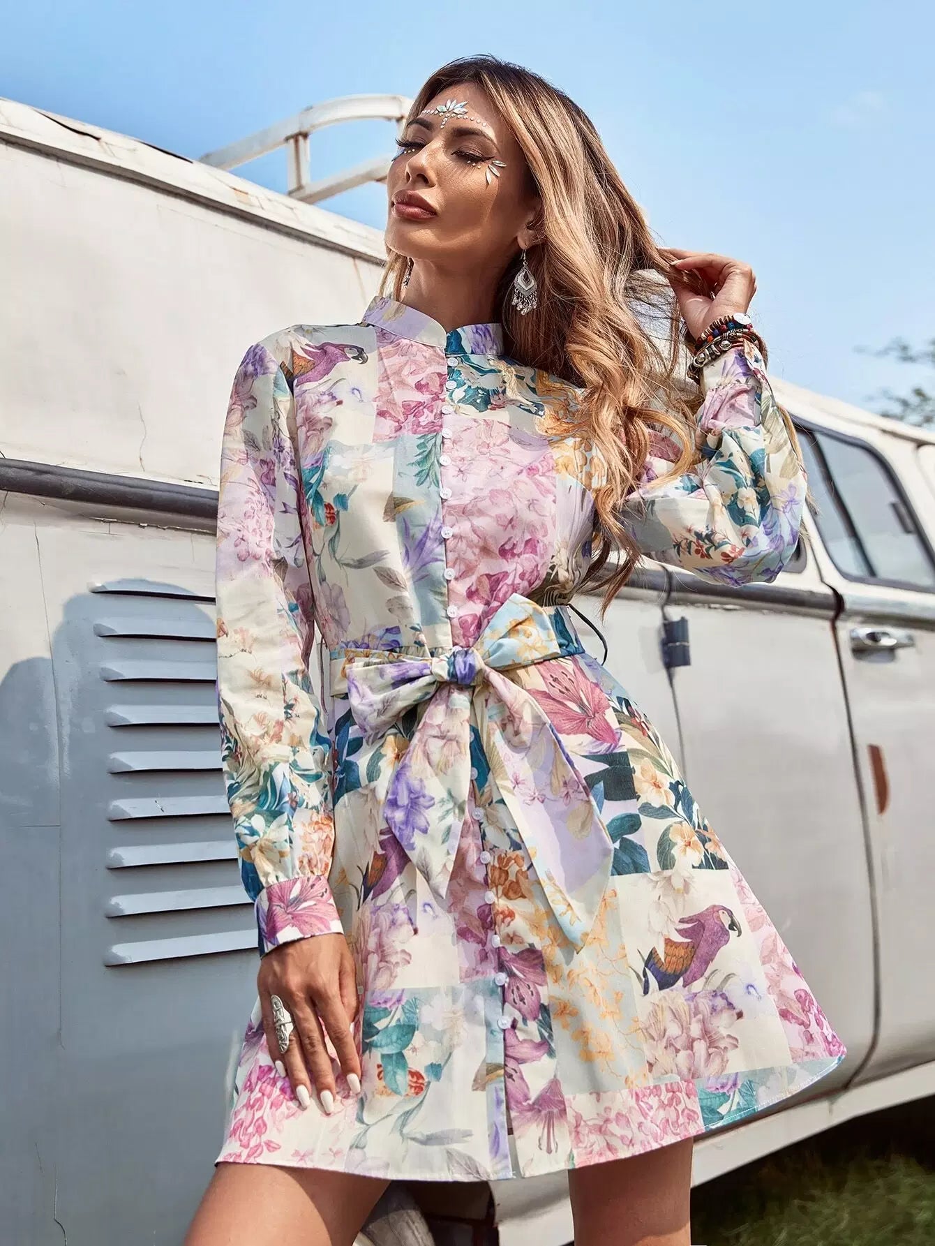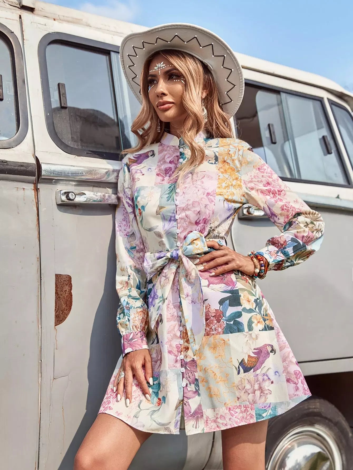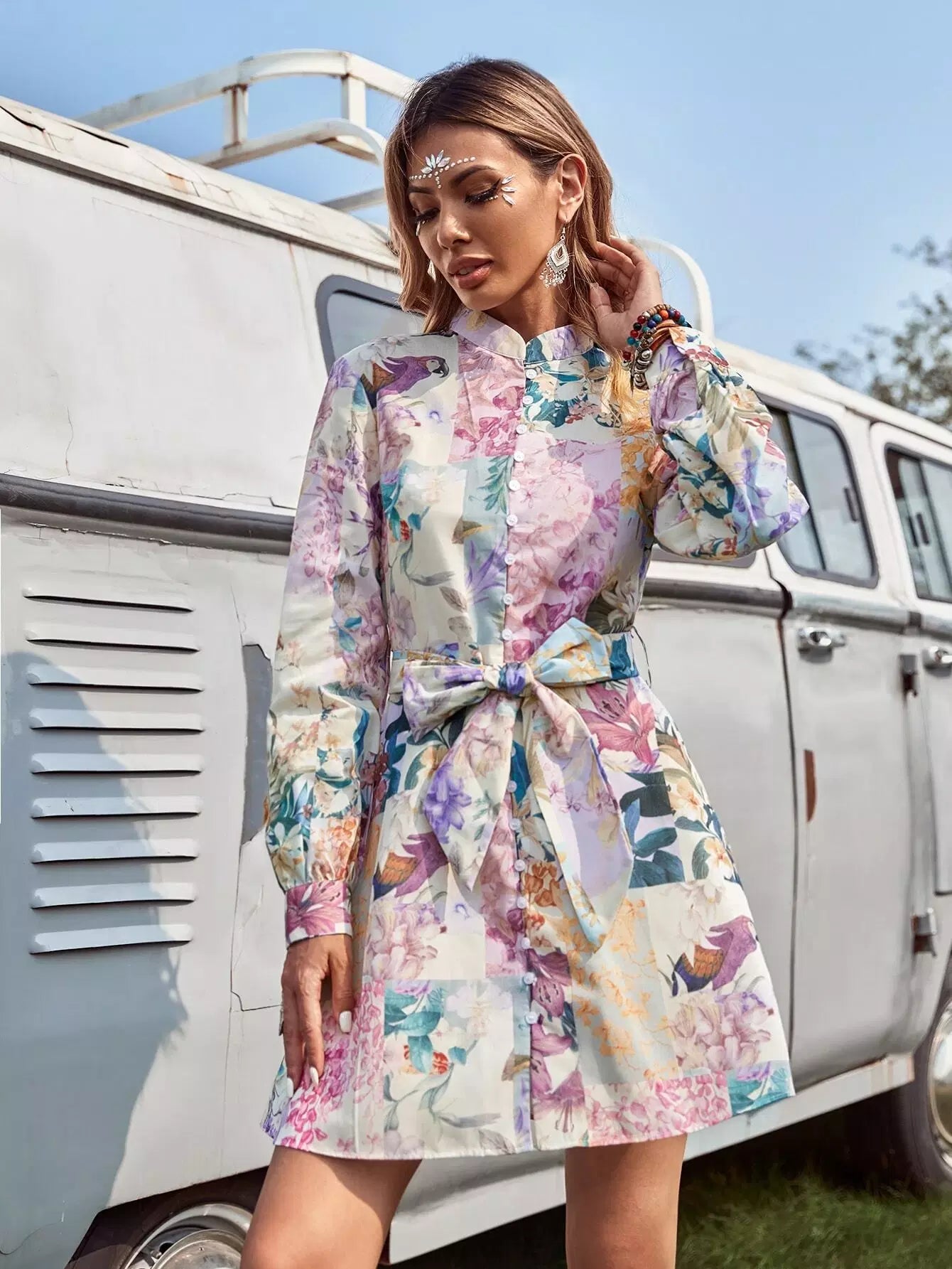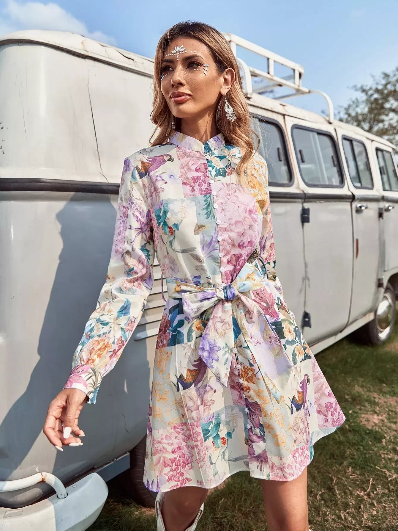 للنساء - فستان على شكل قميص بأزرار أمامية وحزام على شكل زهور