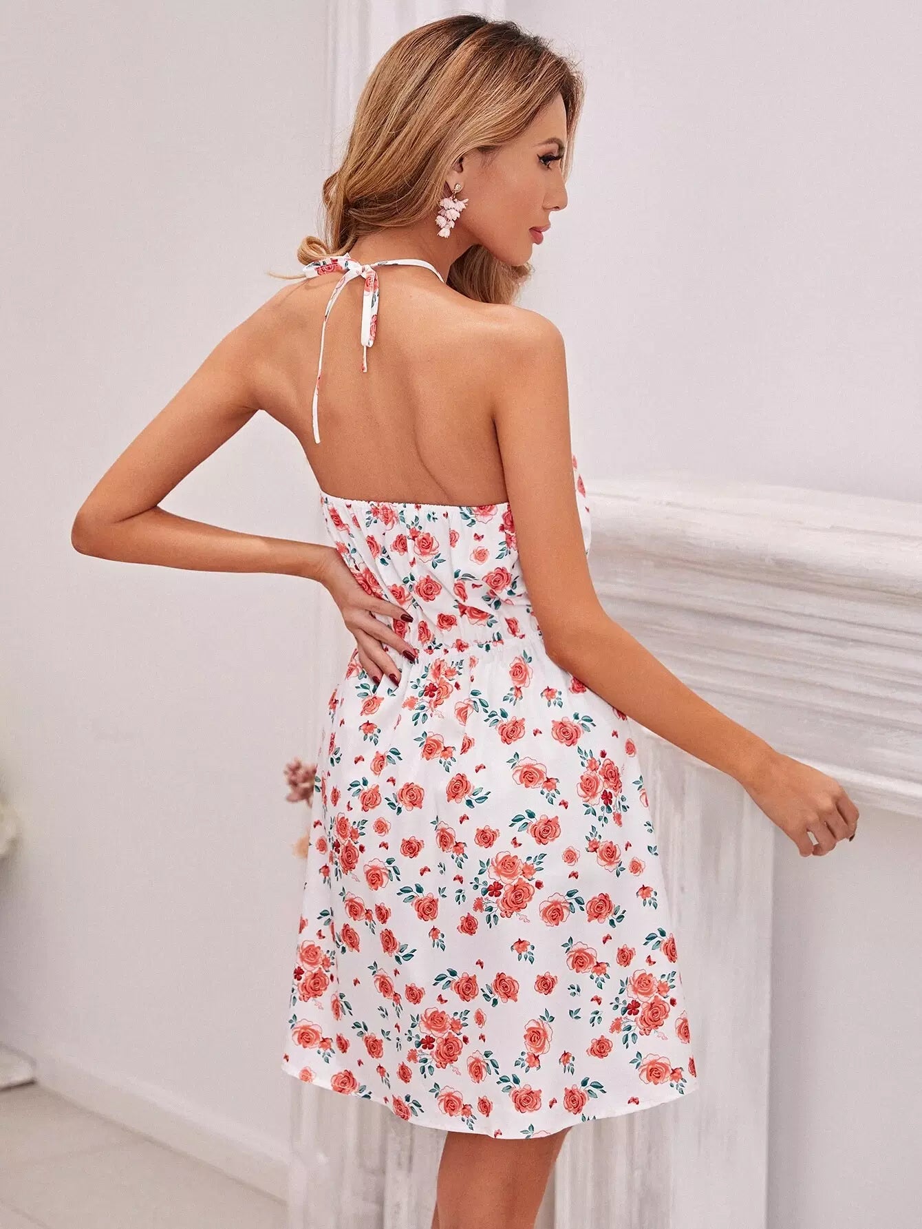 فستان بطبعة زهور مطبوع بفتحة صدر أمامية من الأمام وبدون رسن