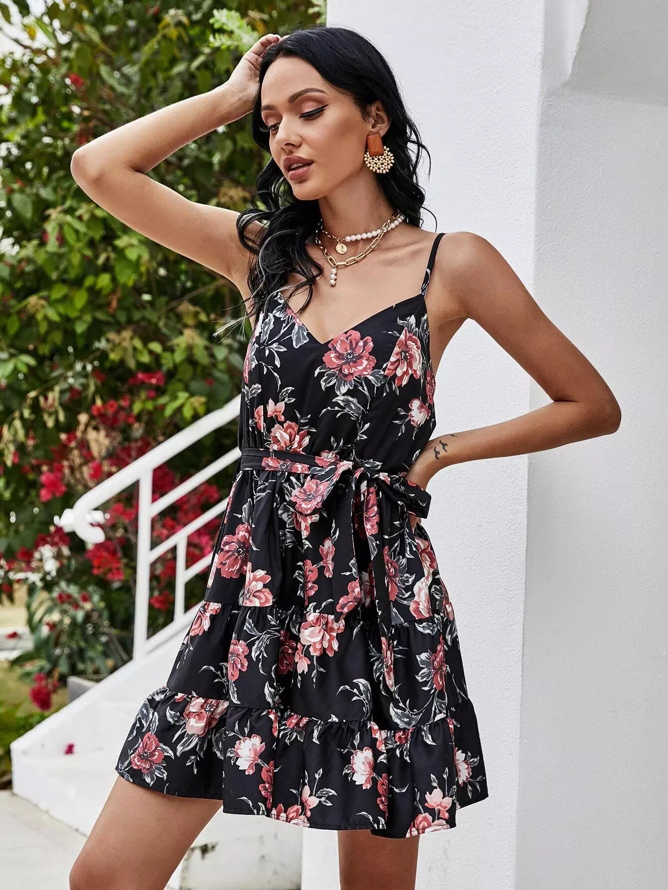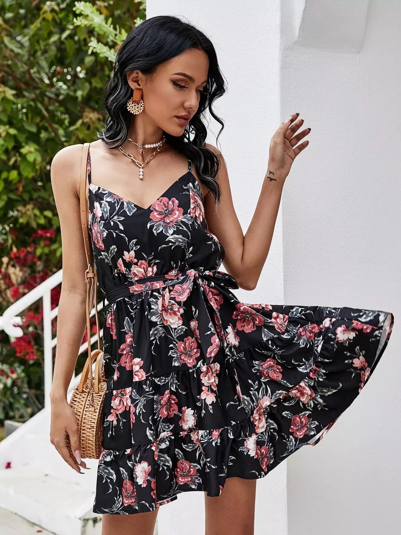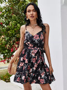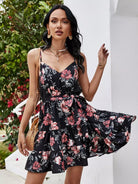 للنساء - فستان كامي بحزام وبحواف مكشكشة وطبعات زهور