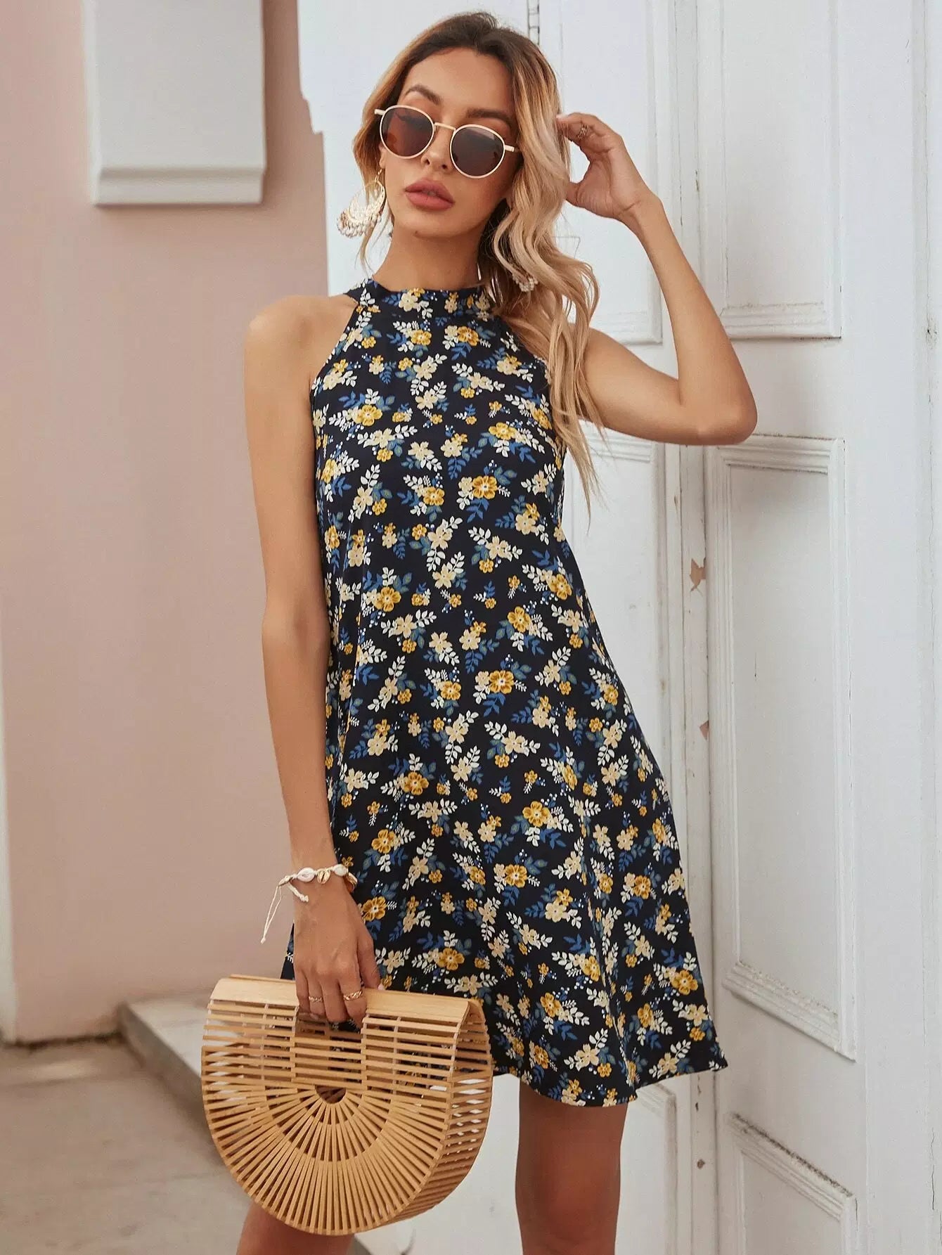 فستان زهري برباط حول الرقبة