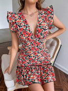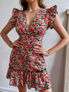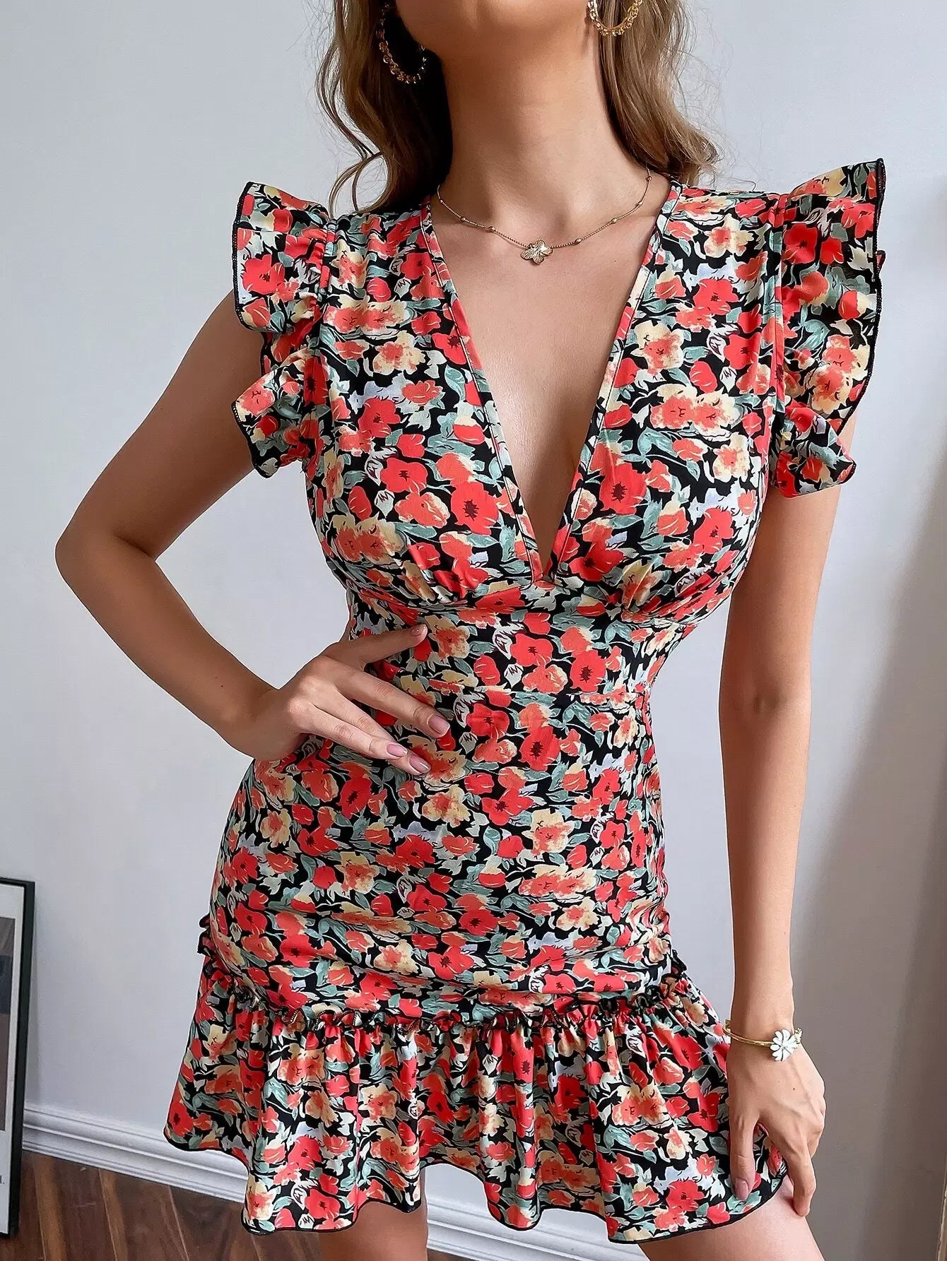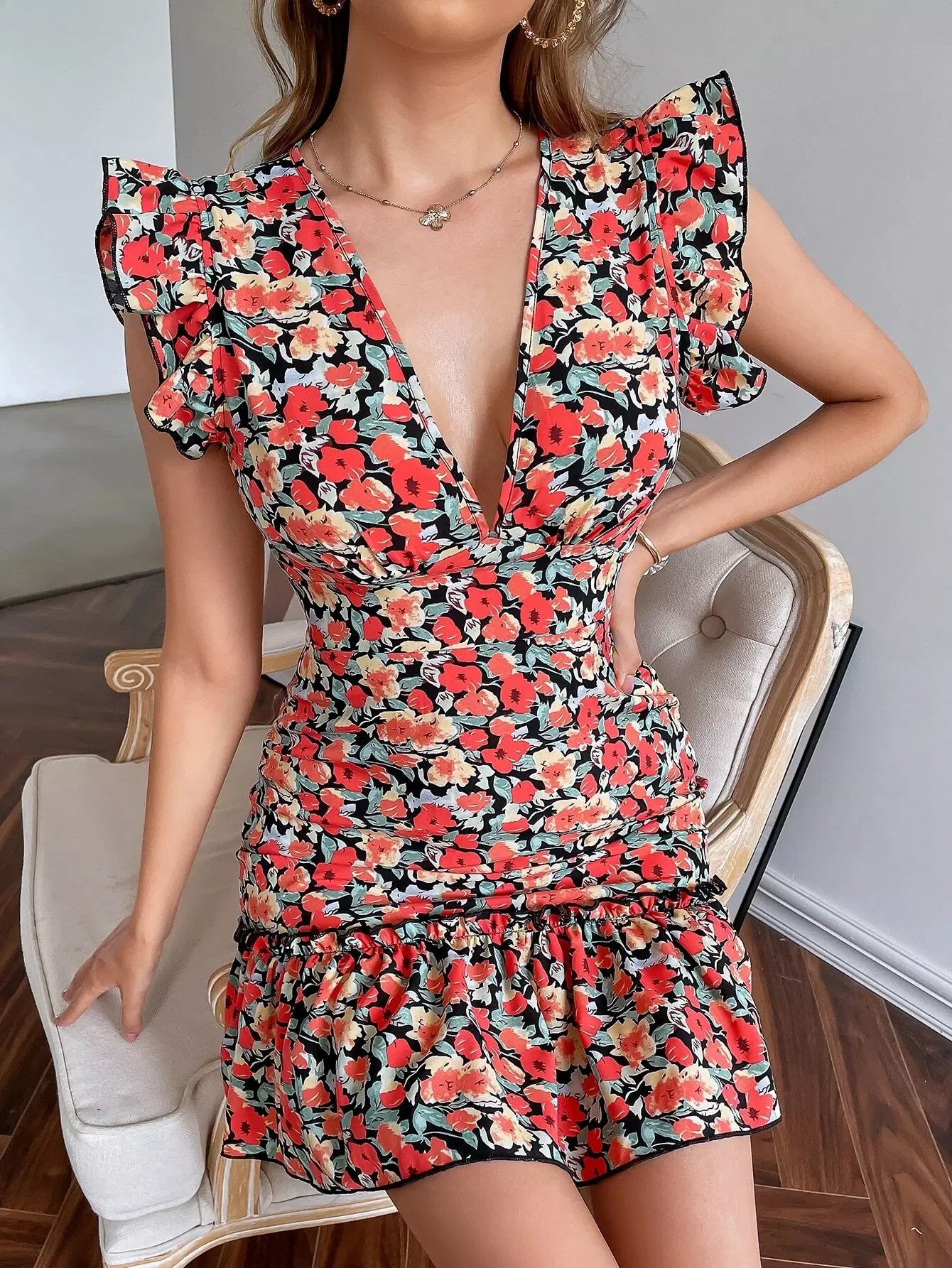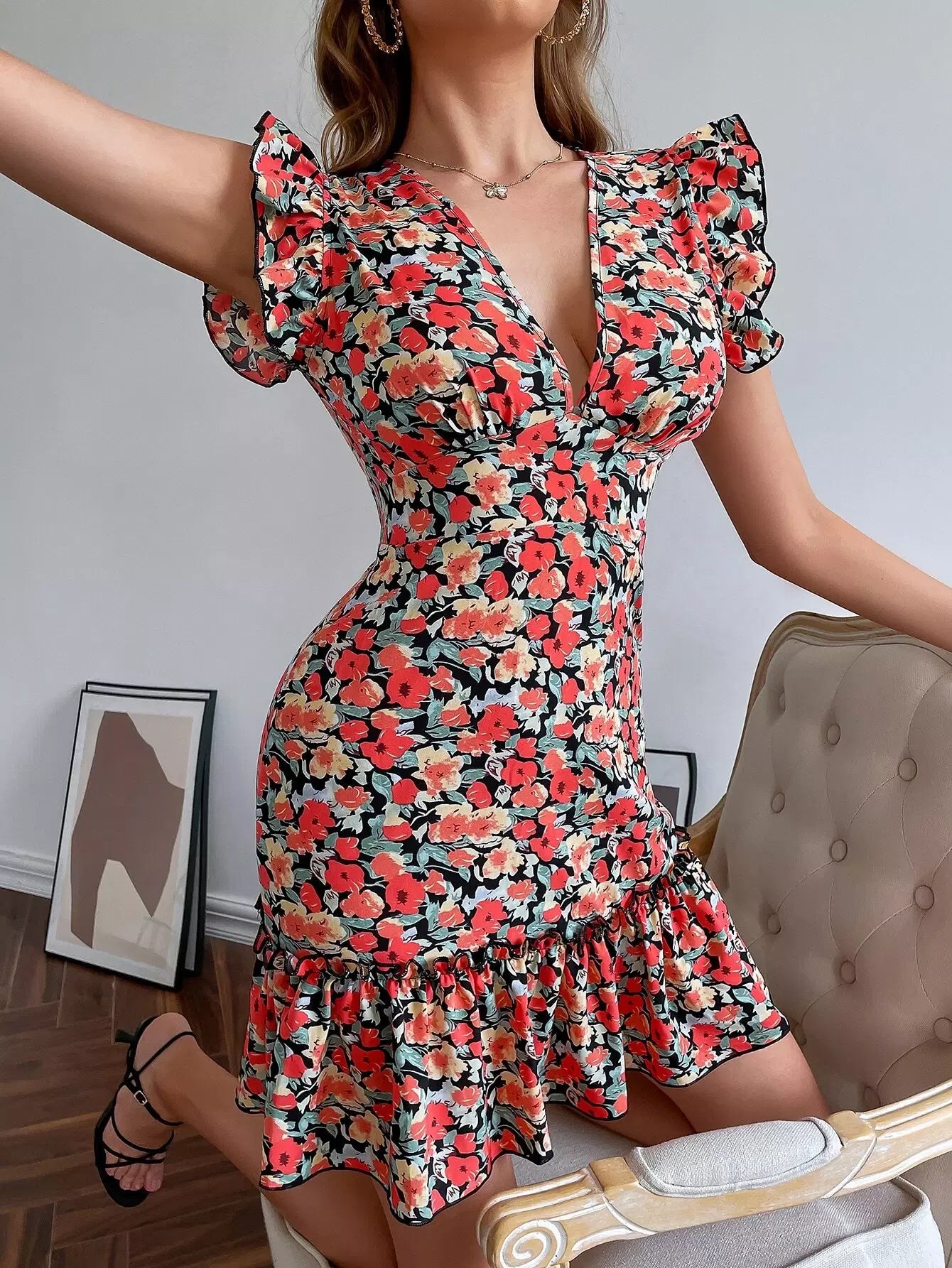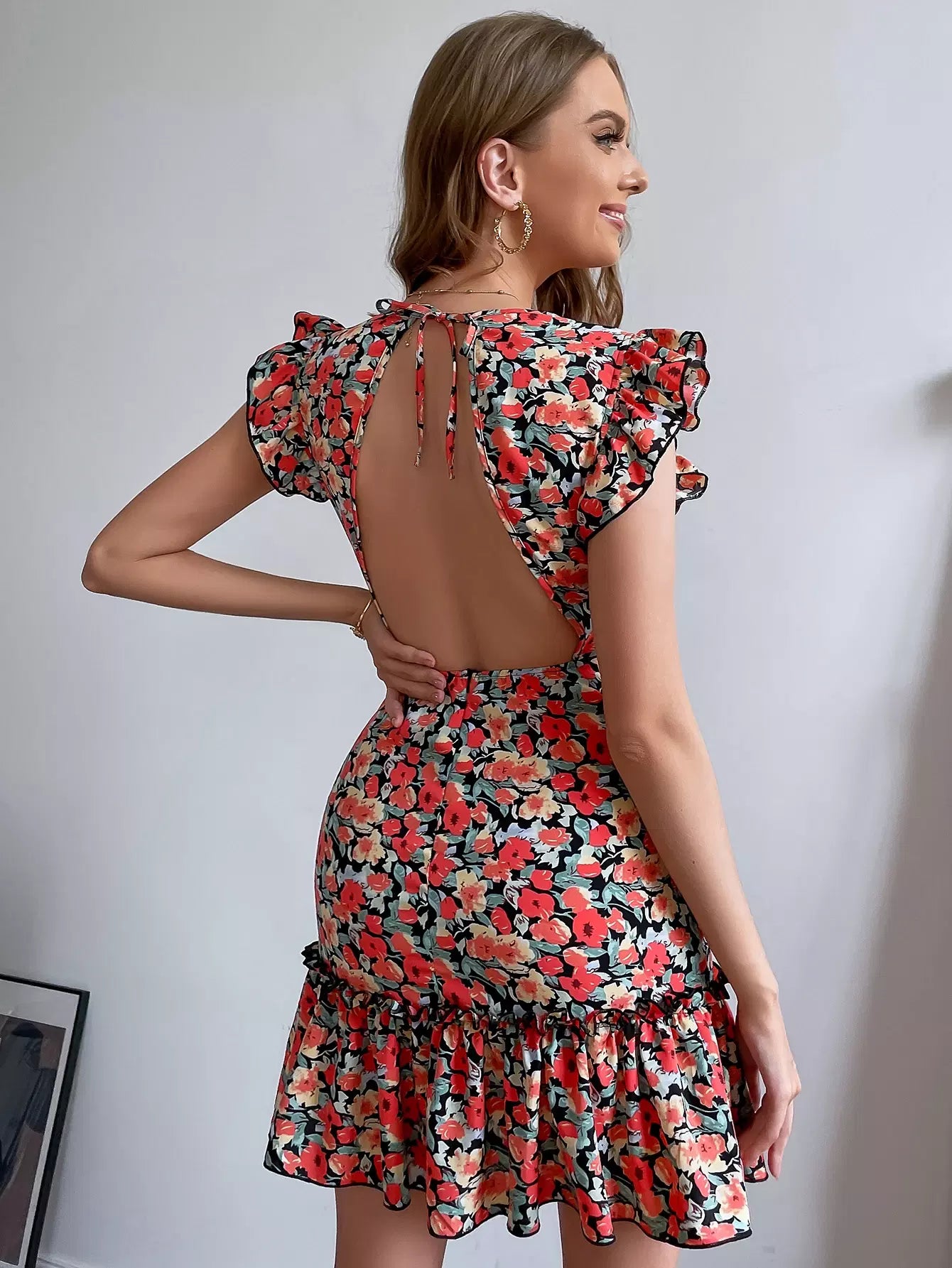 فستان ضيق مكشوف الظهر ومزين بكشكشة ومزين بزهور