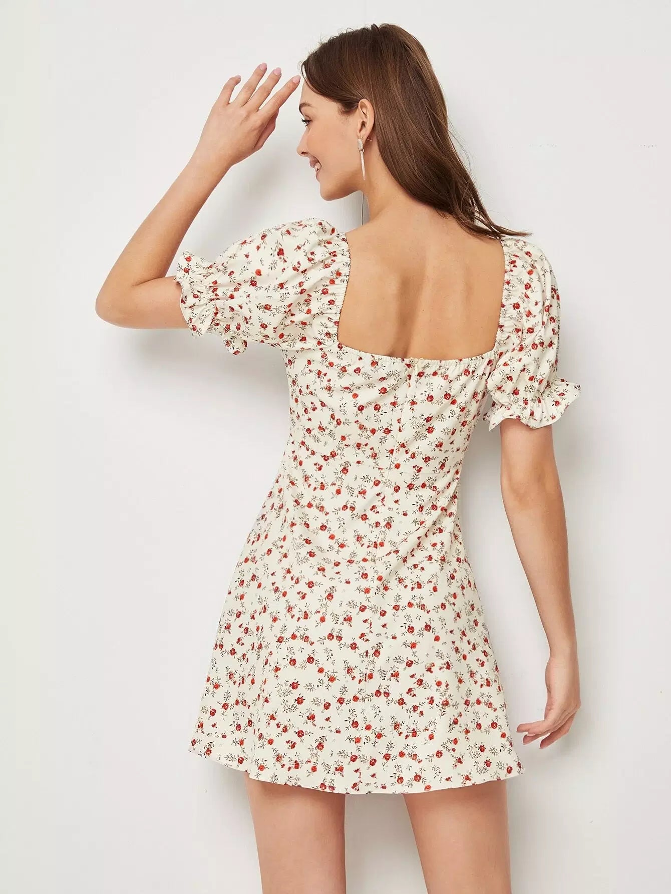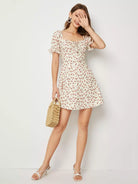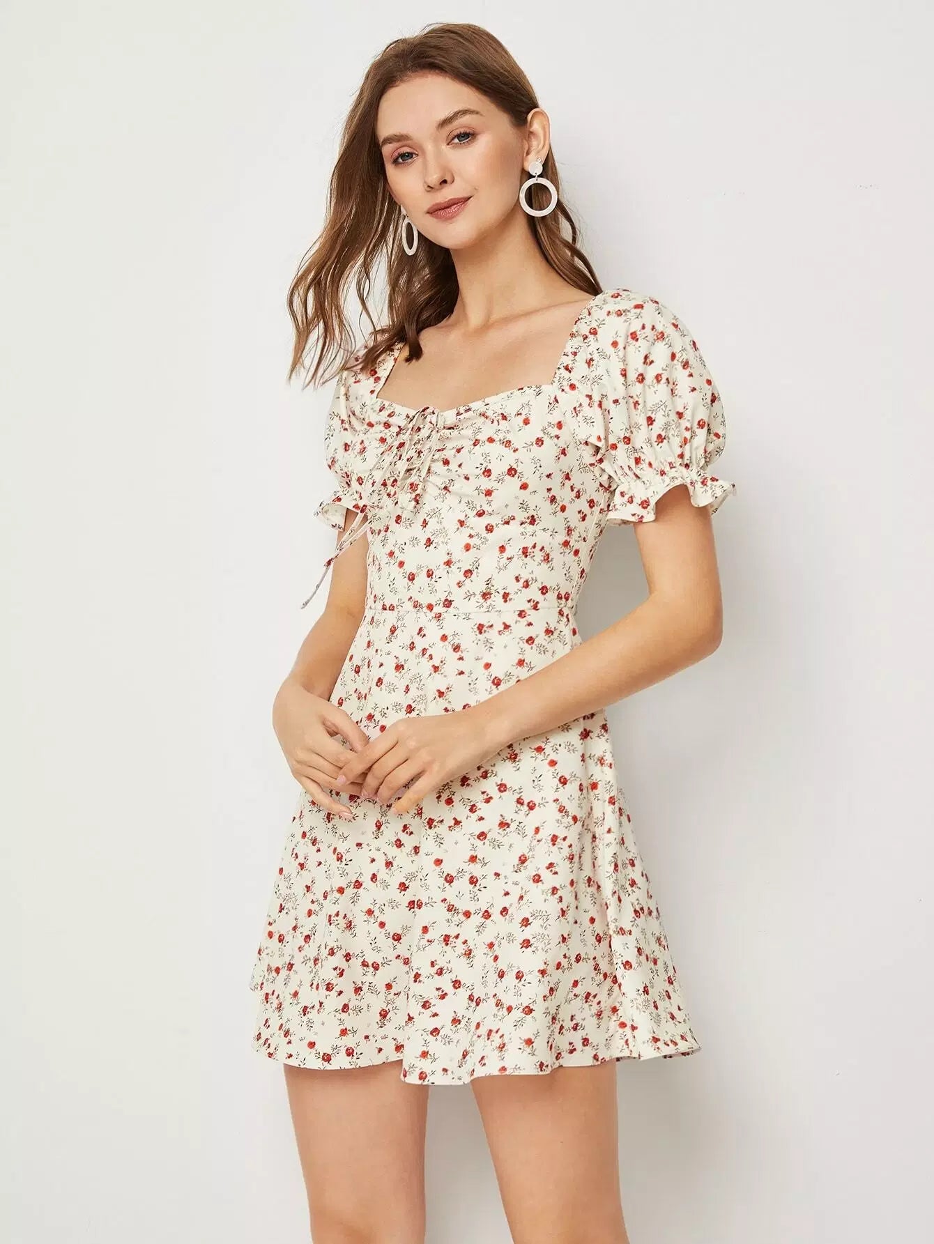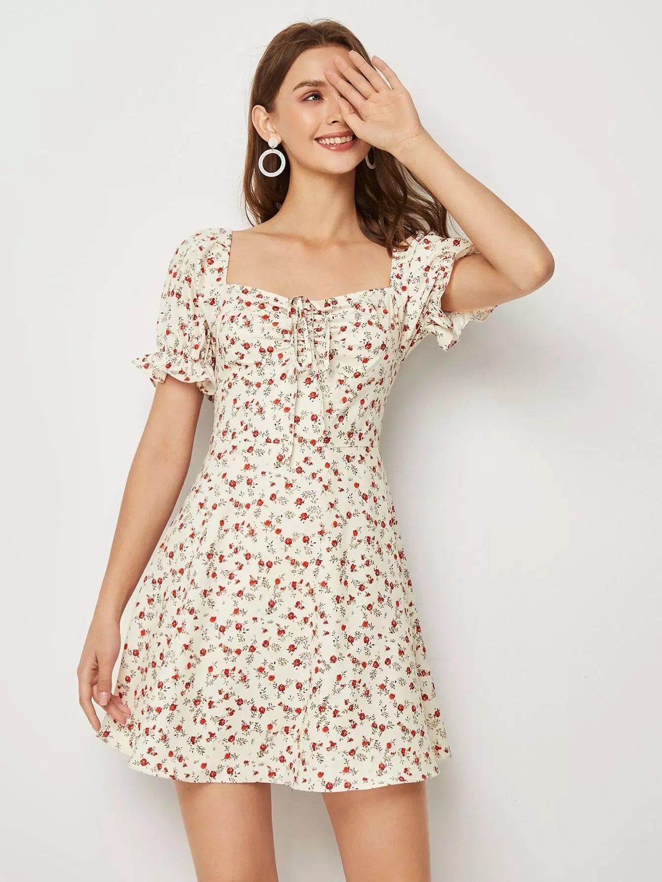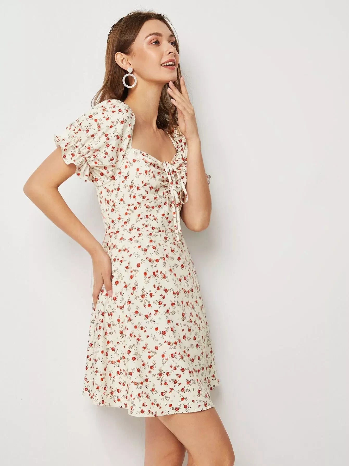 فستان بأكمام منفوشة بعقدة أمامية مزين بالورود