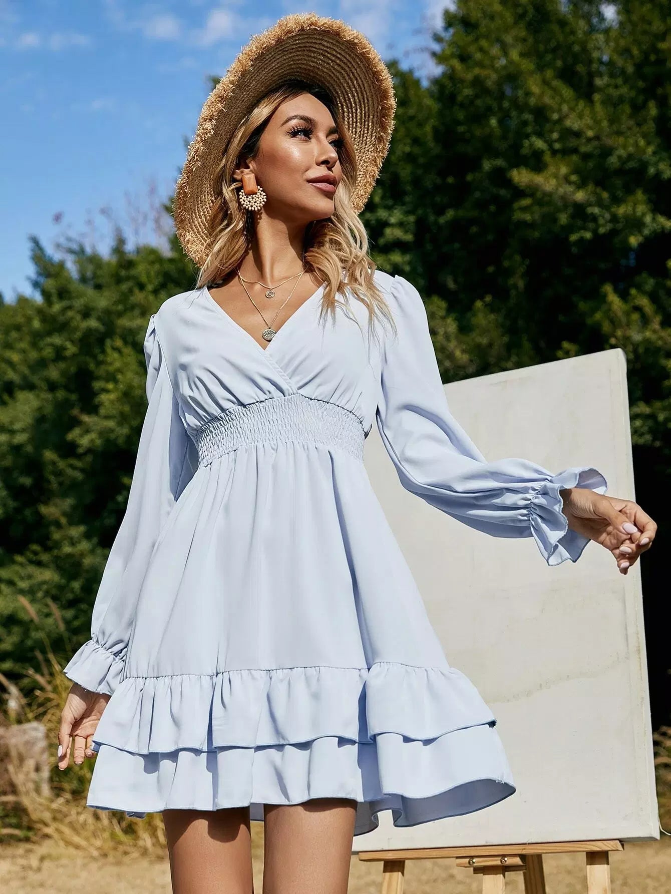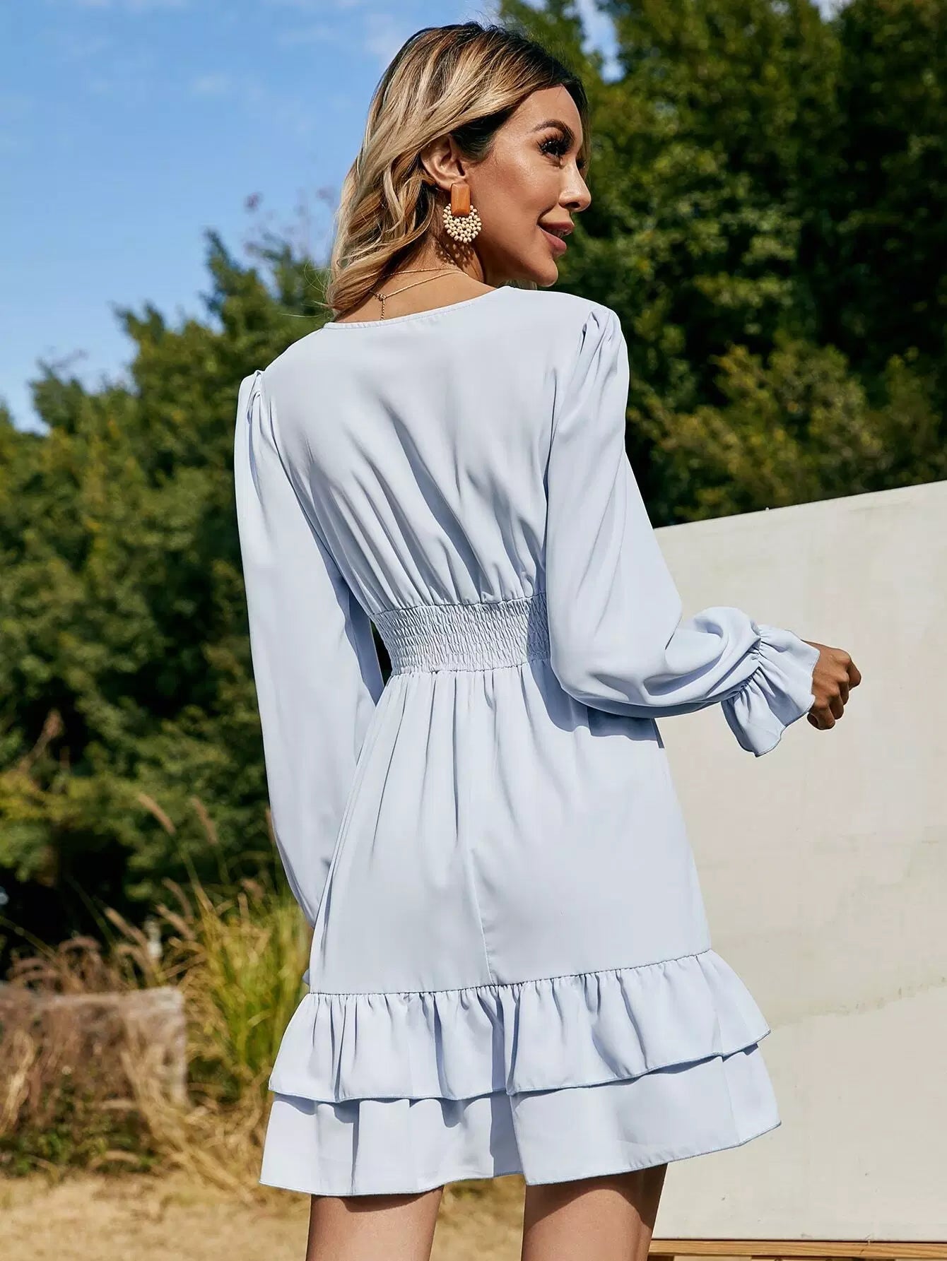 فستان ذو أكمام منفوشة بأكمام كشكش بحافة بطبقات