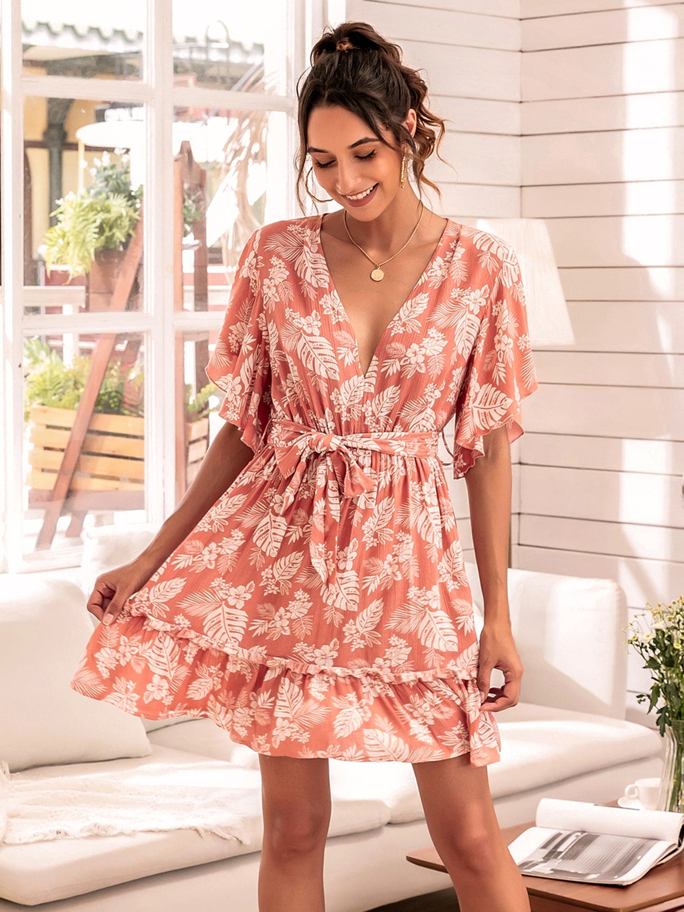 Flutter Sleeve Ruffle Hem Belted Floral Dress