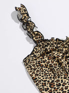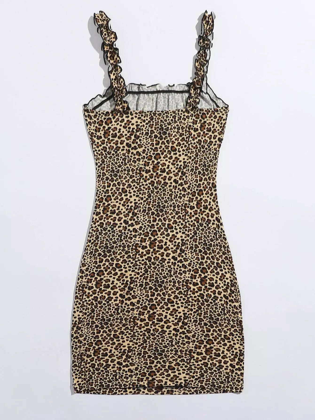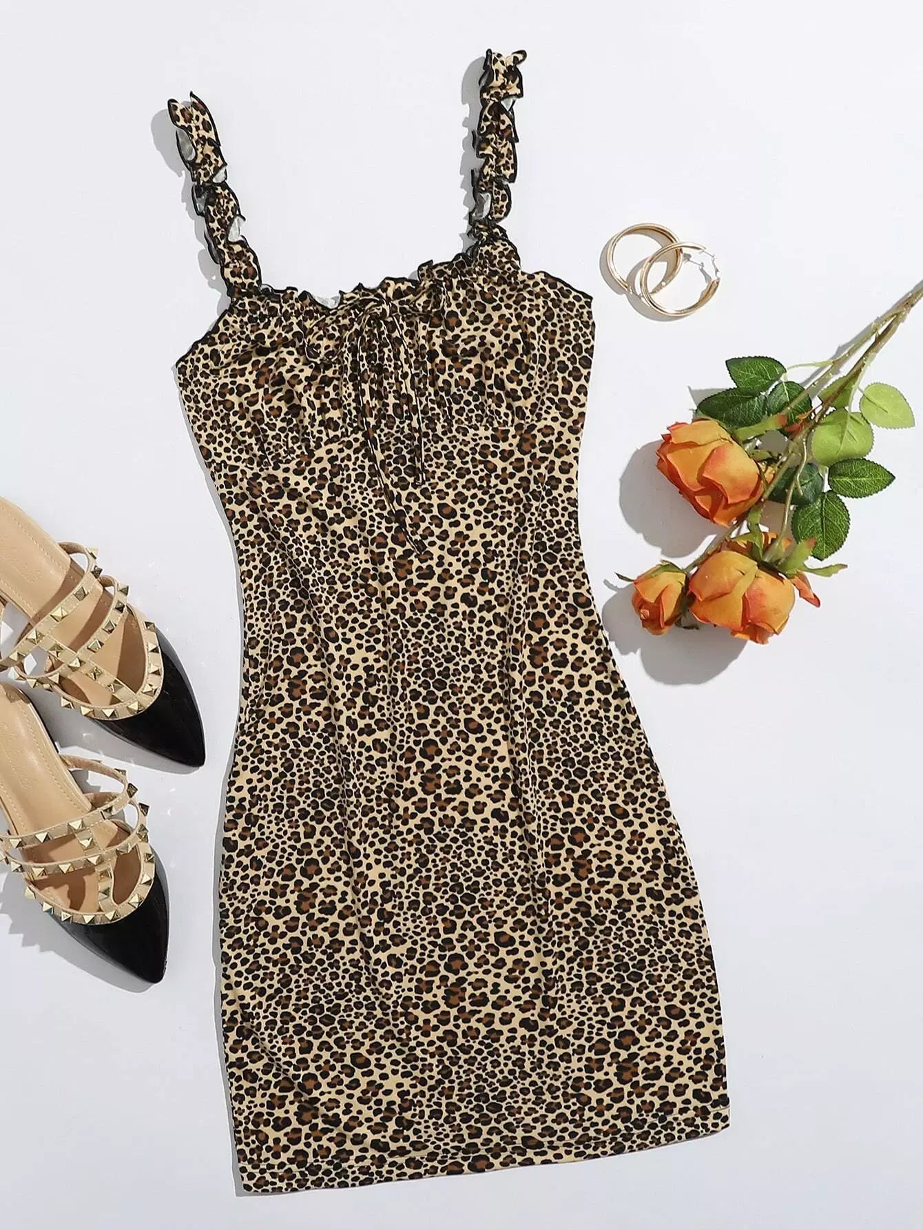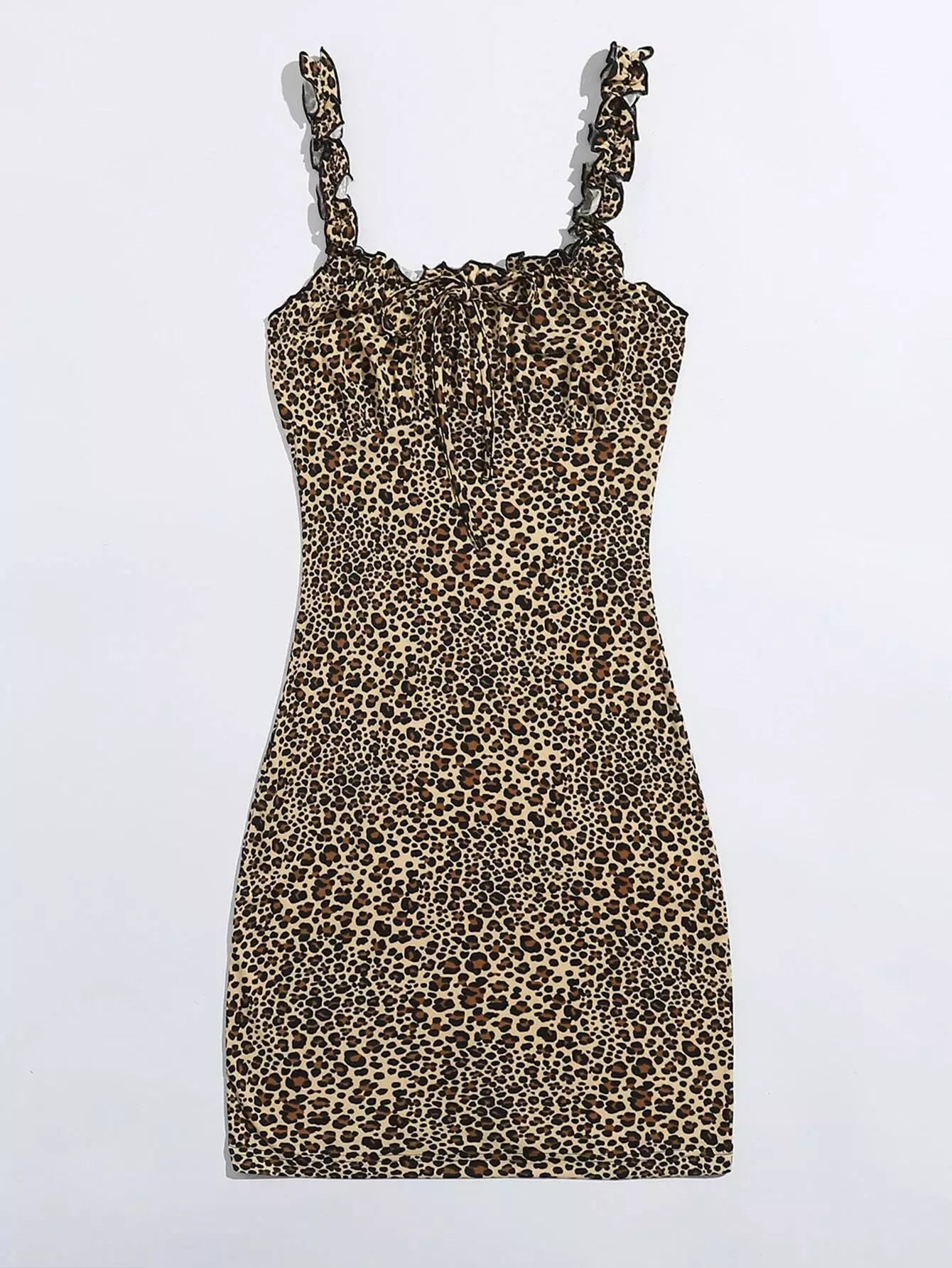 فستان كشكش بحزام بحواف كشكش بحزام عقدة أمامية مكشكشة من الأمام على الصدر بنقشة جلد النمر