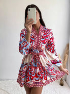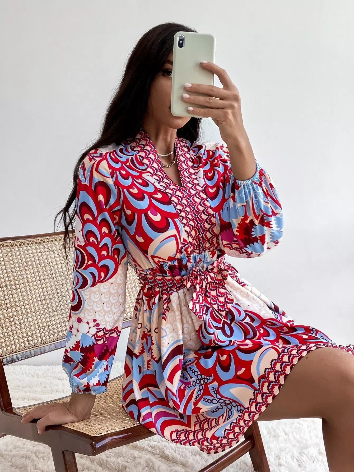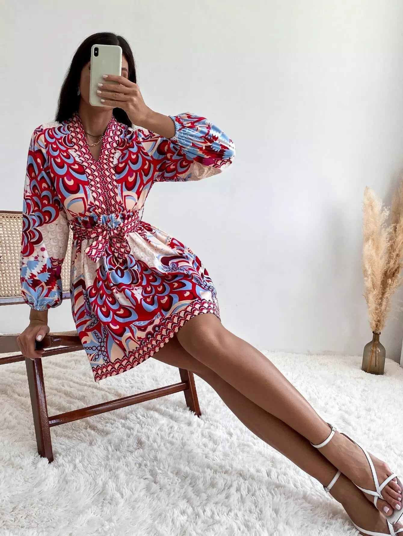 فستان بأكمام فانوس وطبعة جرافيك بدون حزام