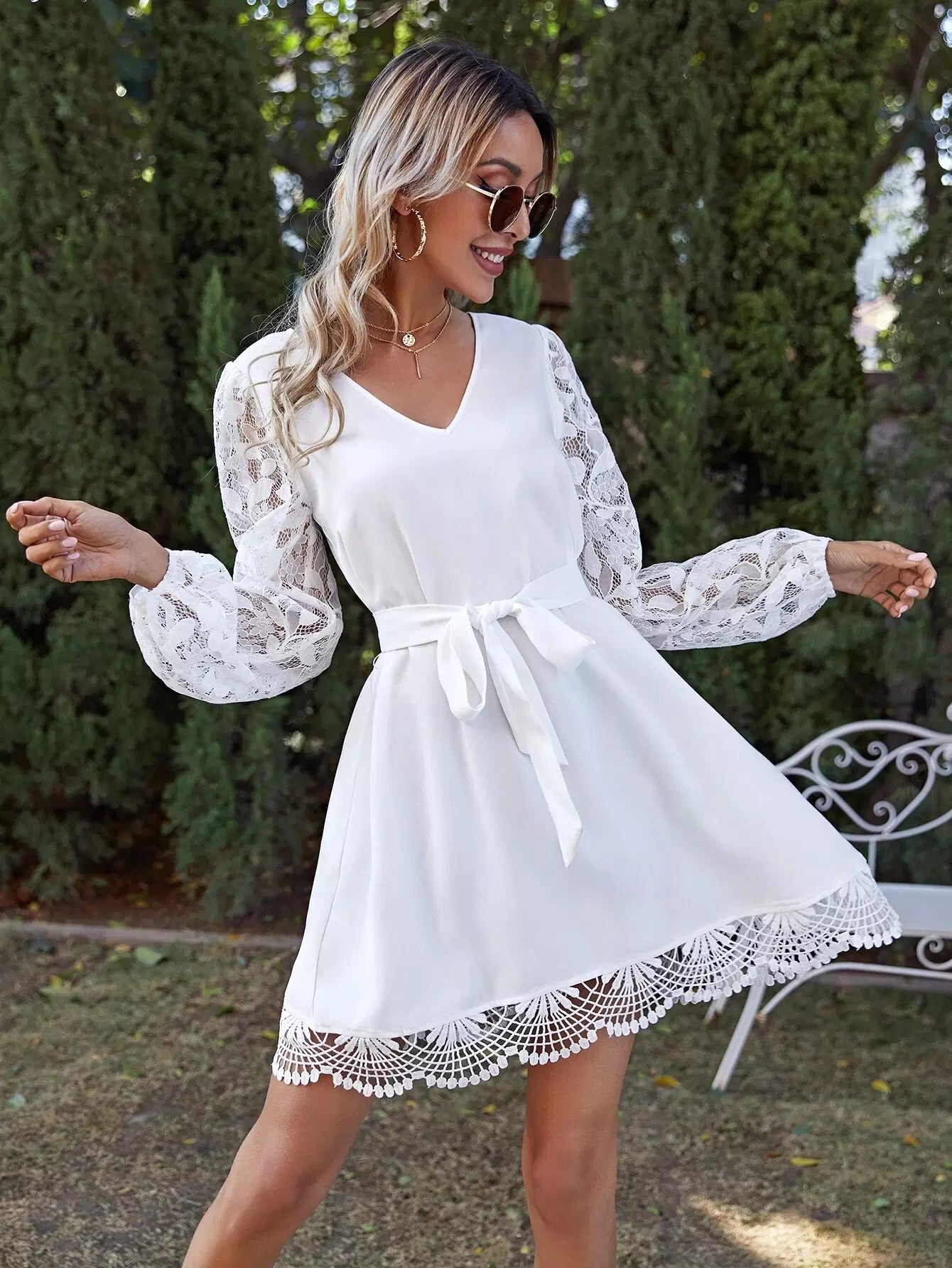 فستان ذاتي بأكمام من الدانتيل وحاشية بدون حزام