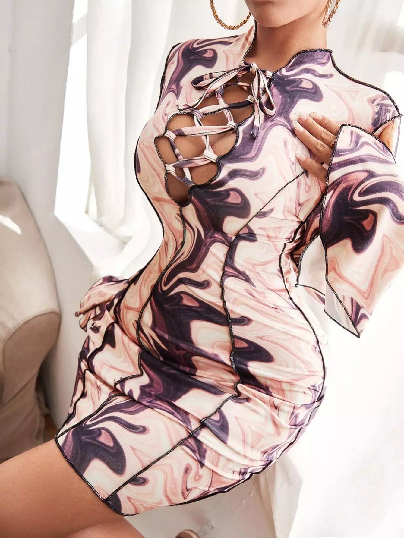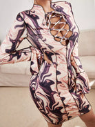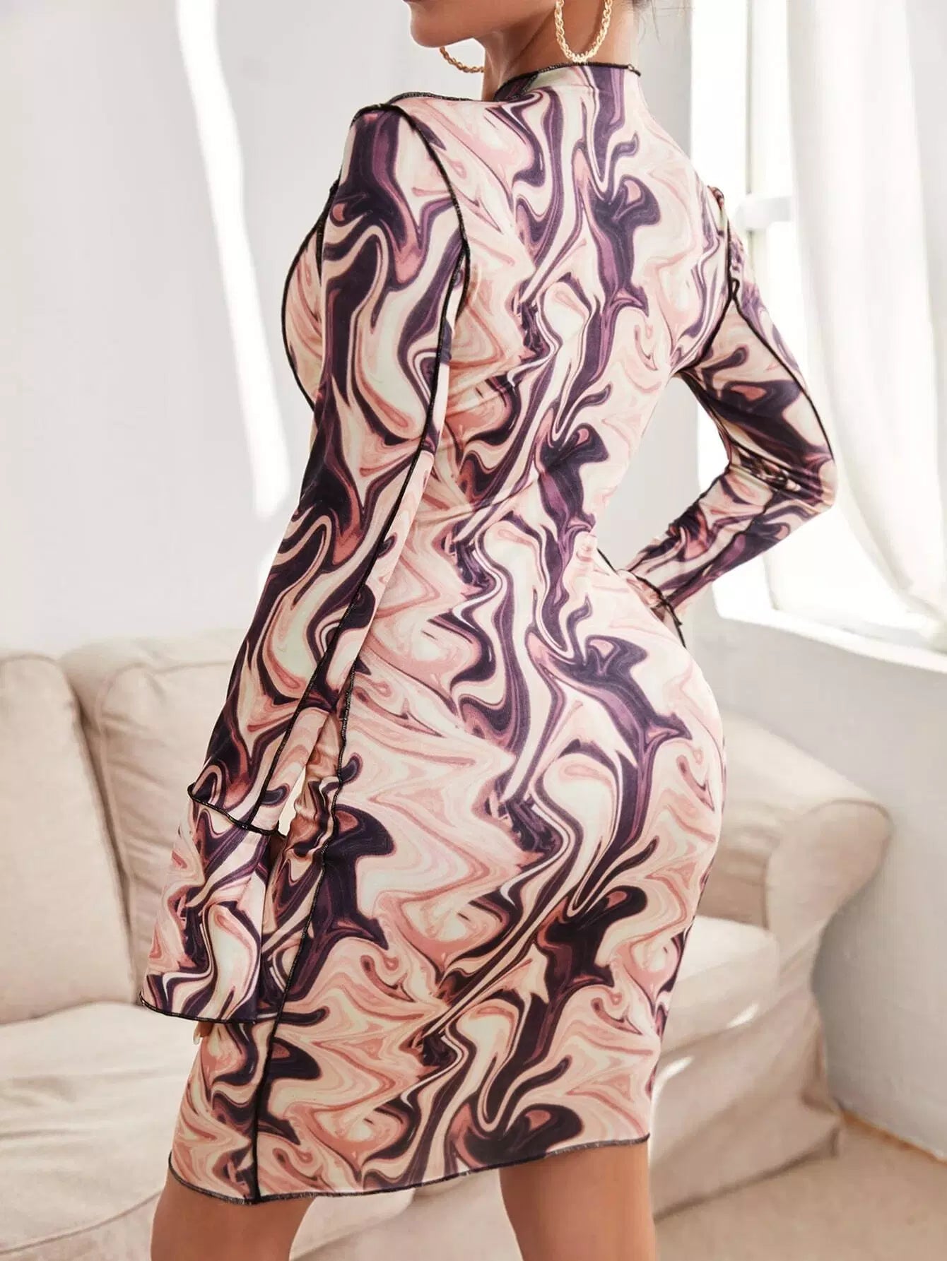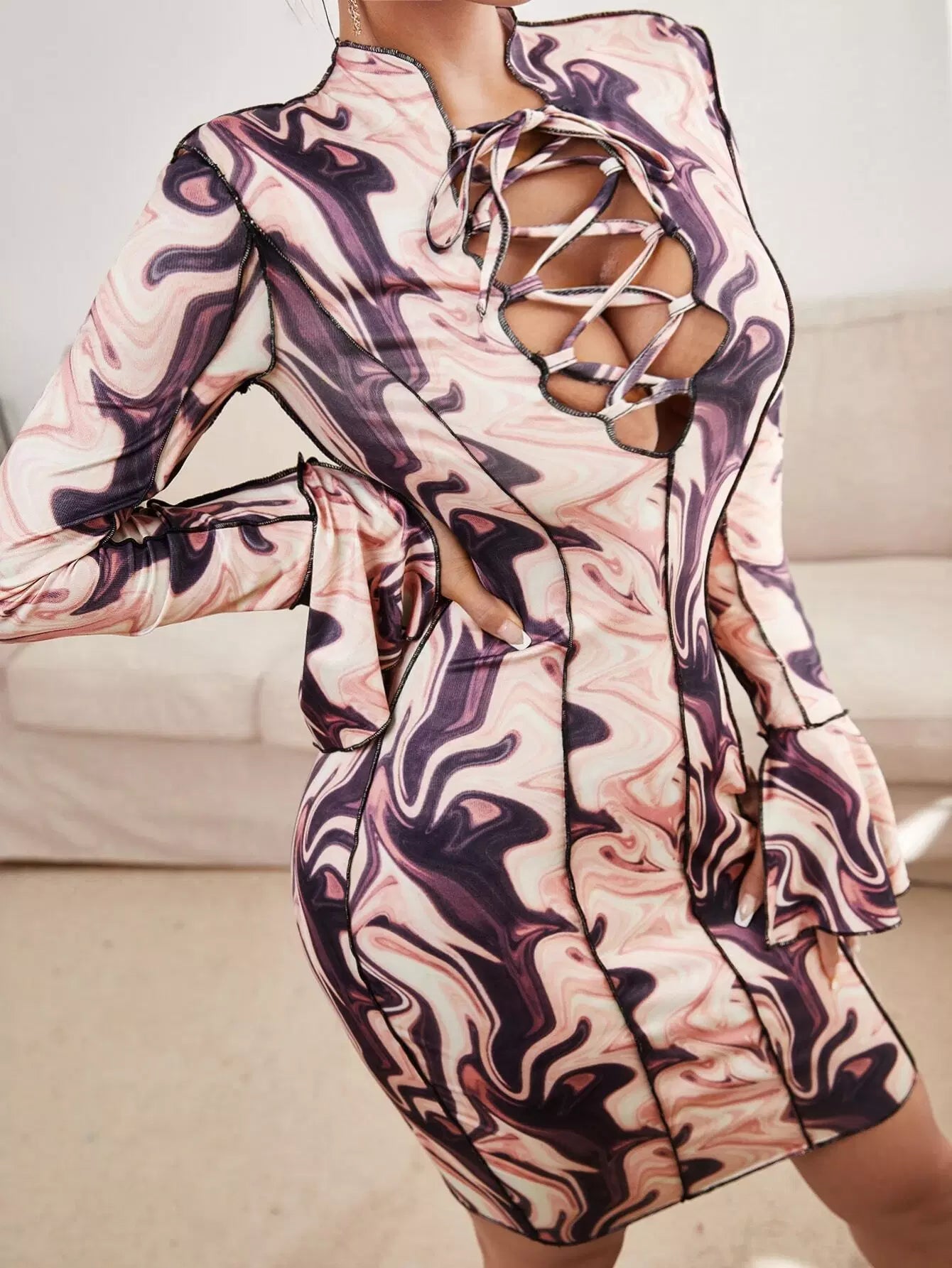 فستان مزين بطبعات رخامية من أعلى بخياطة رخامية من الأمام بفتحة من الأمام بفتحة من الأمام