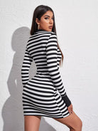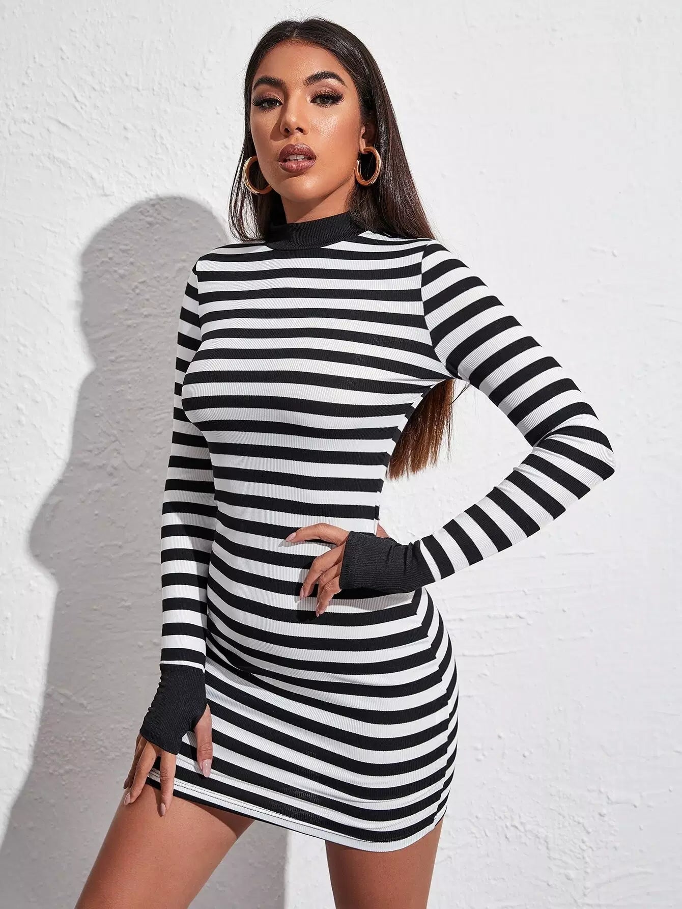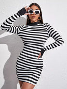 فستان مخطط بقصّة برقبة وهمية بفتحة إبهام مخططة