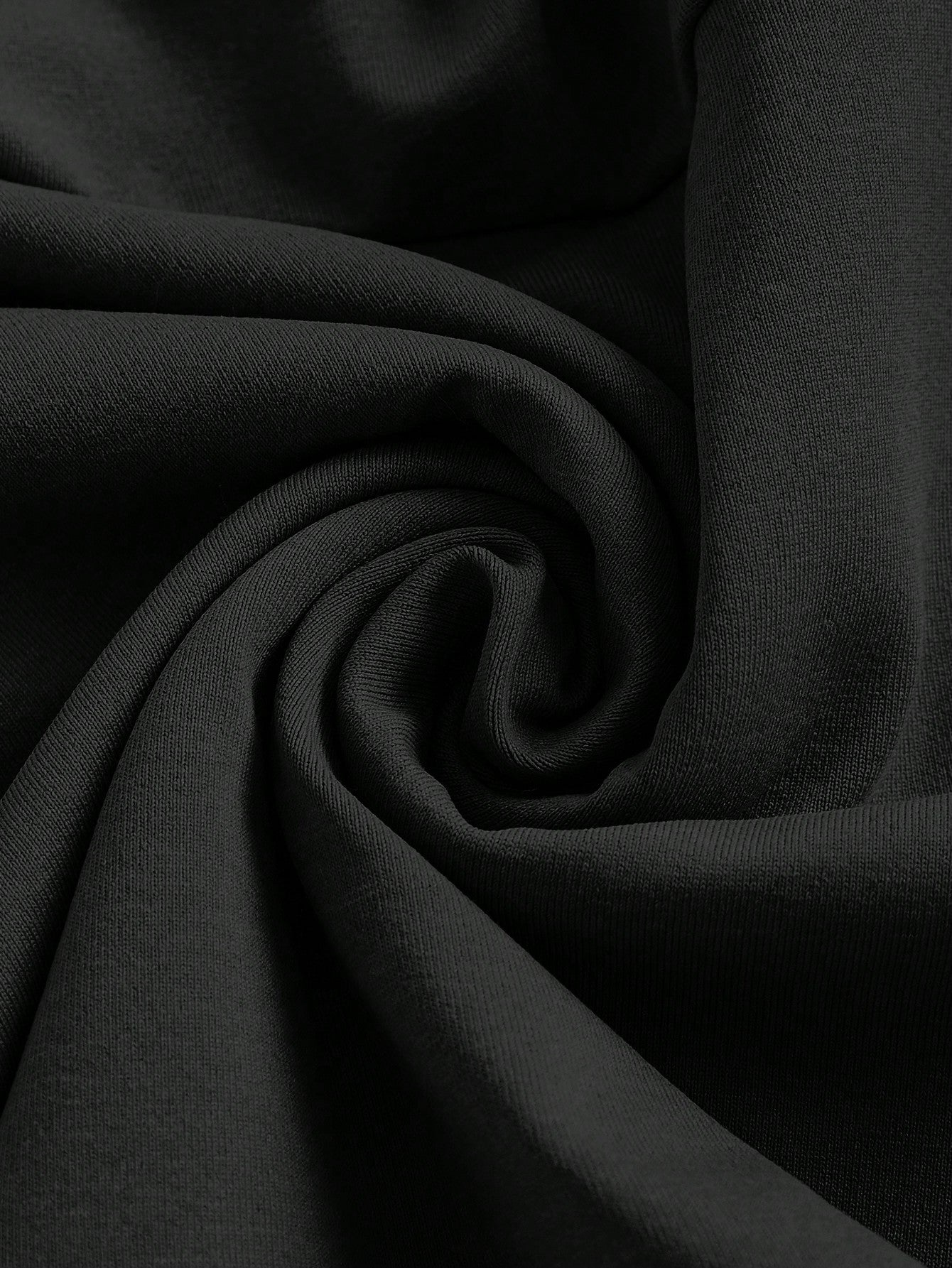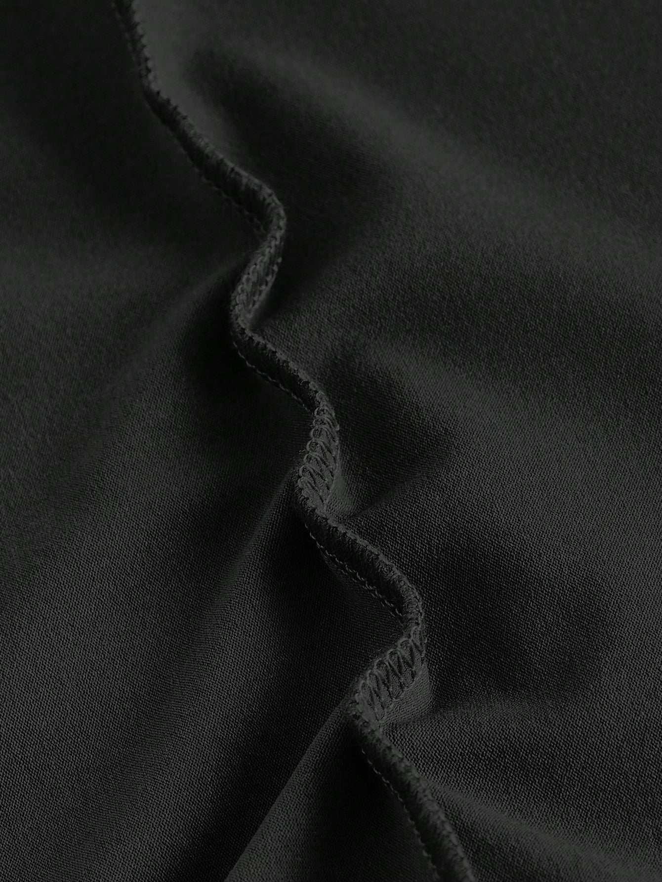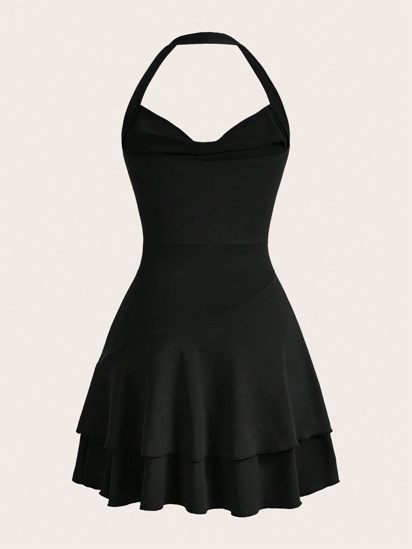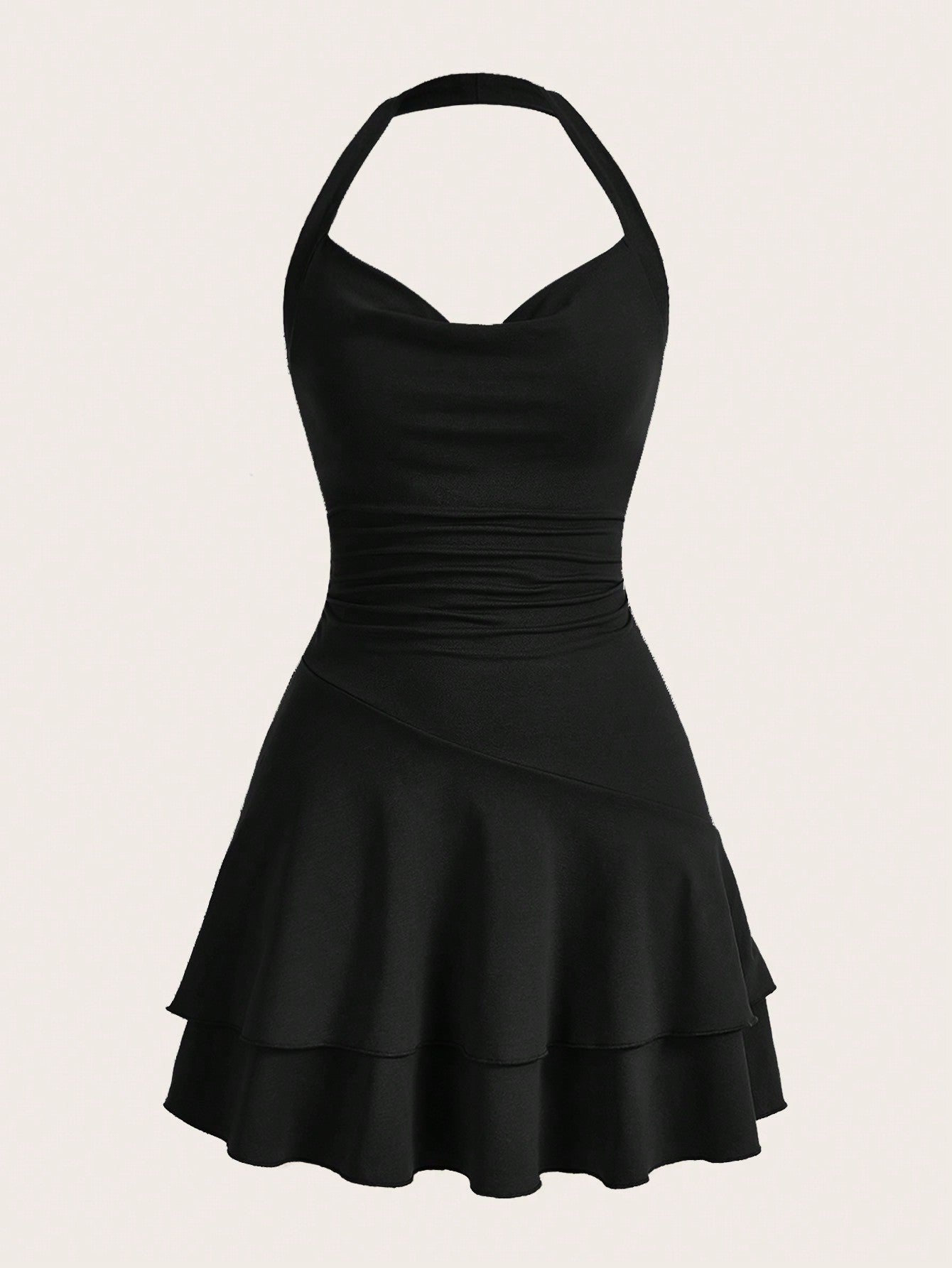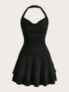فستان قصير أسود بتصميم عصري، بياقة منسدلة وحافة مكشكشة متعددة الطبقات، وياقة هالتر