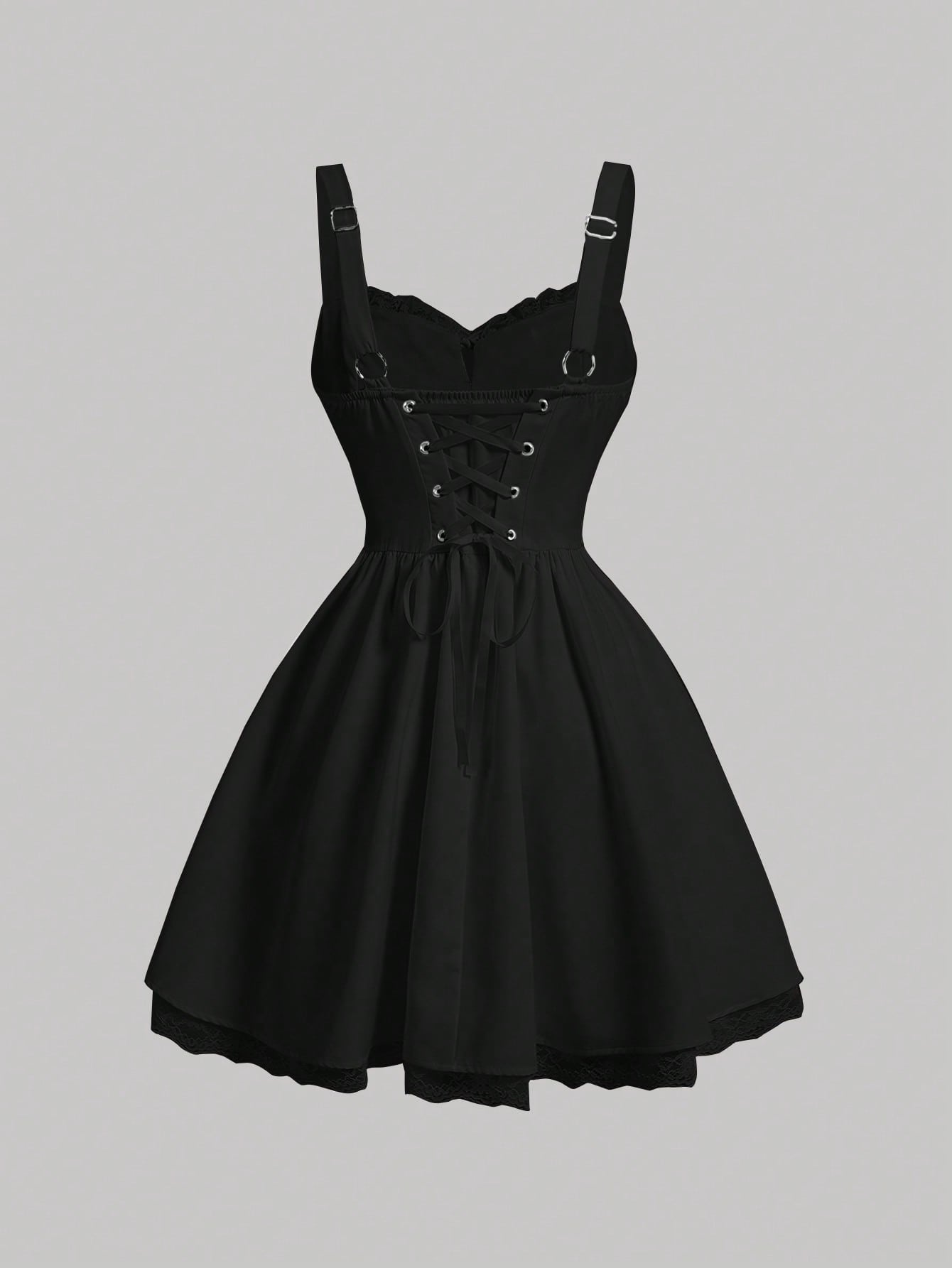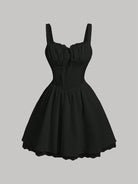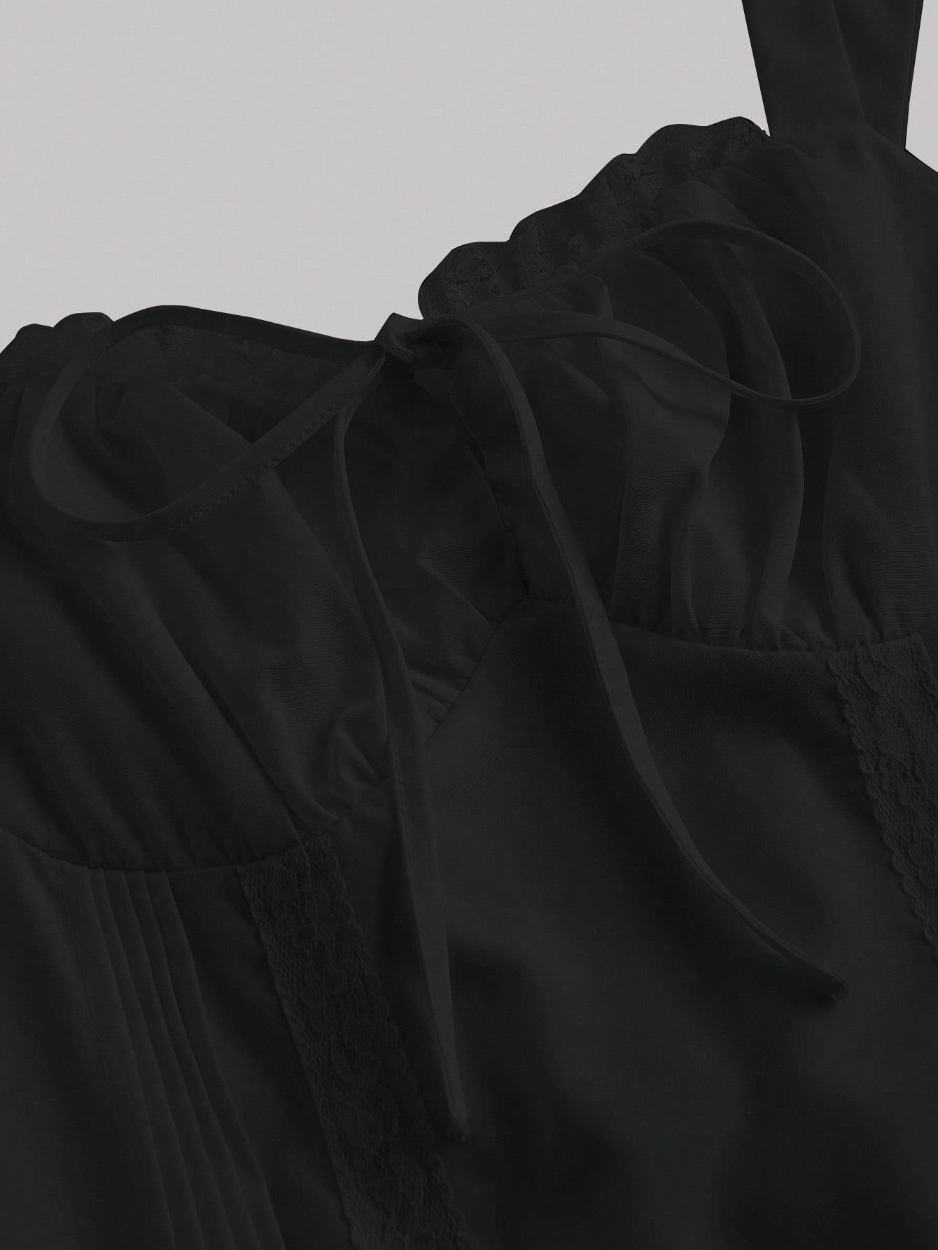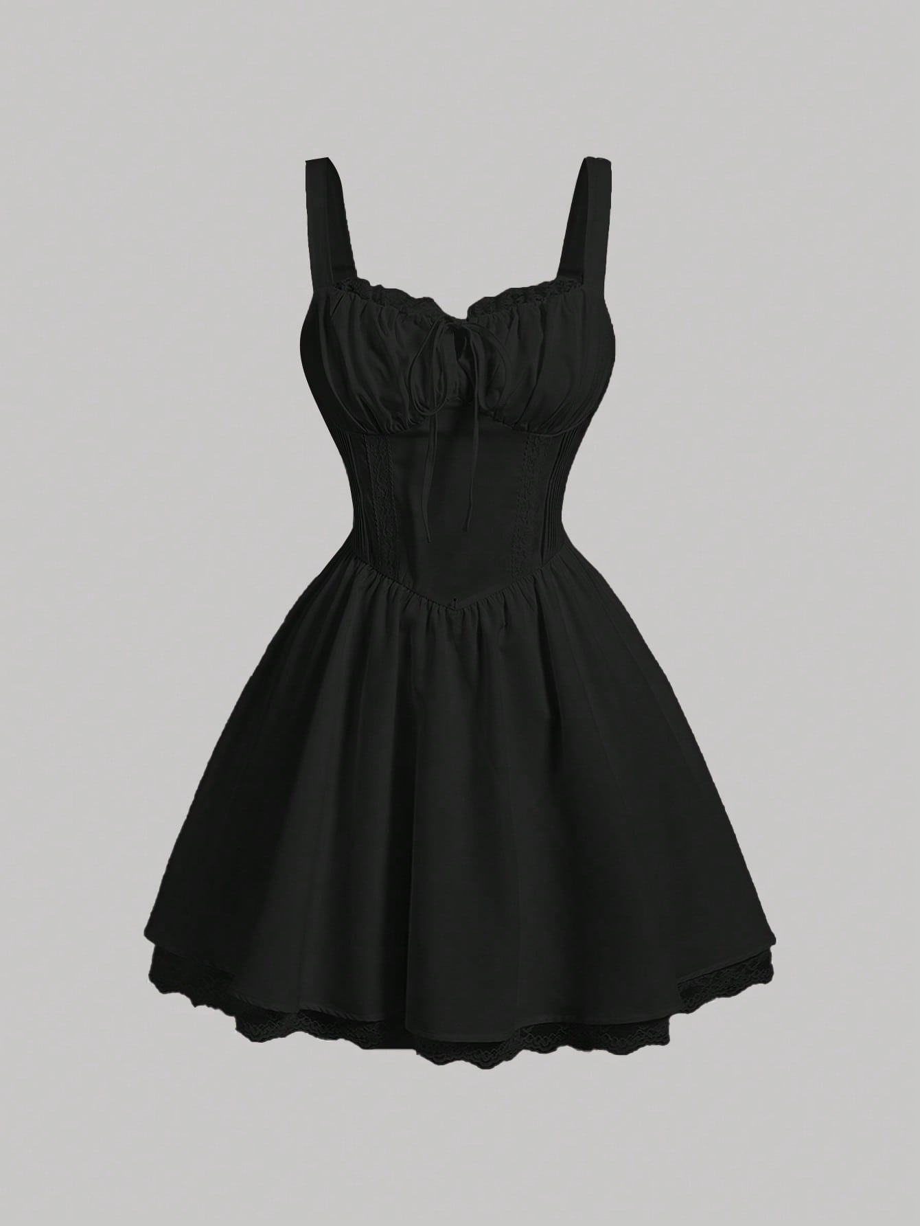 فستان قصير بدون ظهر مربوط، مزين بلوحة أمامية بيضاء متباينة من الدانتيل.