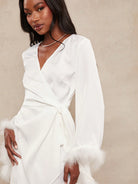 NYA SZN Dress Feather Trim Long Sleeve Wrap Dress Wedding Bridal Mini Dresses Summer Festivals Feather