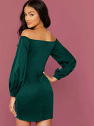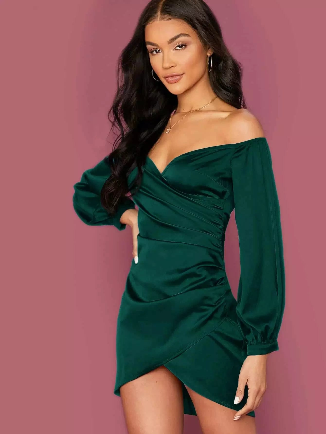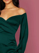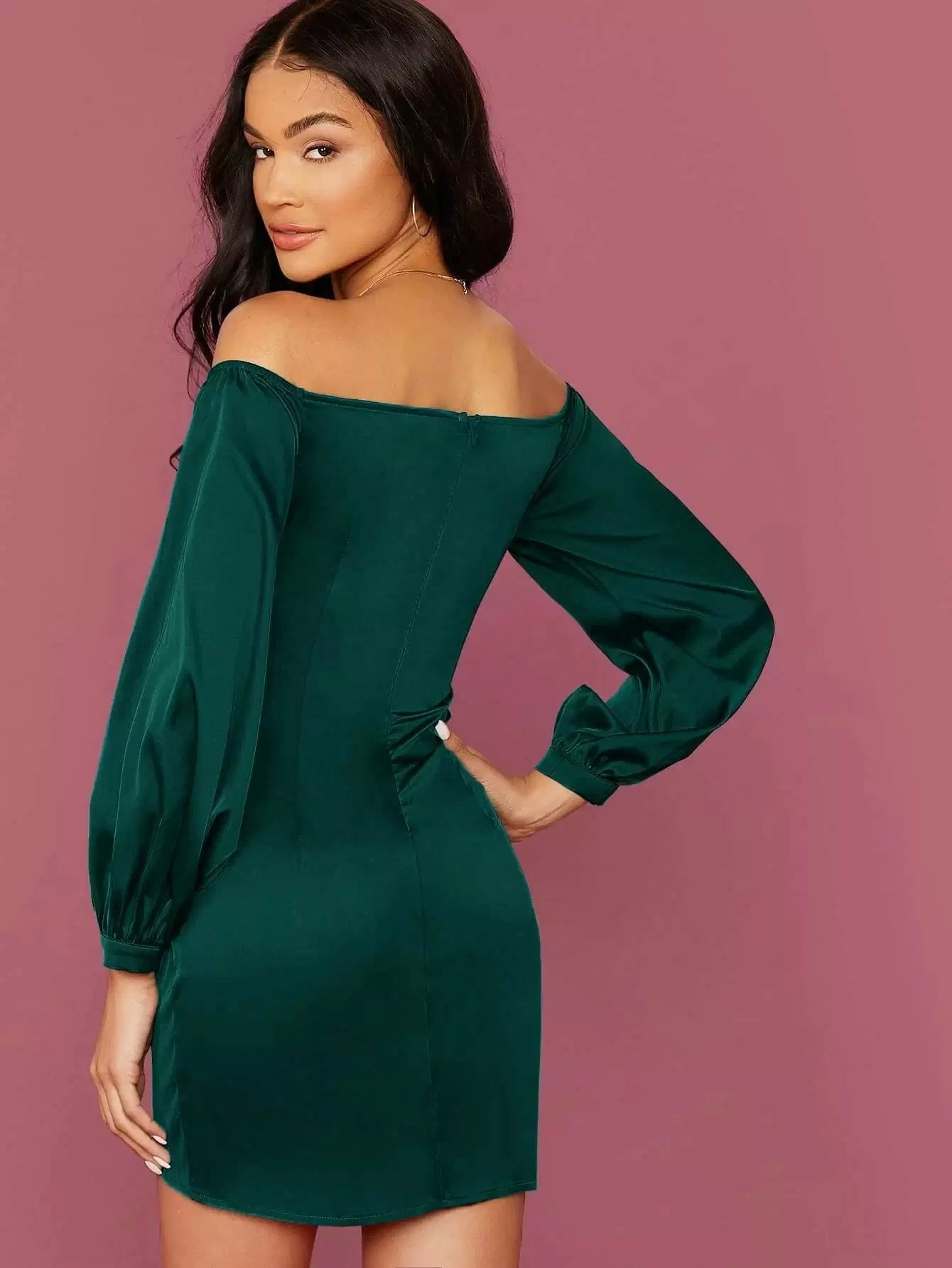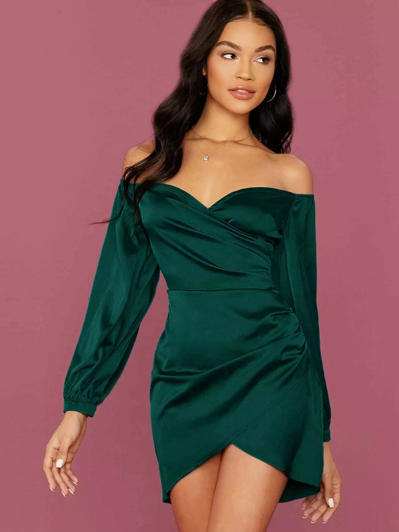 فستان ساتان بحافة غير متناظرة مكشوف الكتفين