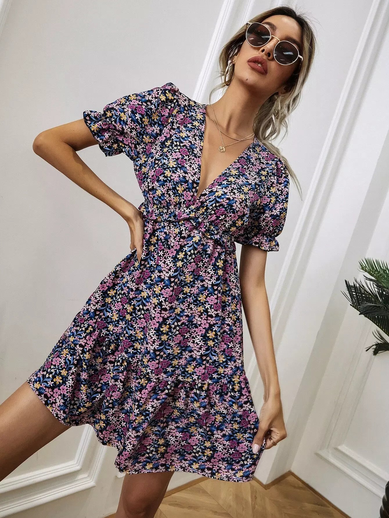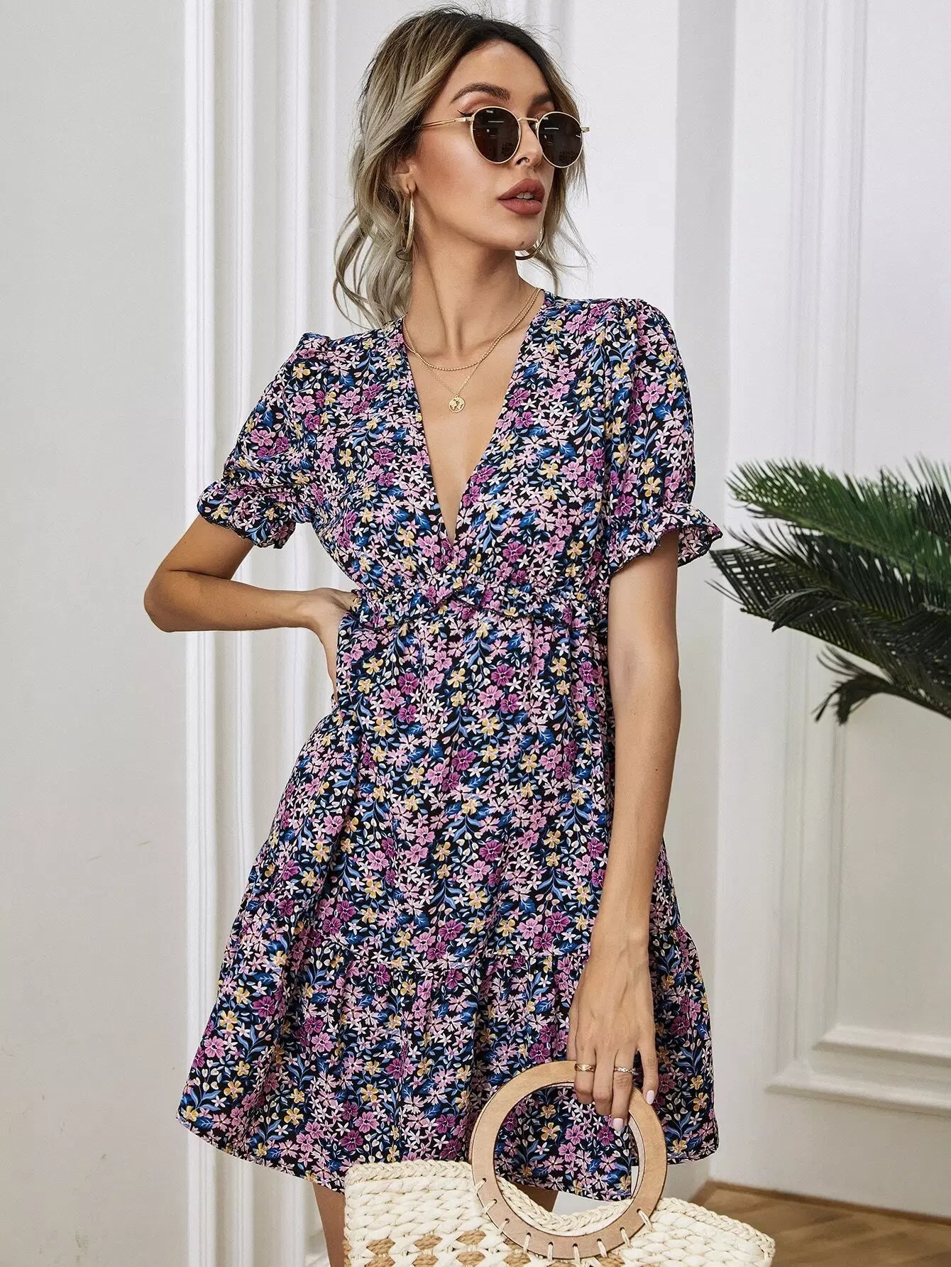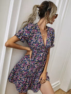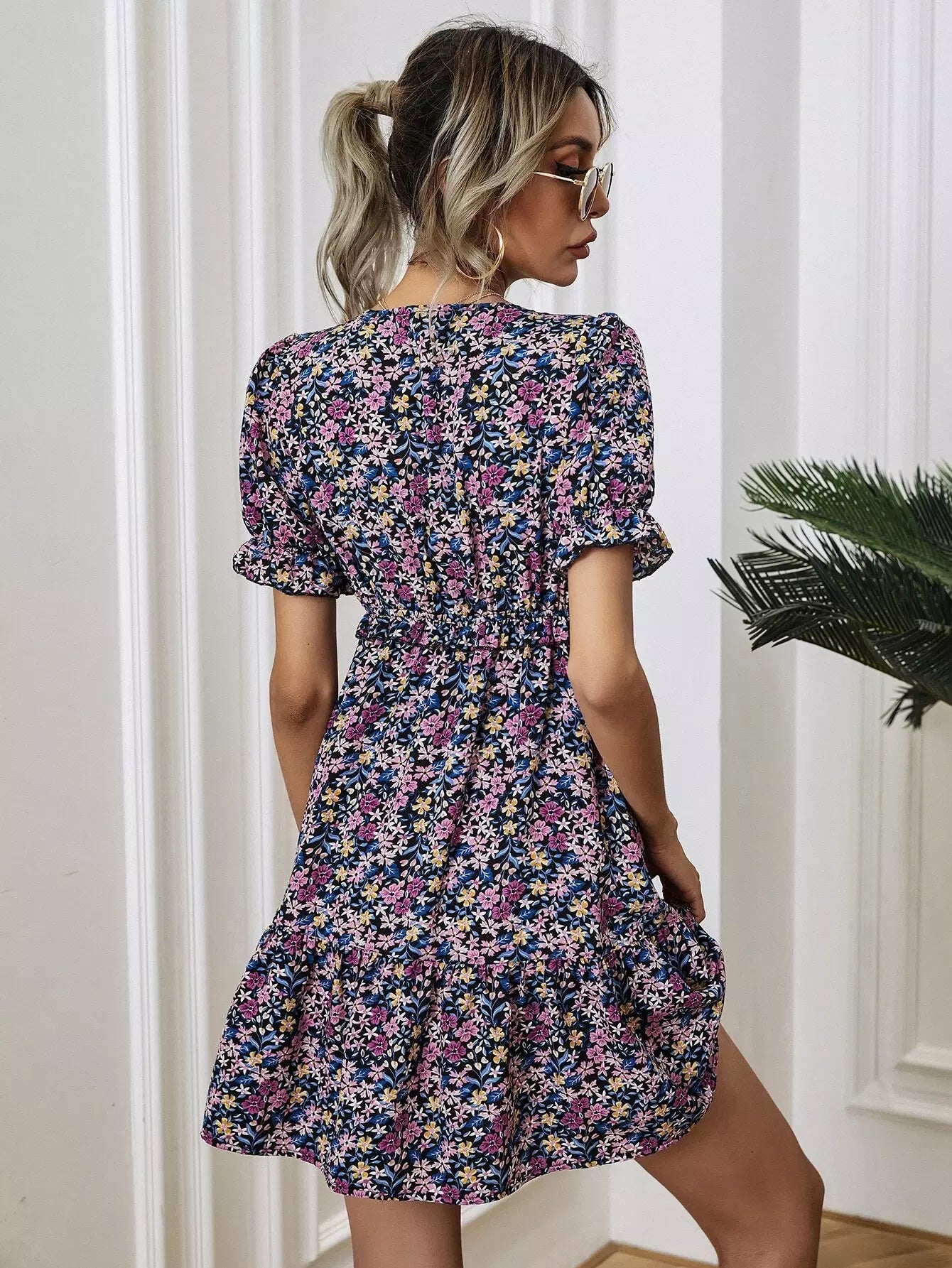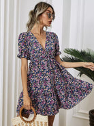 فستان برقبة متدلية بفتحة عنق واسعة بقصّة زهرية على شكل حرف A