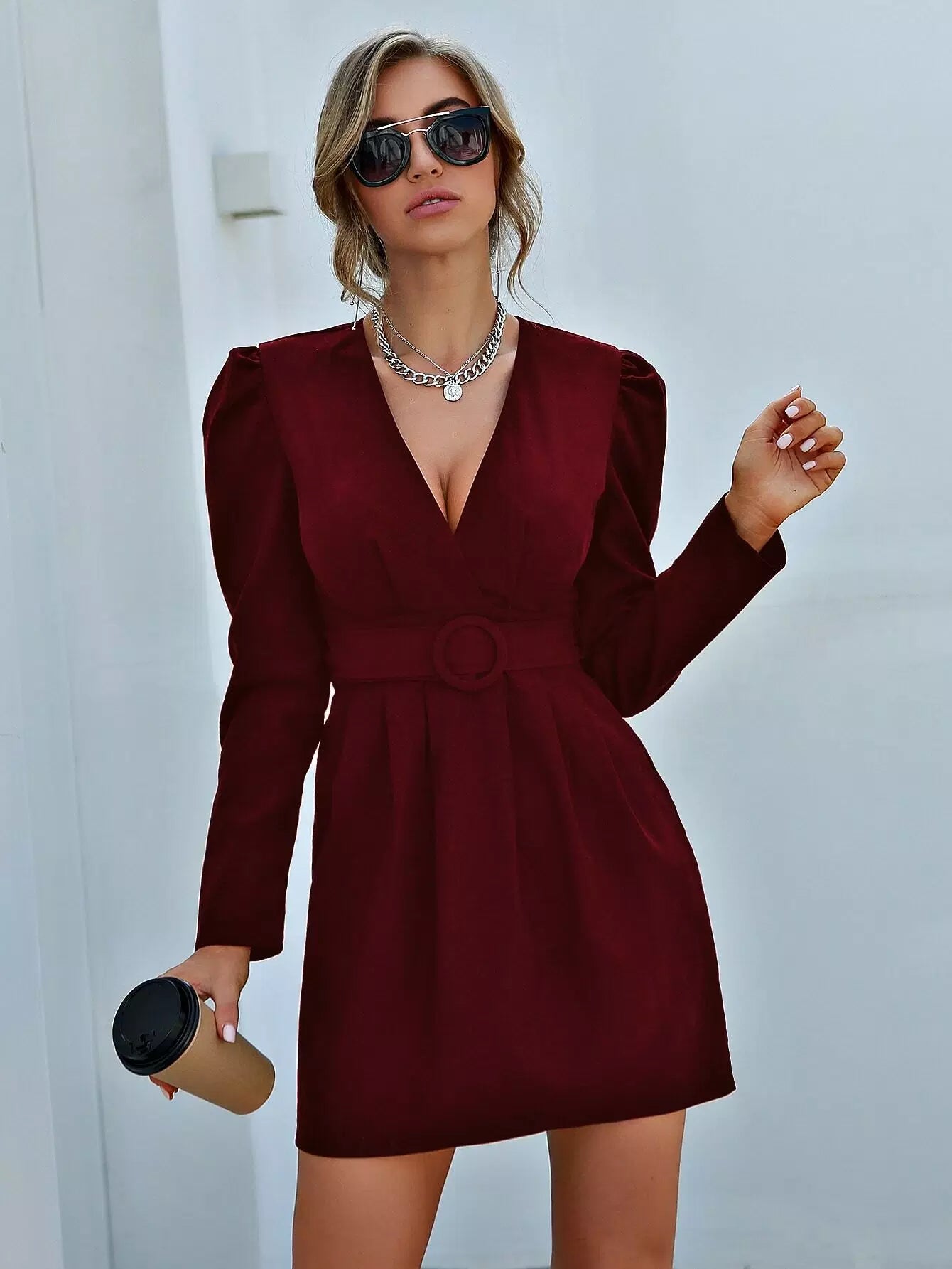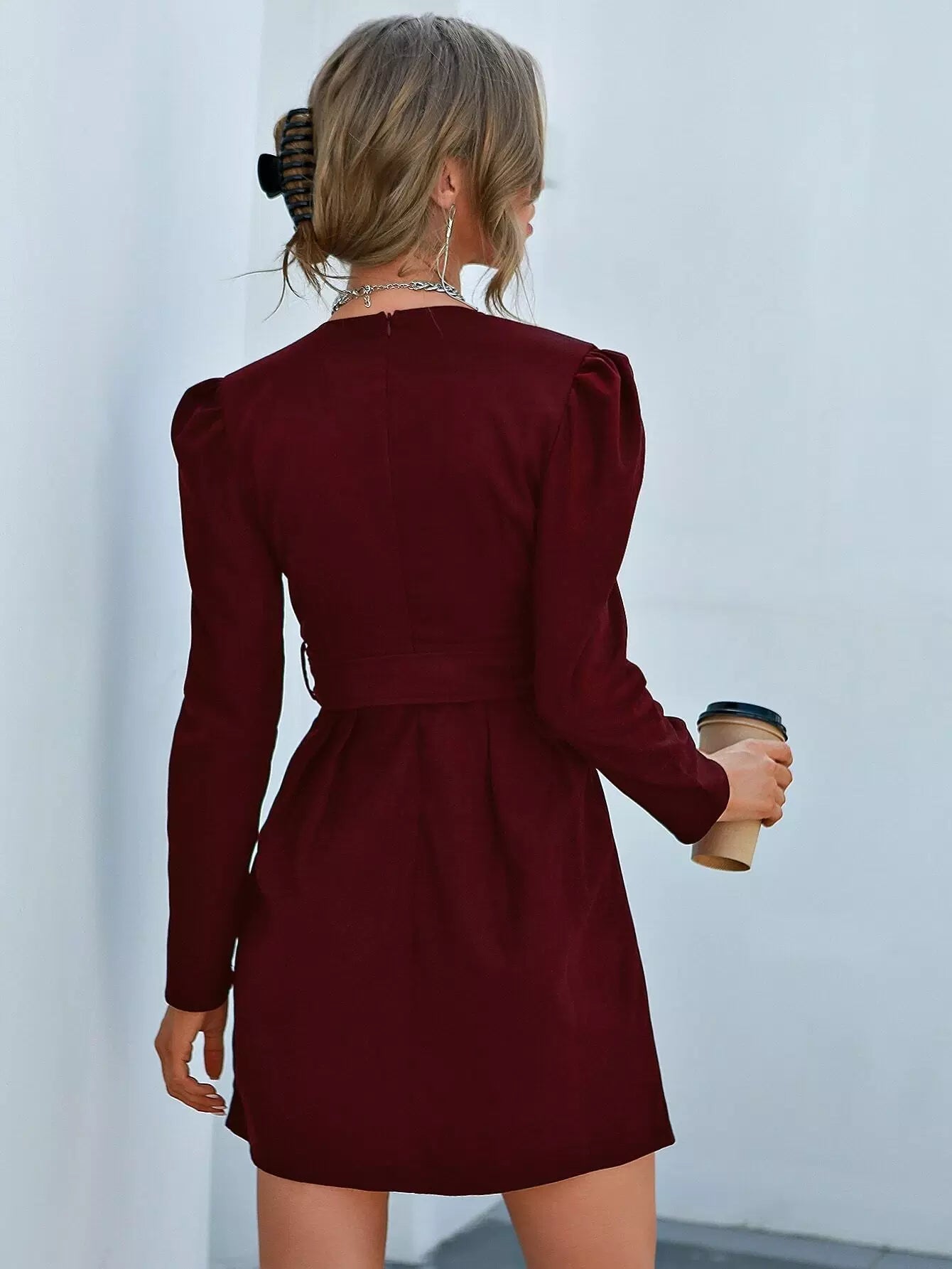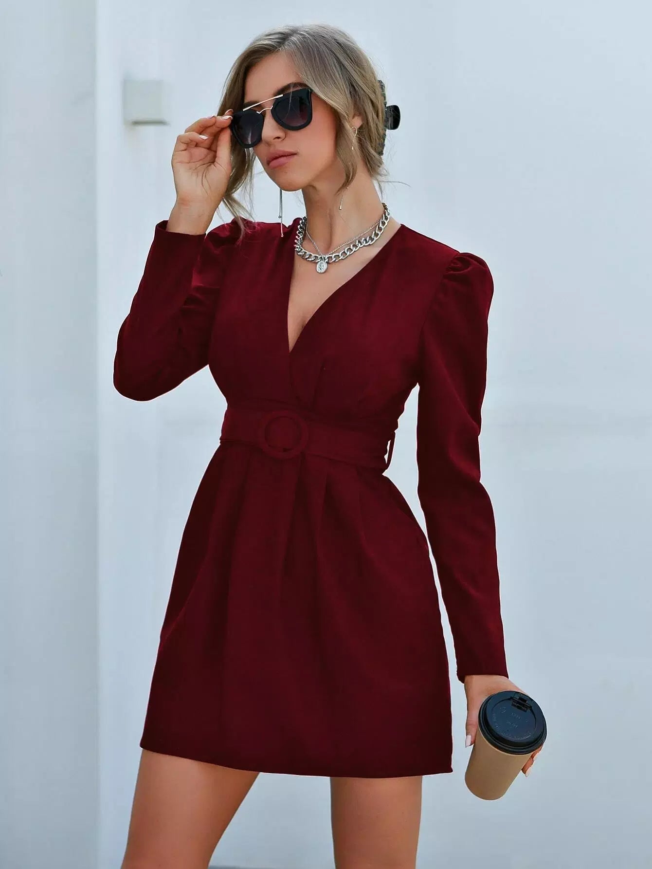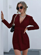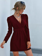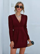 فستان بأكمام منتفخة ورقبة عميقة بدون حزام