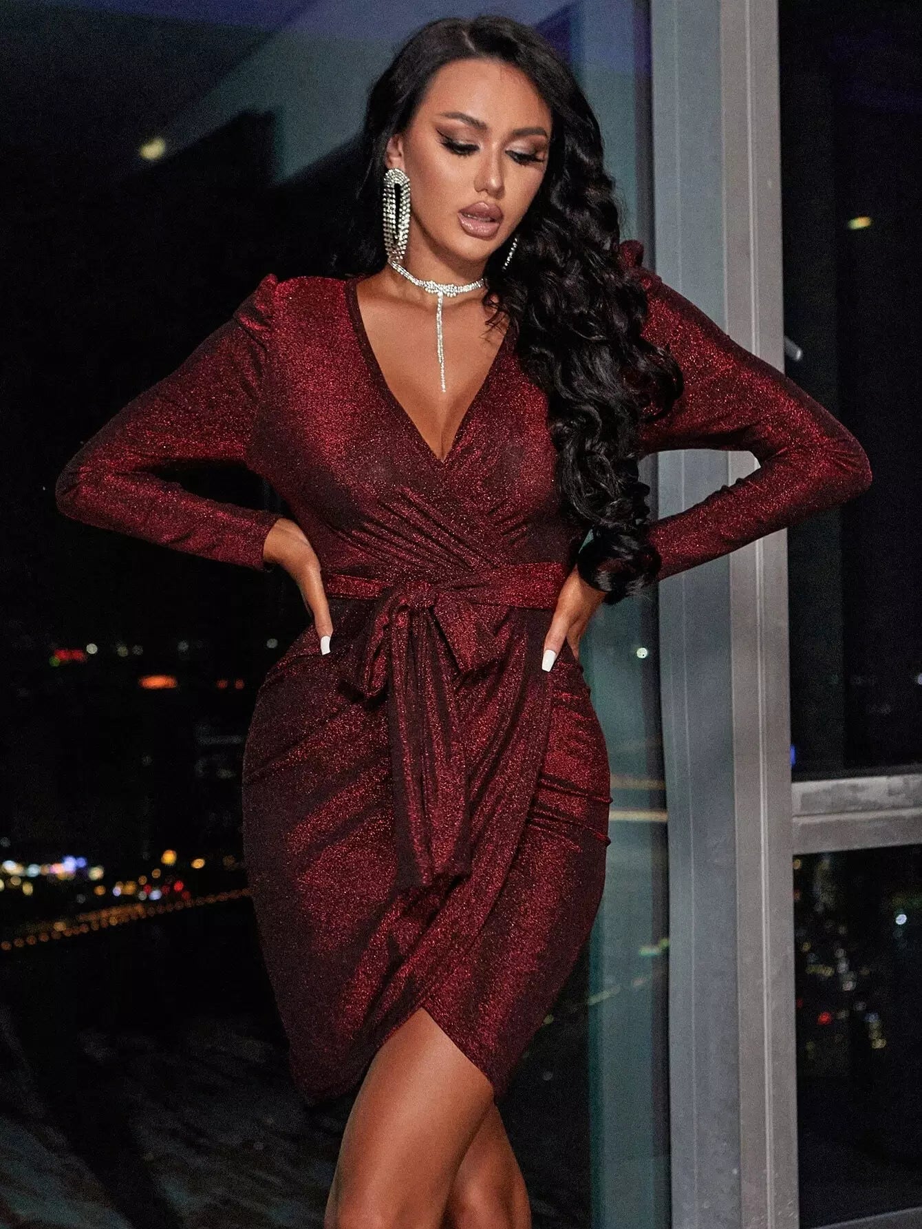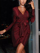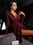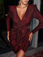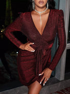 فستان لامع برقبة منتفخة وأكمام ملفوفة بدون حزام