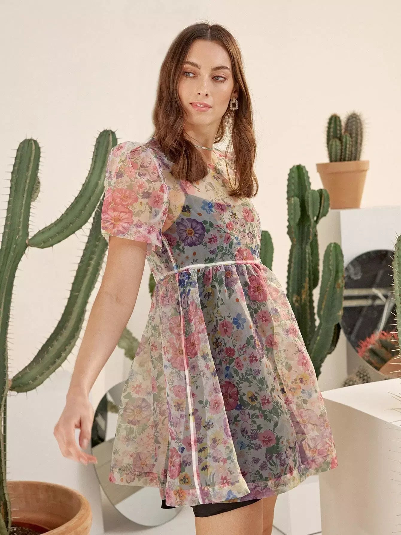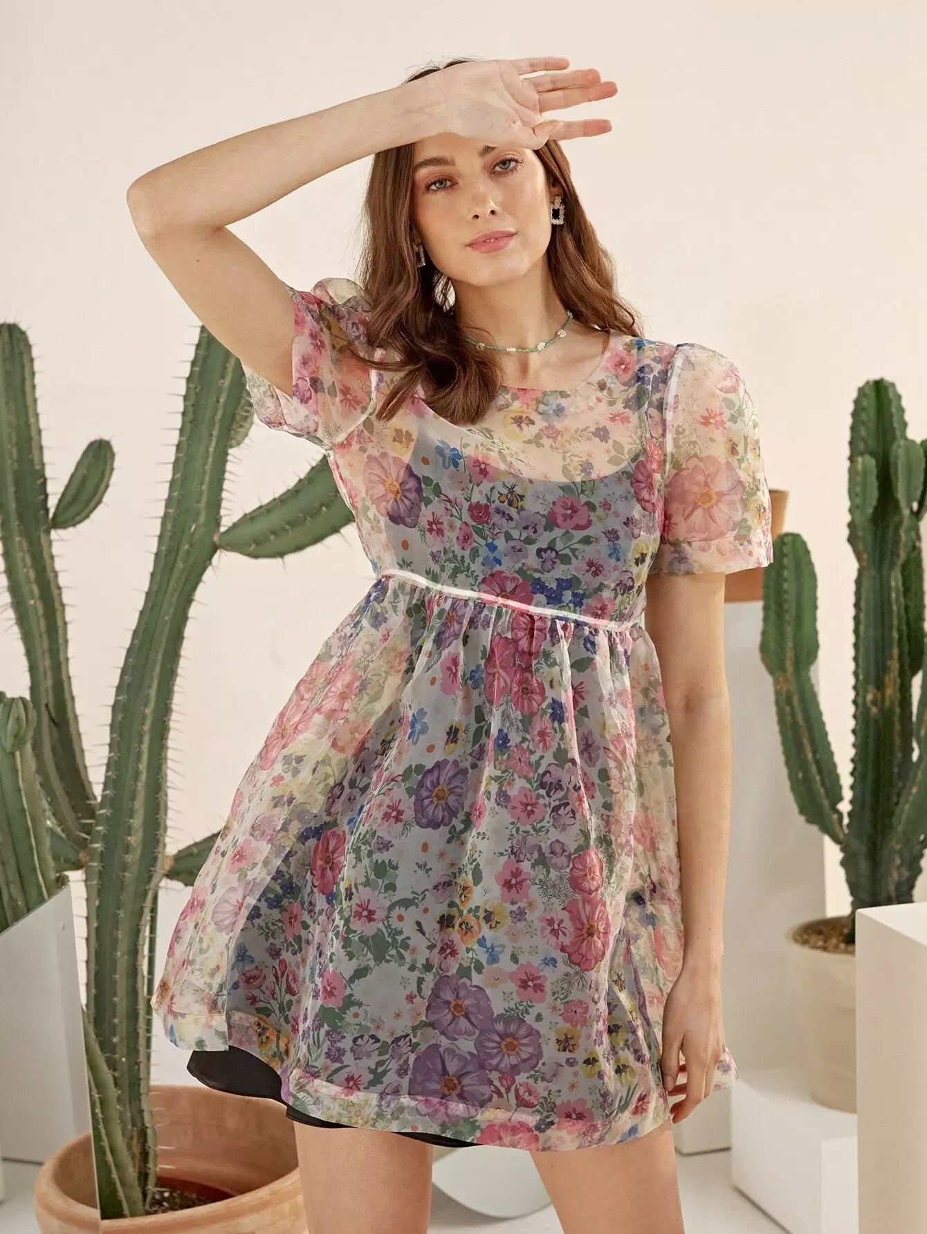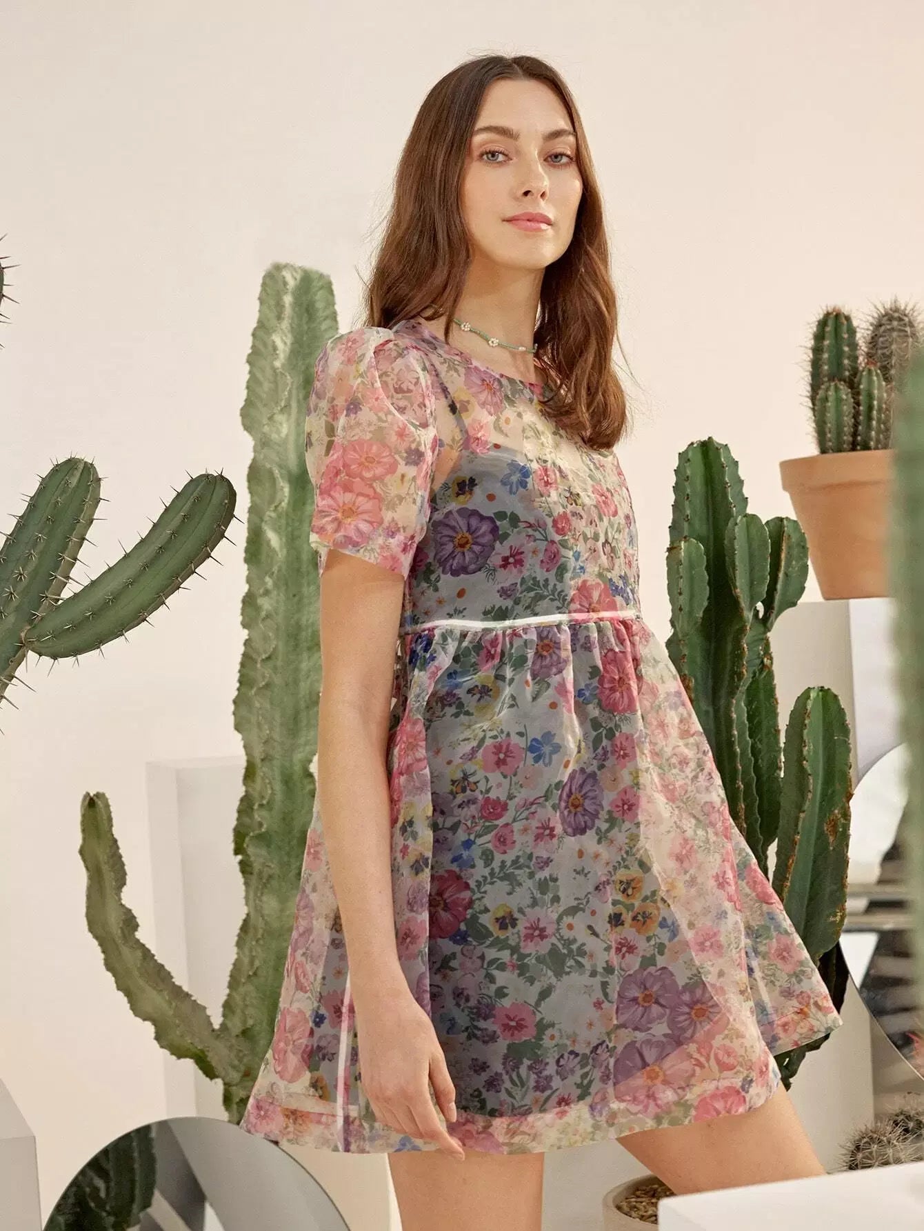 فستان من الأورجانزا الشفاف المزهر بأكمام منفوخة بدون بطانة