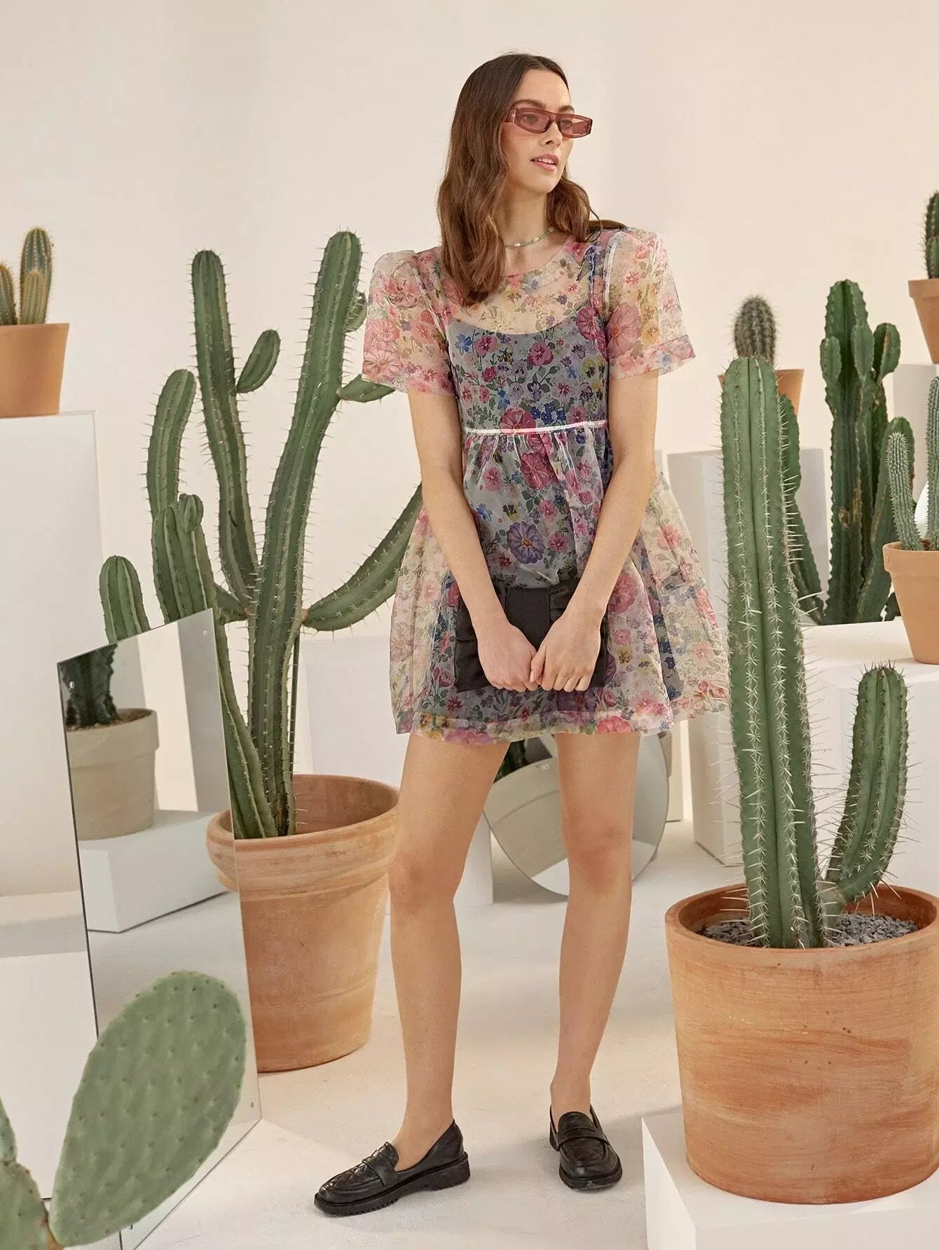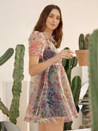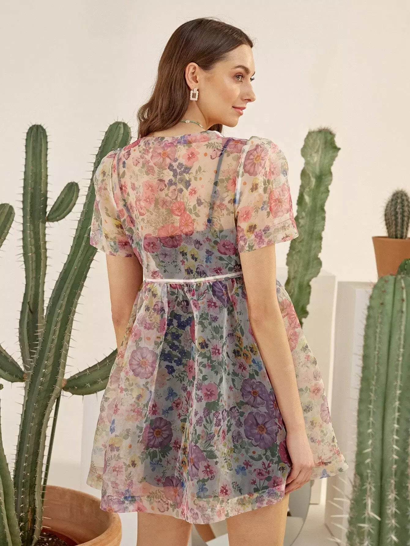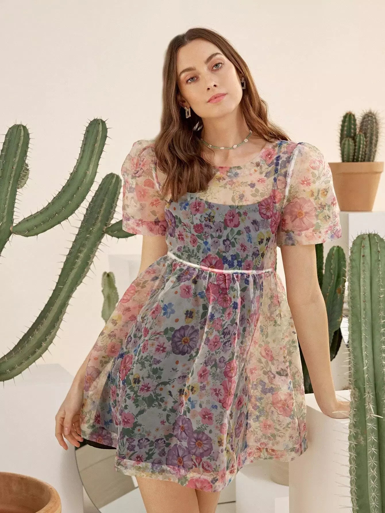 فستان من الأورجانزا الشفاف المزهر بأكمام منفوخة بدون بطانة