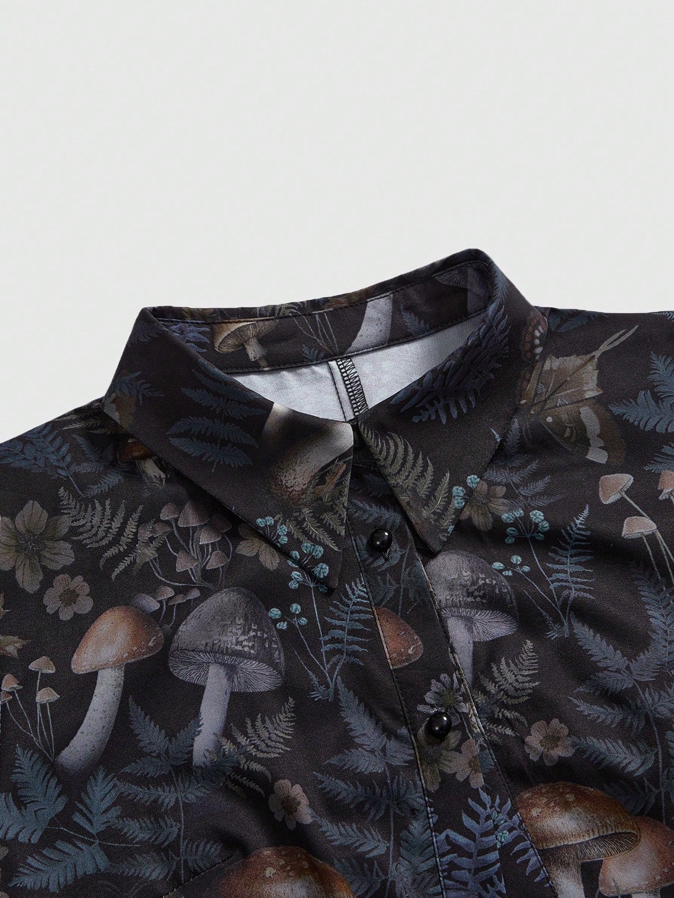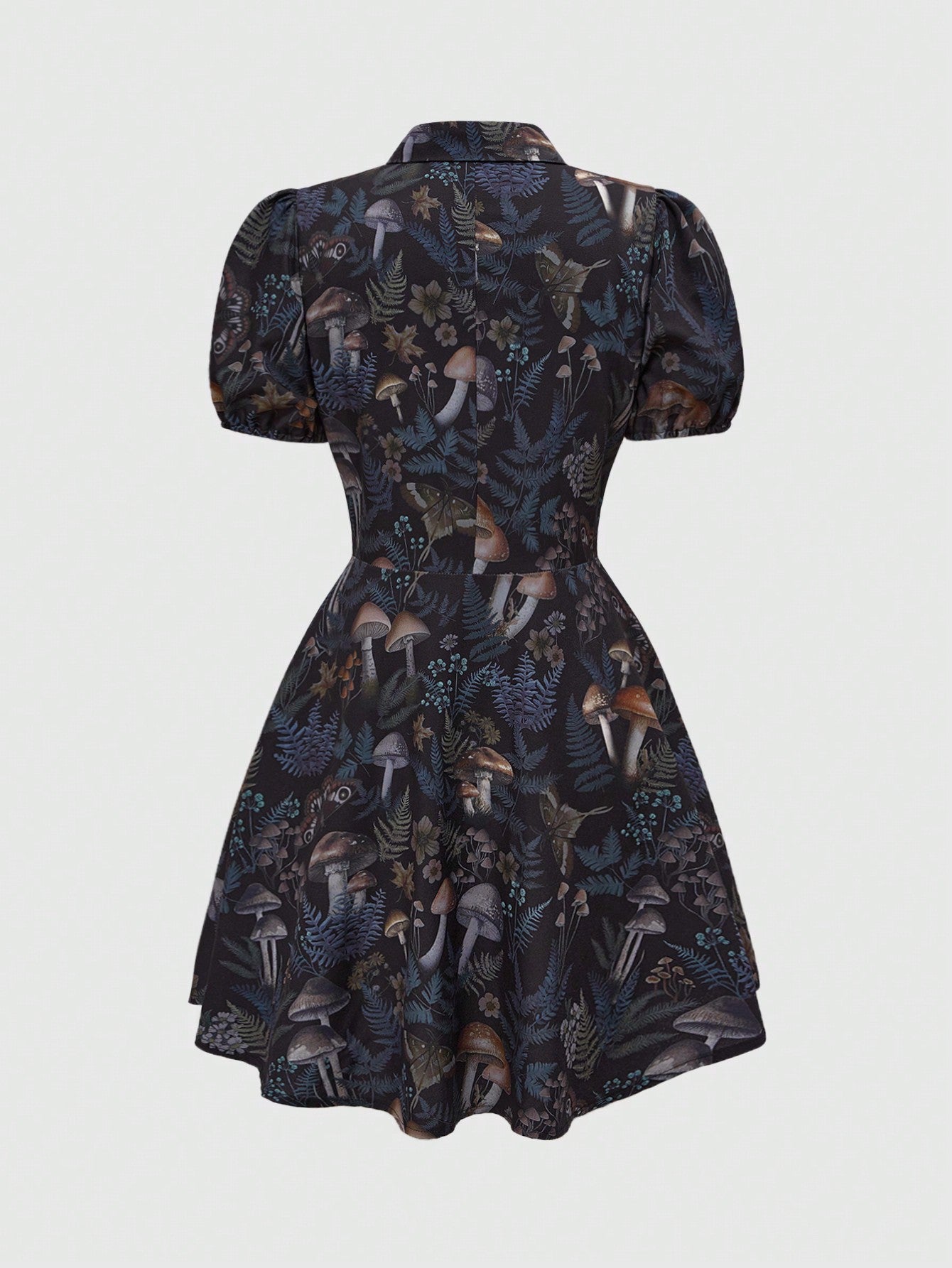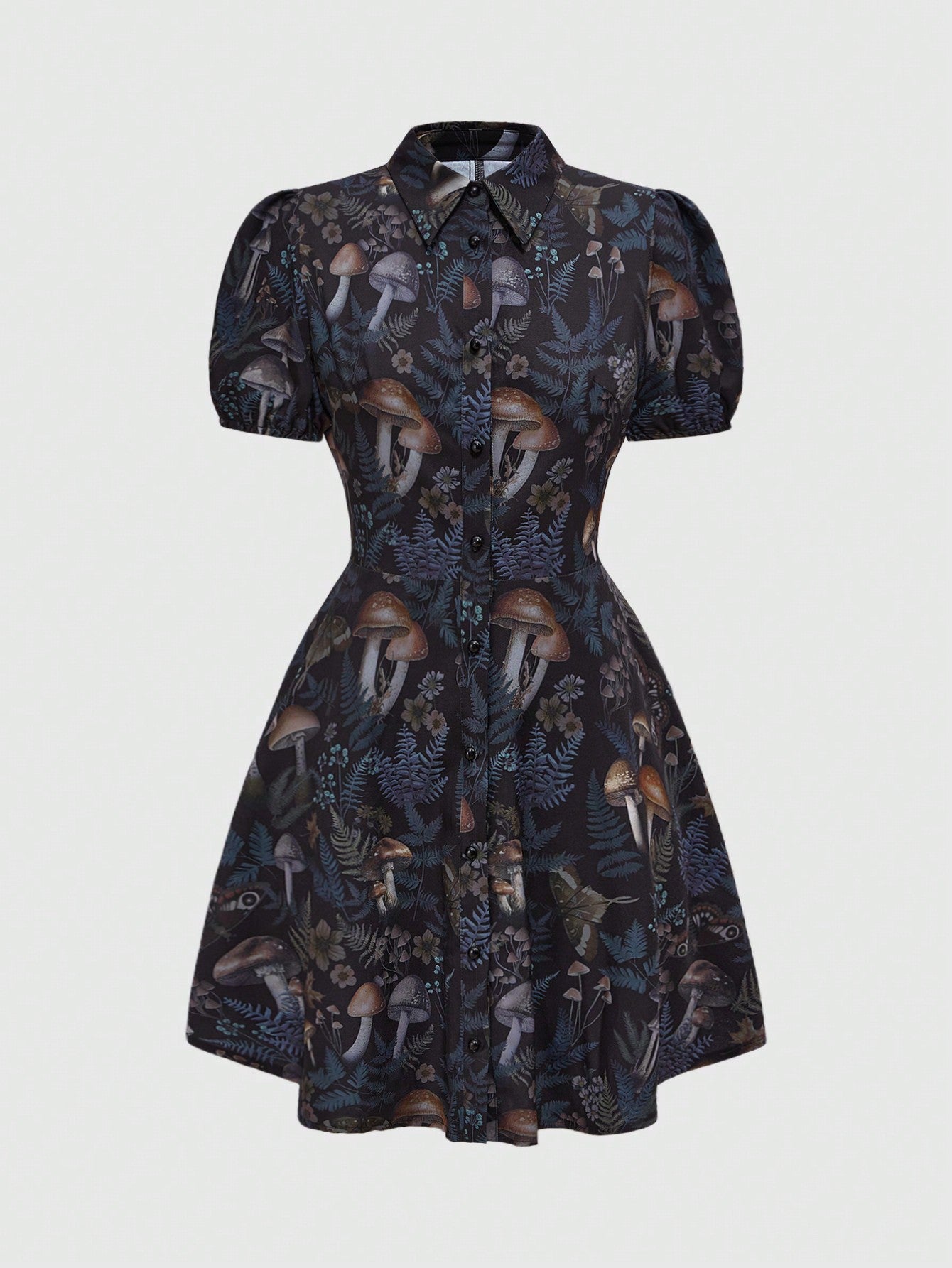 ROMWE Goth Women's Gothic Style Plant Mushroom Print Waistband Shirt Dress