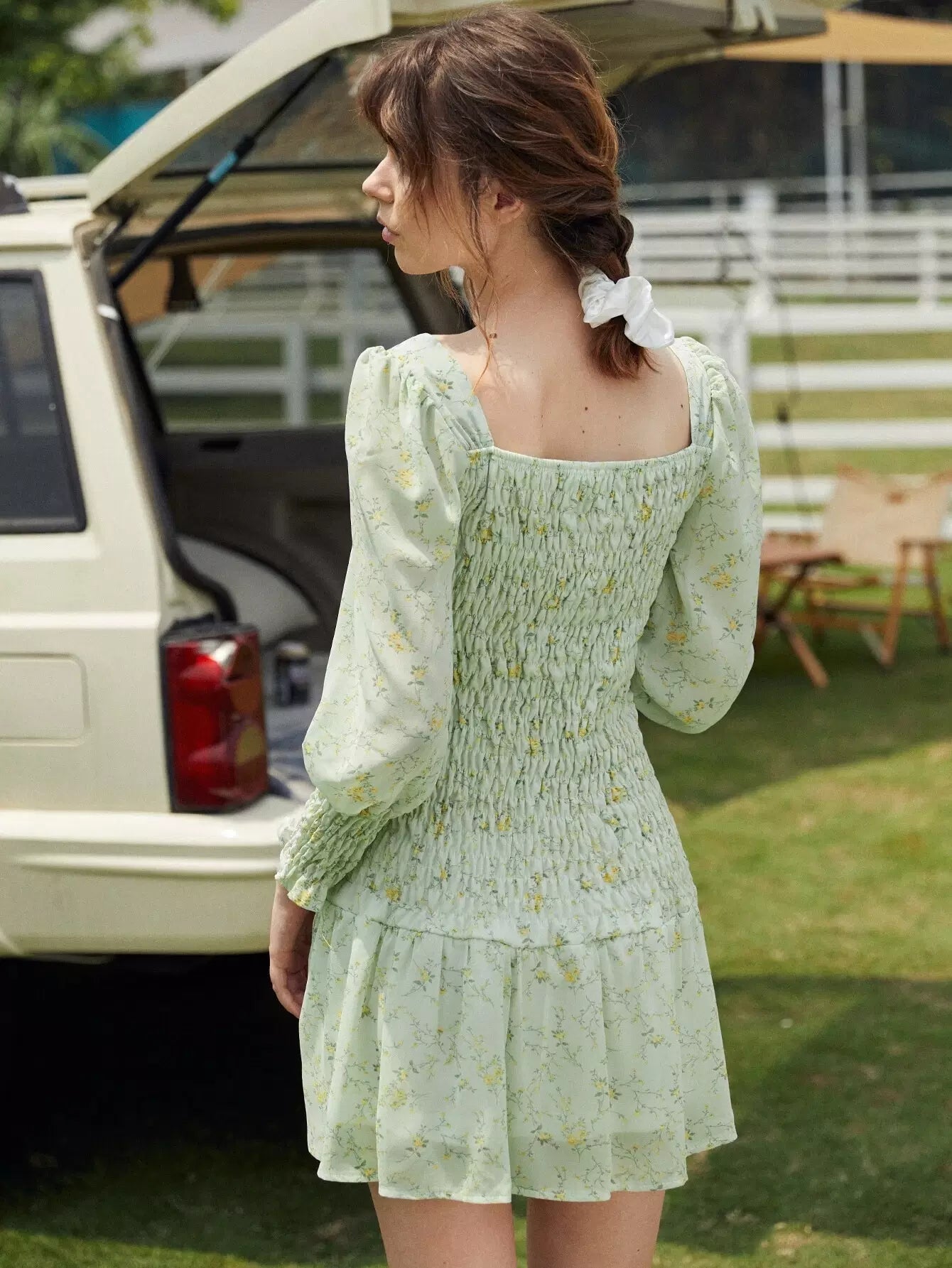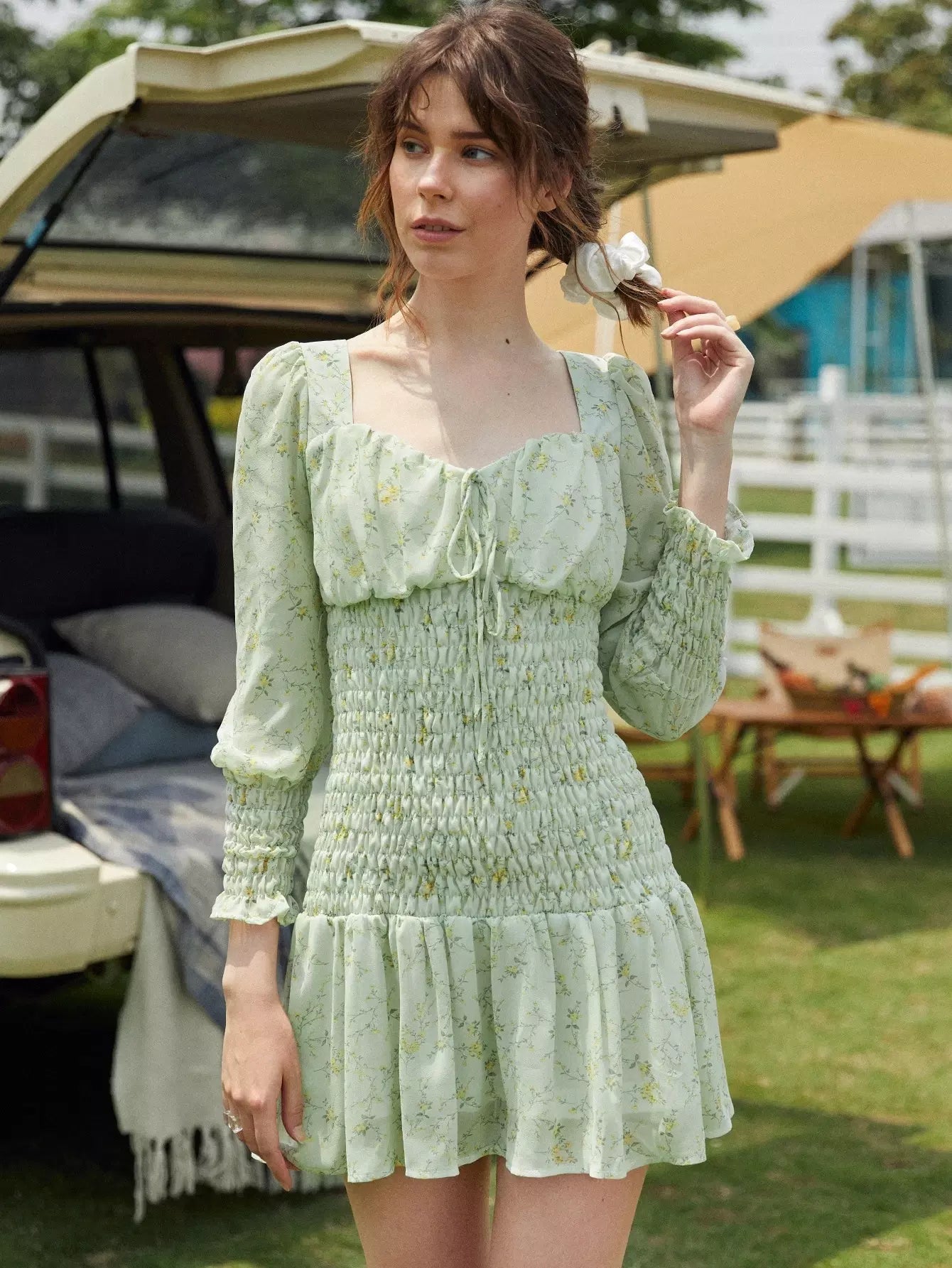 فستان زهري بحواف كشكش مكشكشة على الصدر مكشكشة