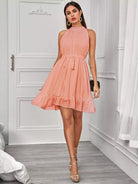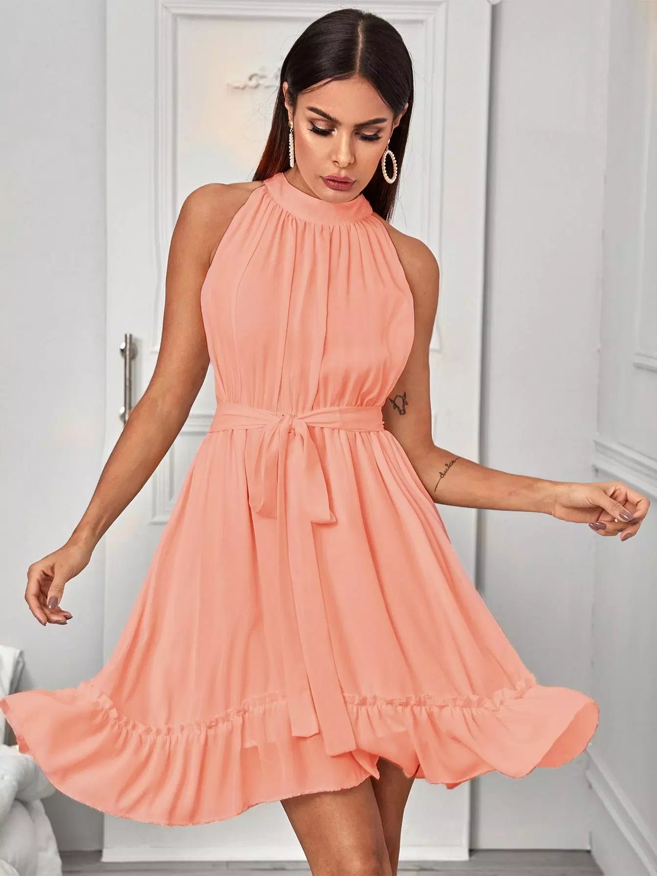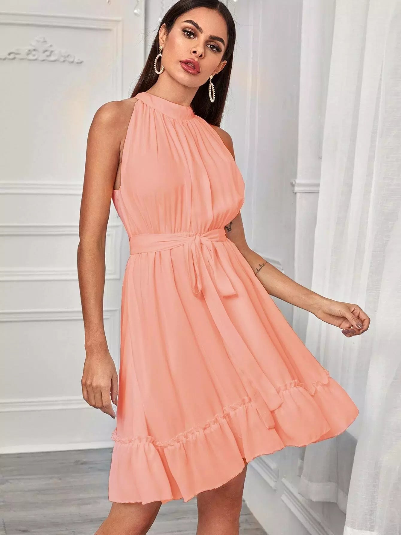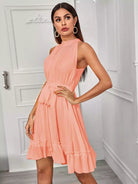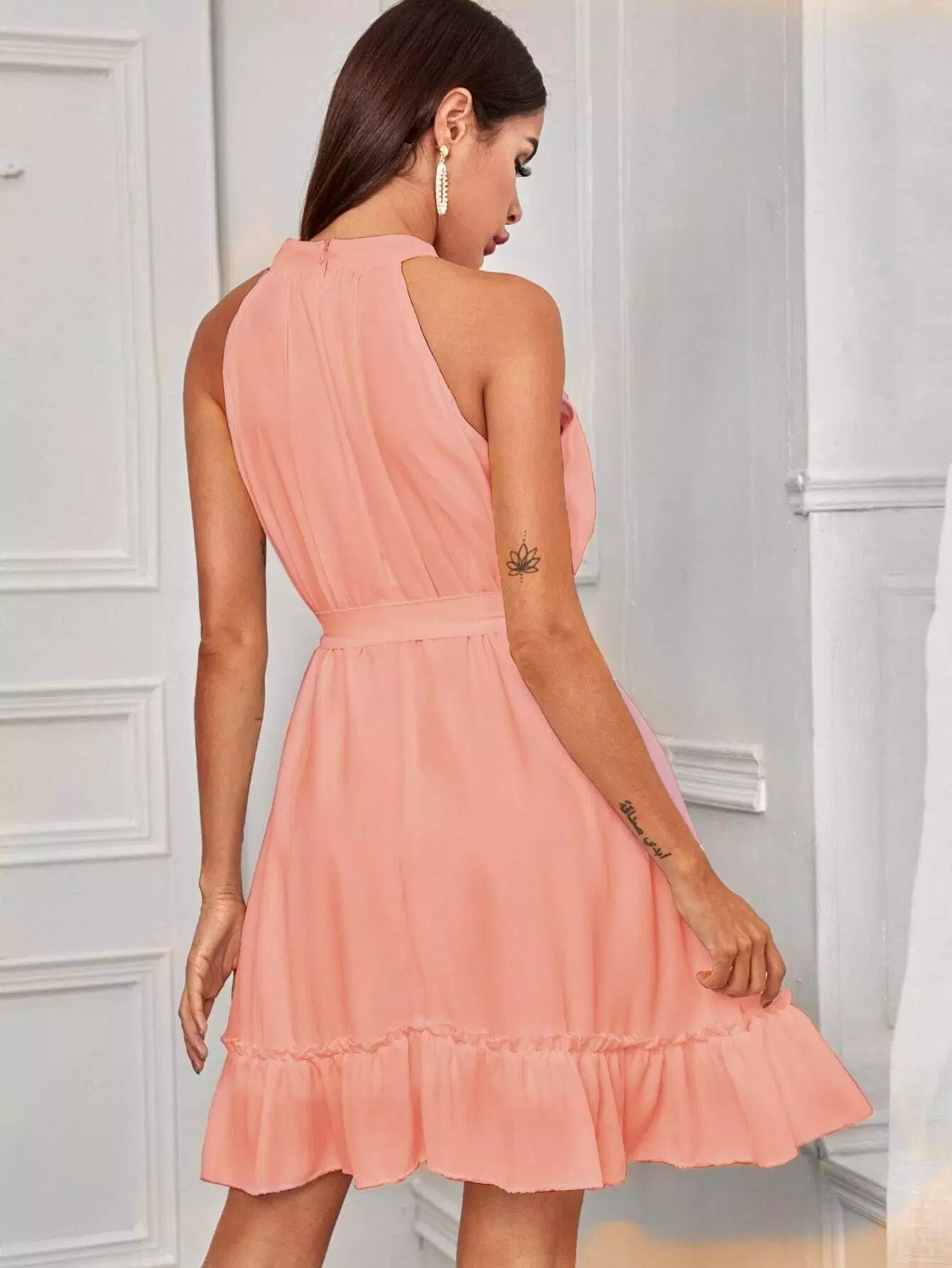 فستان شيفون بحاشية كشكش بربطة عنق ذاتية من الشيفون على الرقبة