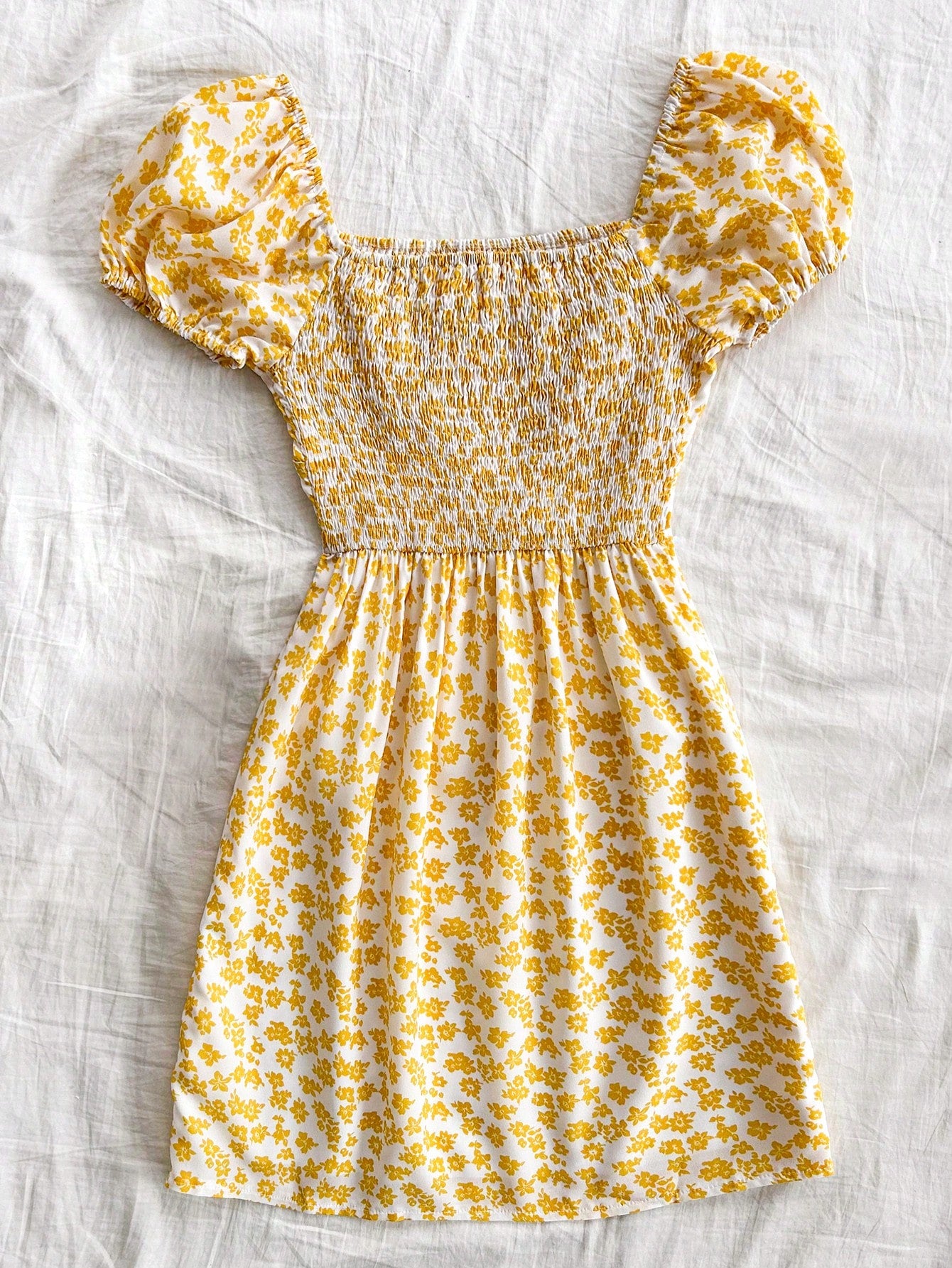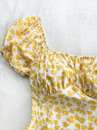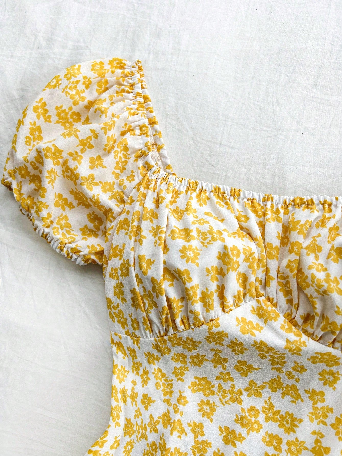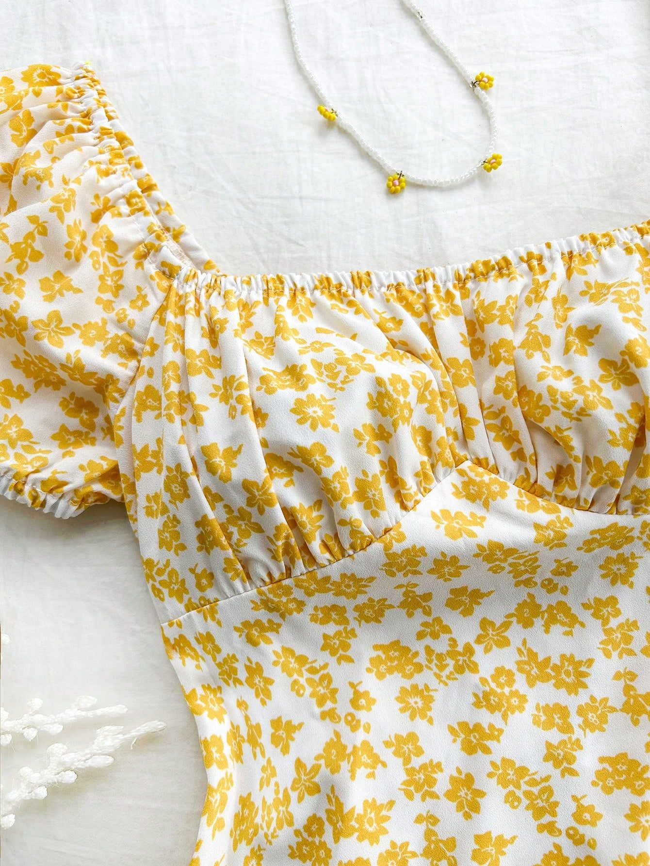 فستان Soleia الأصفر المزهر الرومانسي غير الرسمي للعطلات الصيفية بأكمام منتفخة وخصر مطوي وخط A، بلون الباستيل