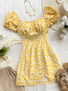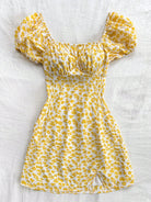 Soleia Yellow Ditsy Floral Romantic Casual Vacation Puff Sleeve Pleated Waist A-Line Summer Short Dress,Pastel