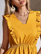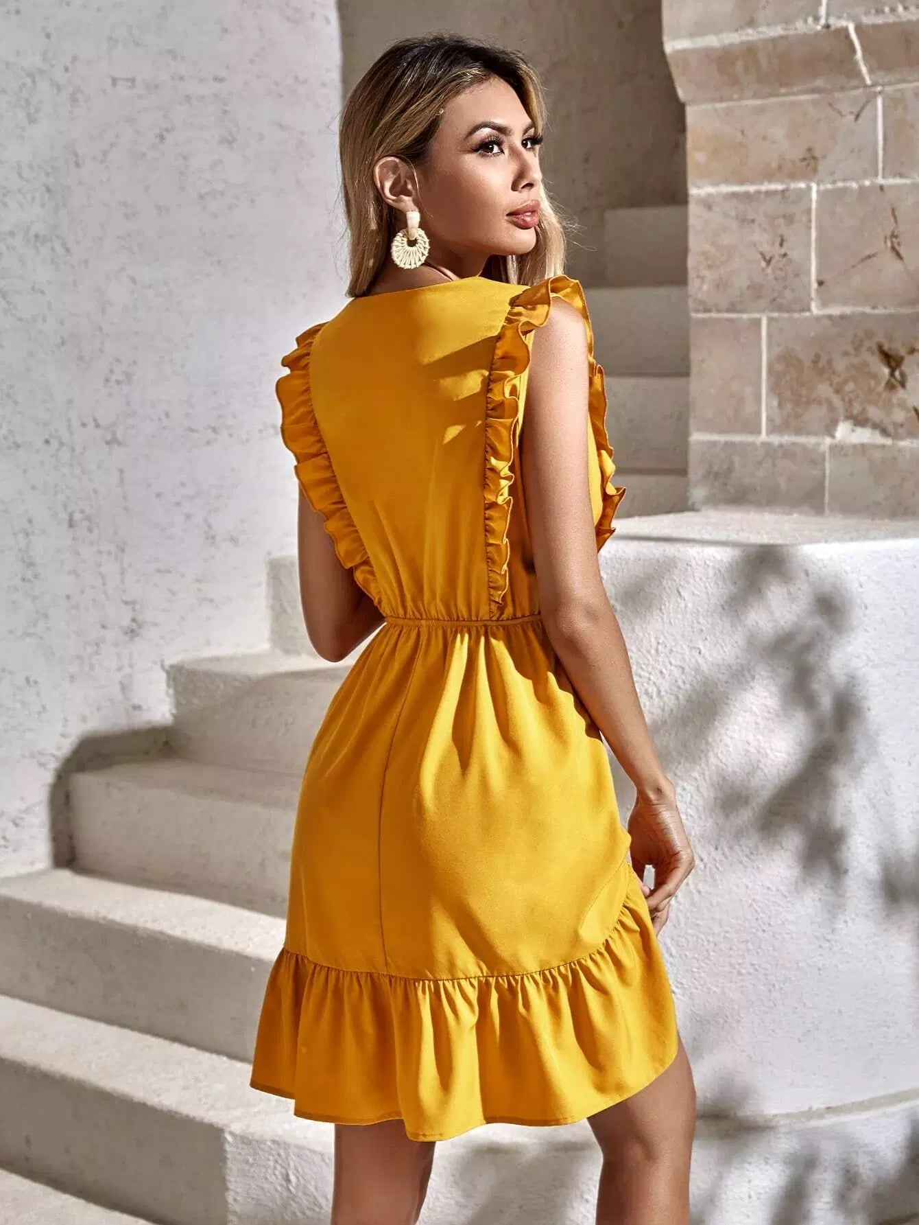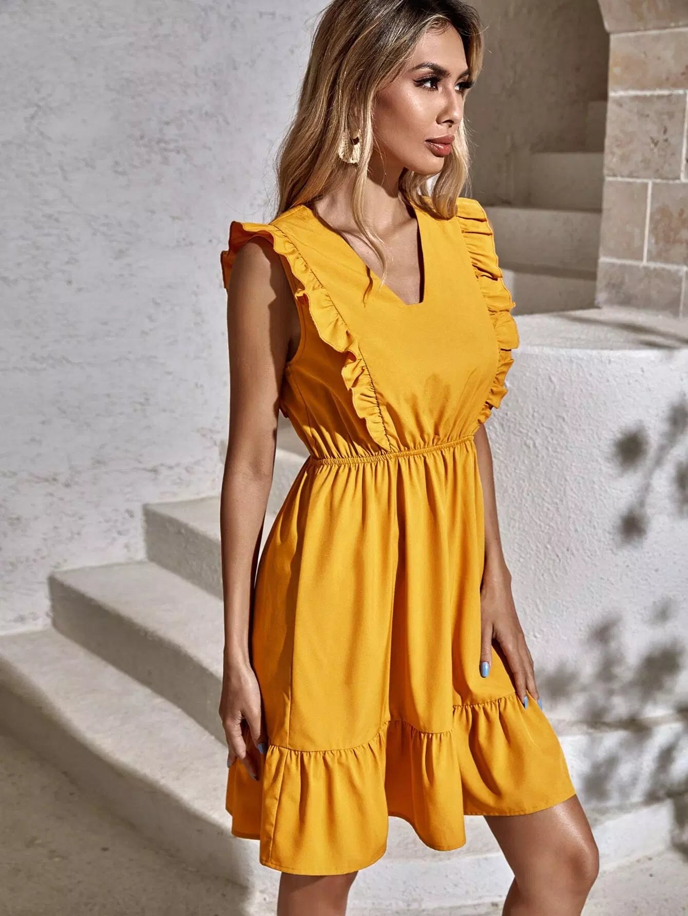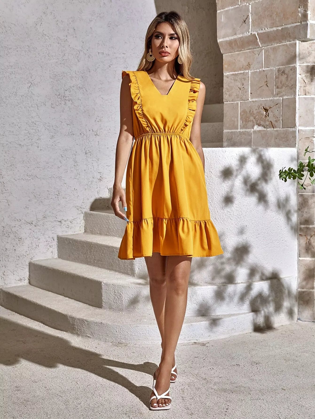 فستان سادة برقبة على شكل حرف V بياقة على شكل كشكش