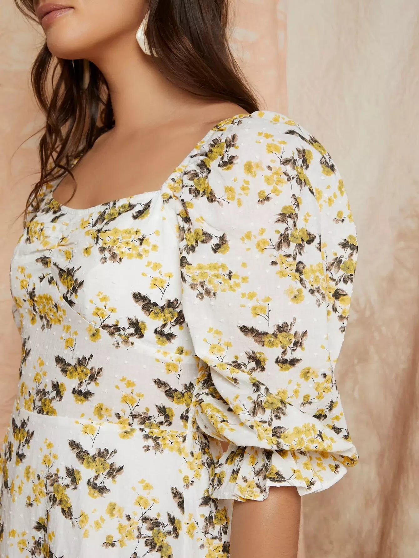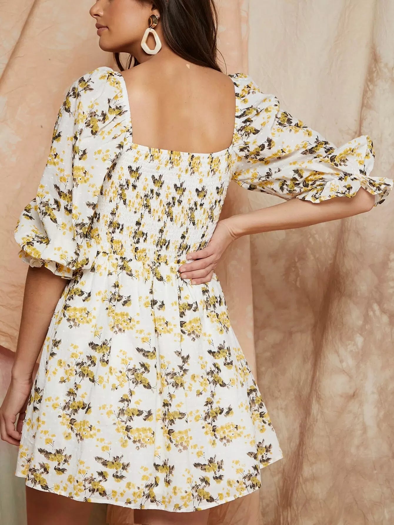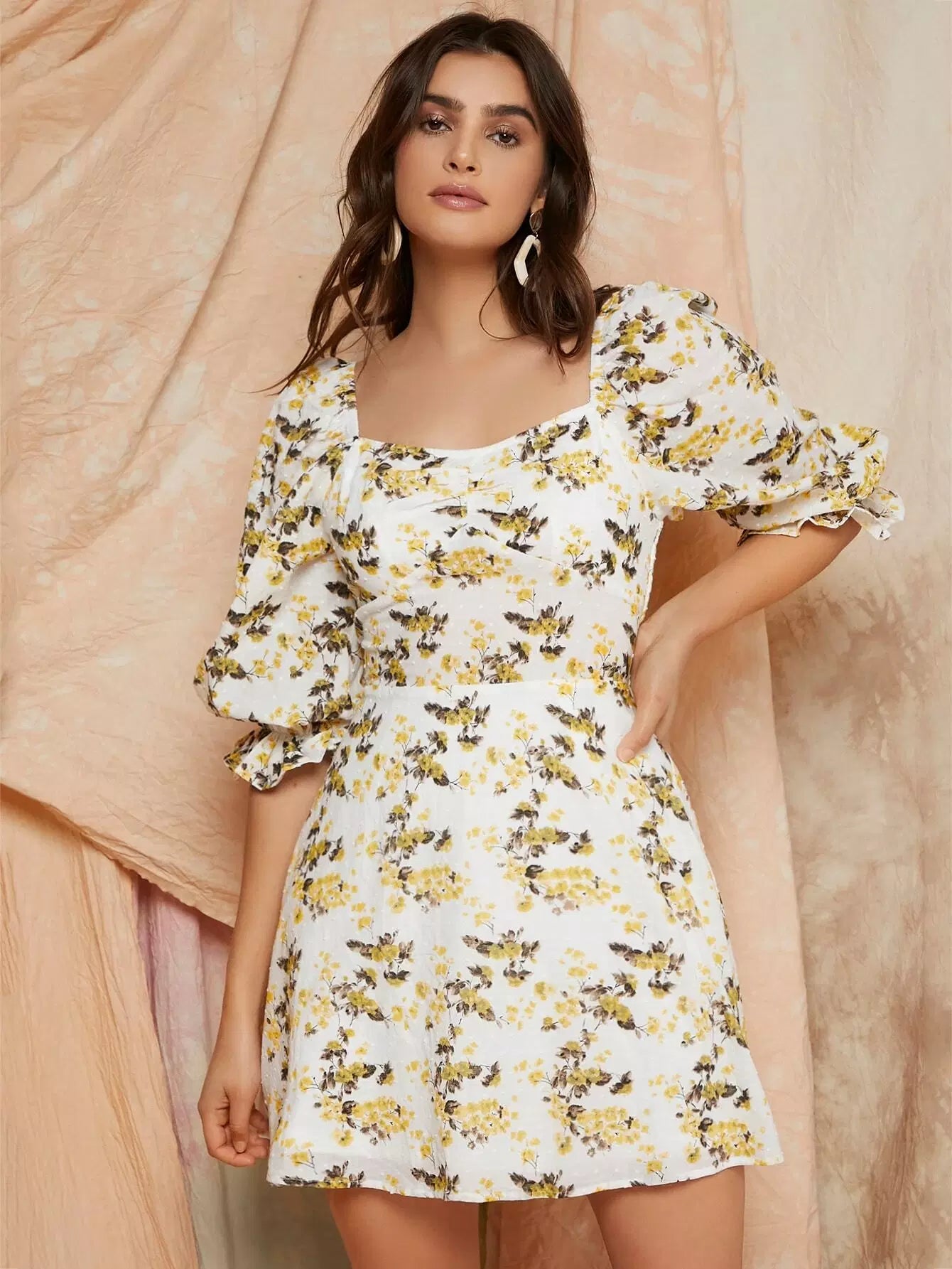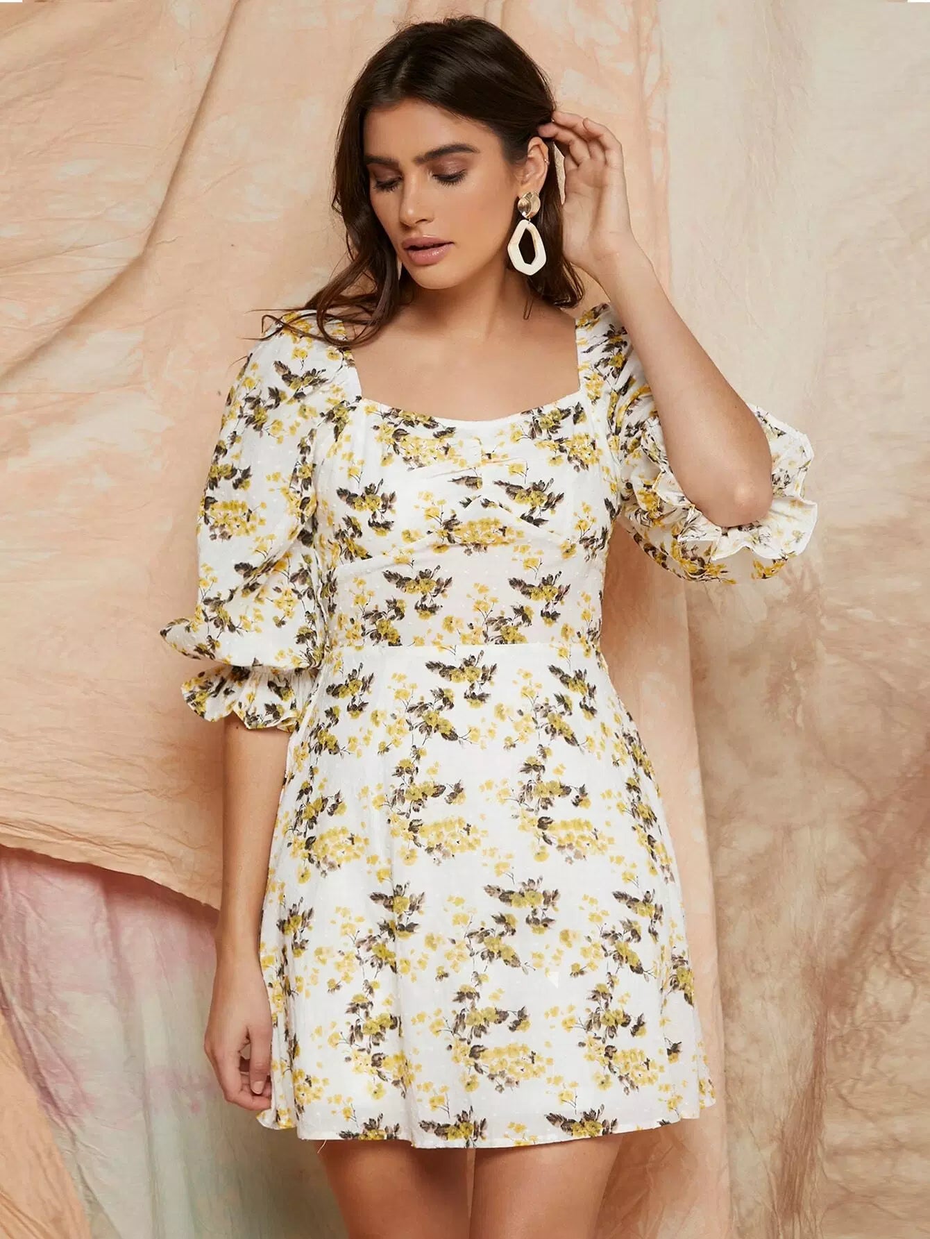 فستان بياقة مربعة برقبة مربعة مكشكشة من الأمام بطبعة زهور منقّطة سويسرية