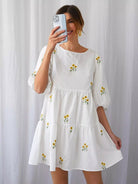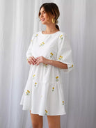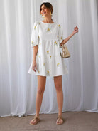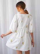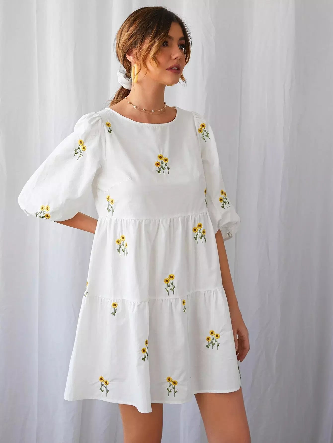 فستان قصير بأكمام فانوس وتطريز عباد الشمس