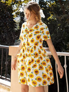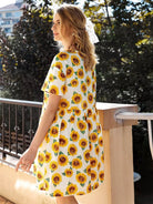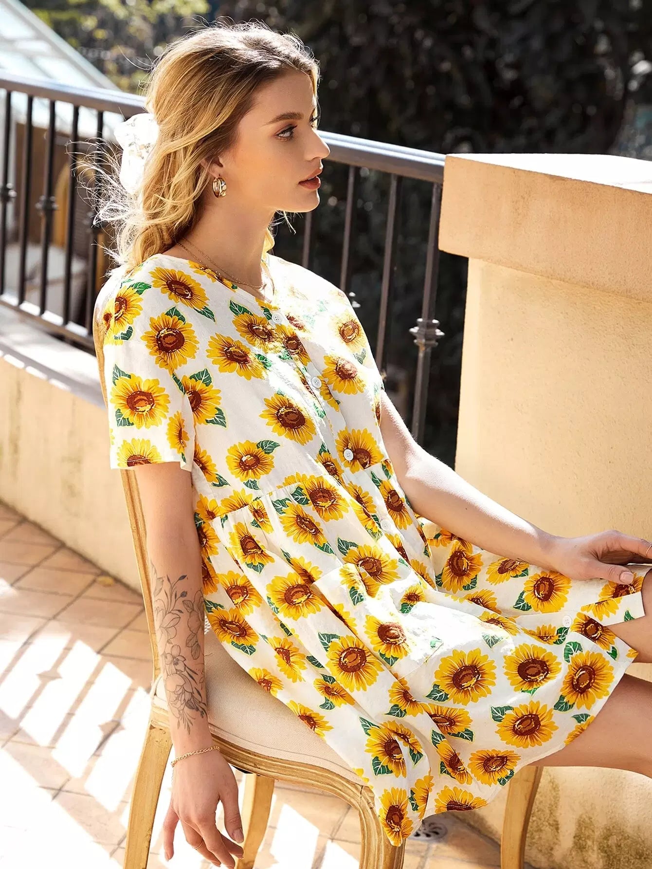 فستان سموك مطبوع بأزرار أمامي بأزرار مطبوع عليها زهرة دوار الشمس