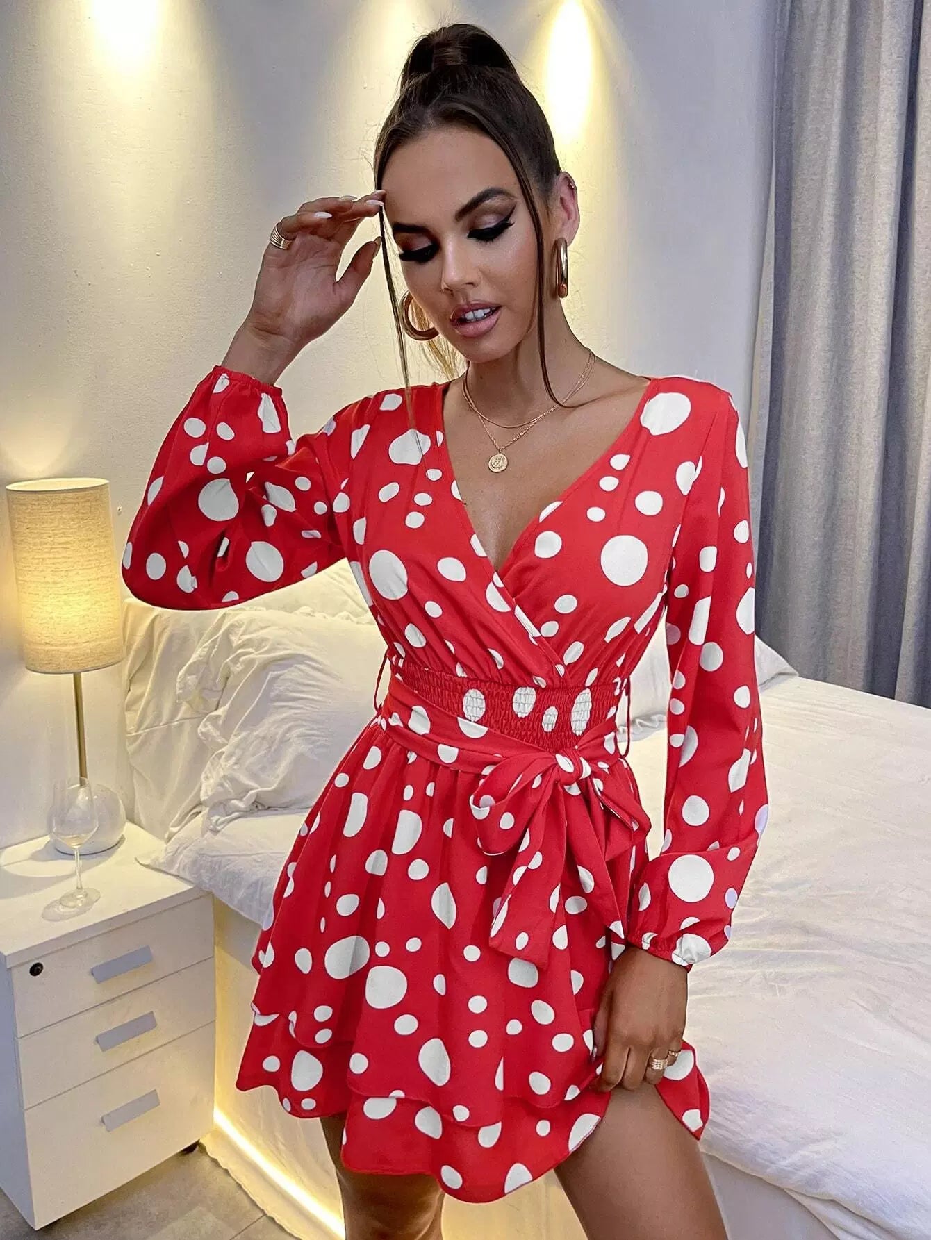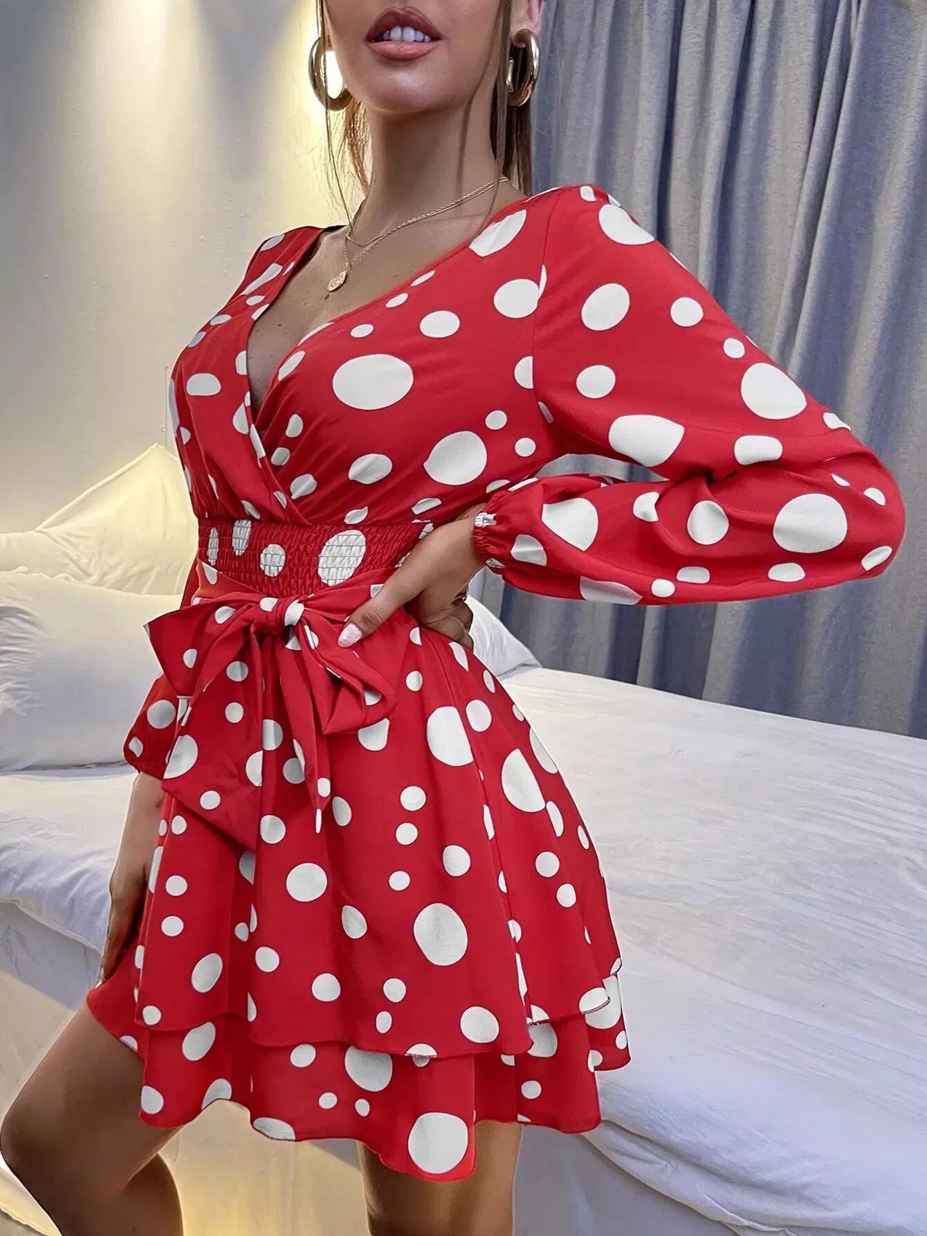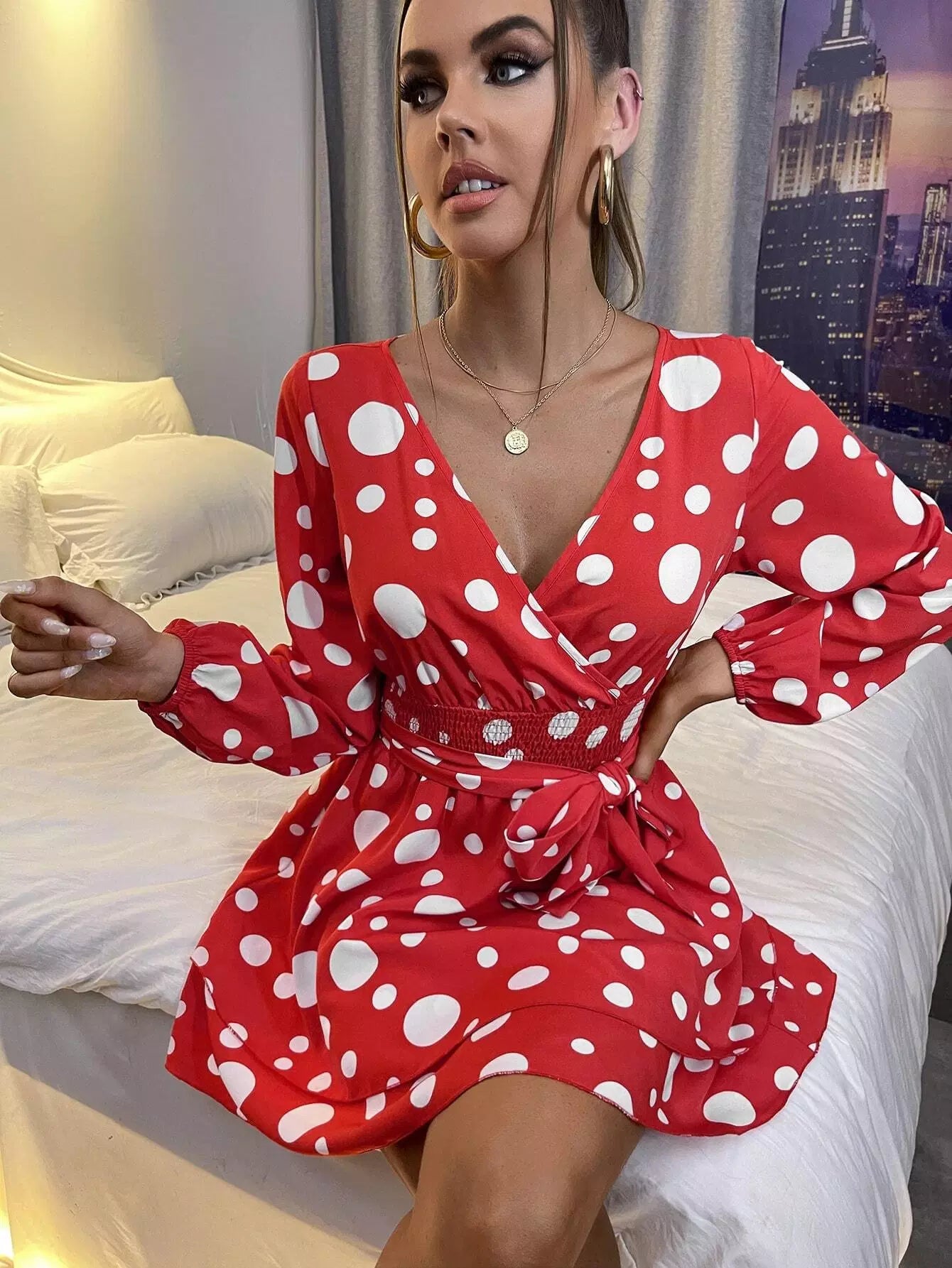 فستان بأكمام واسعة ورقبة منقطة وطبعة فانوس بدون حزام