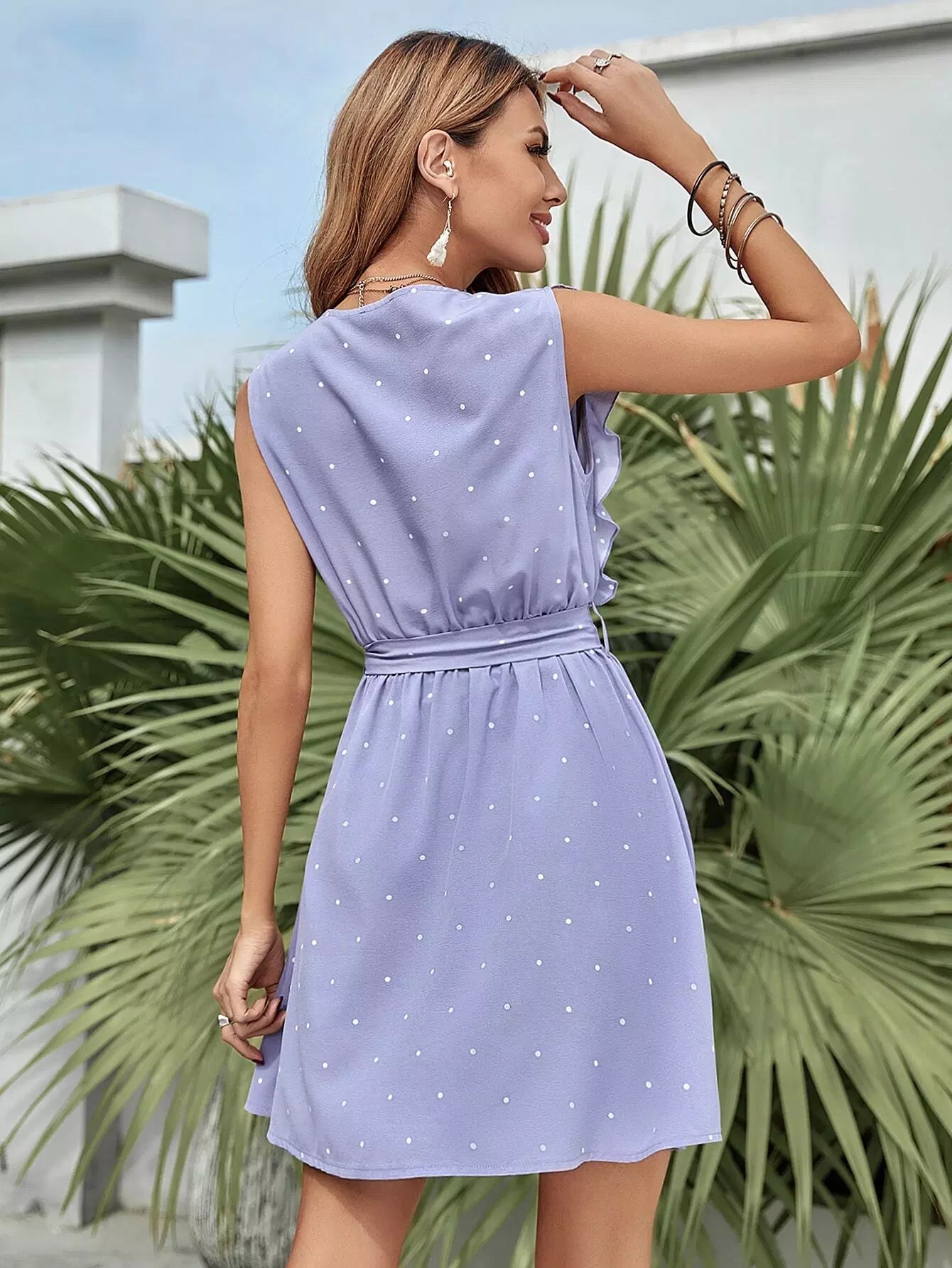 فستان منقّط ورقبة مكشكشة بدون حزام