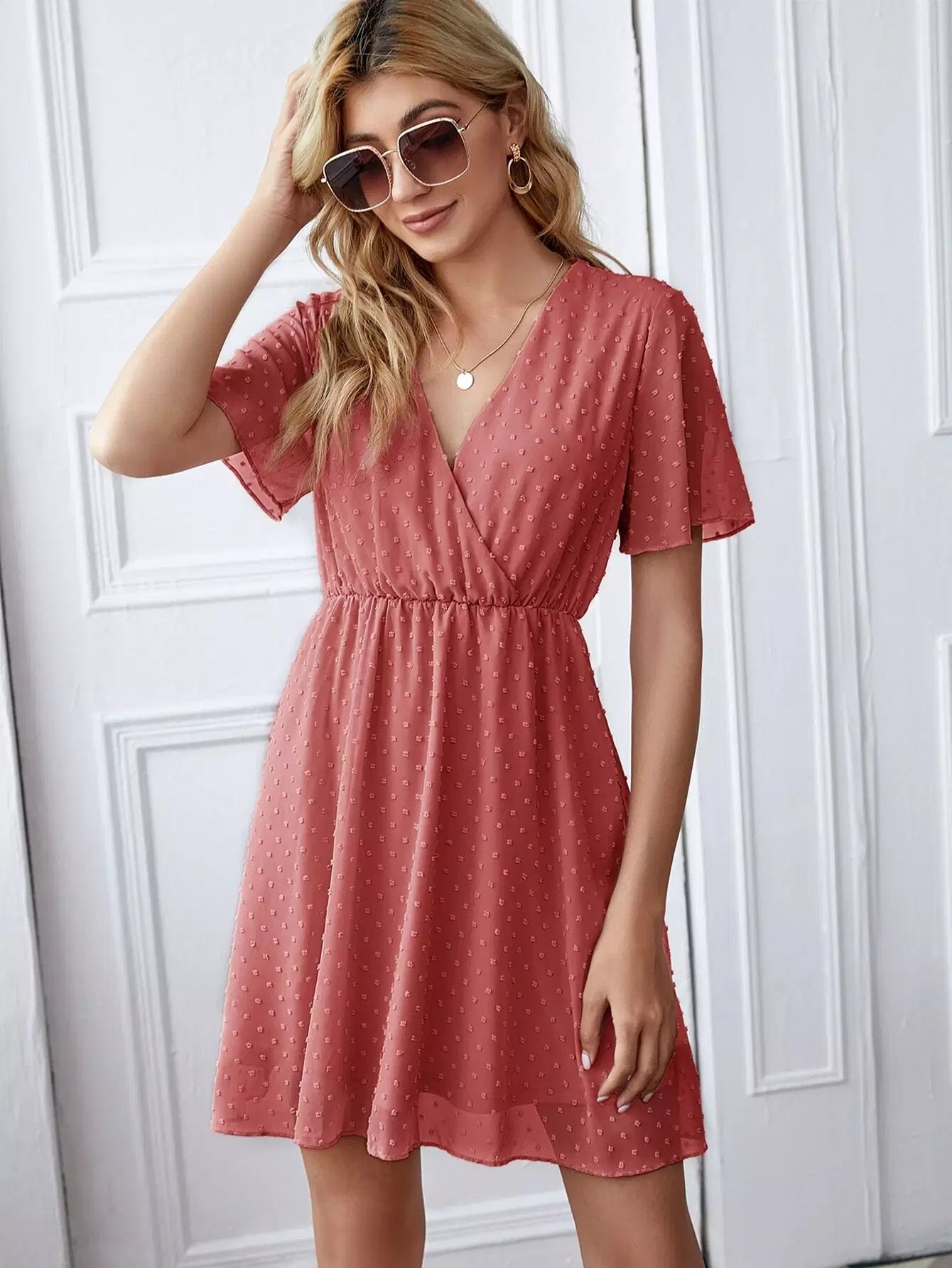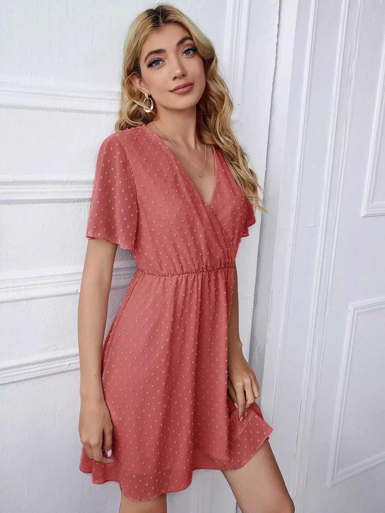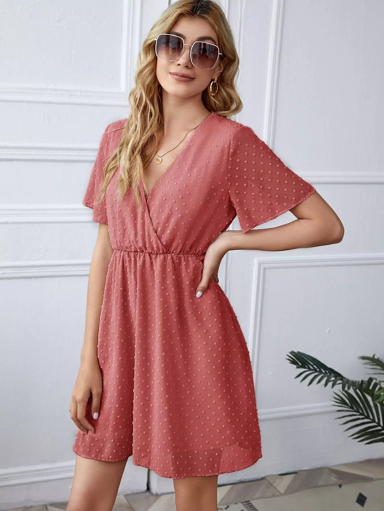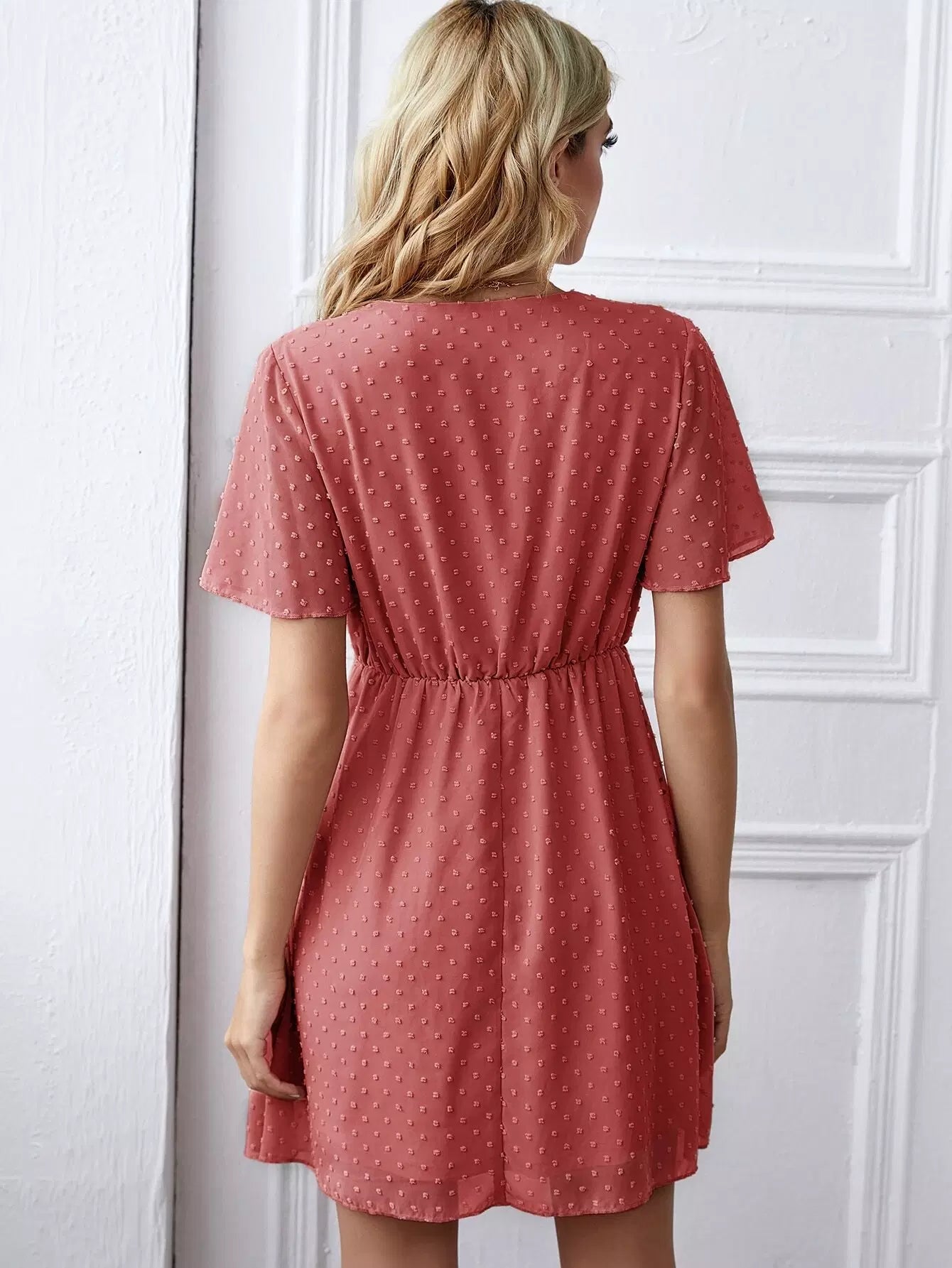 فستان برقبة كشكش بياقة منقّط سويسري