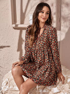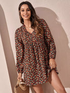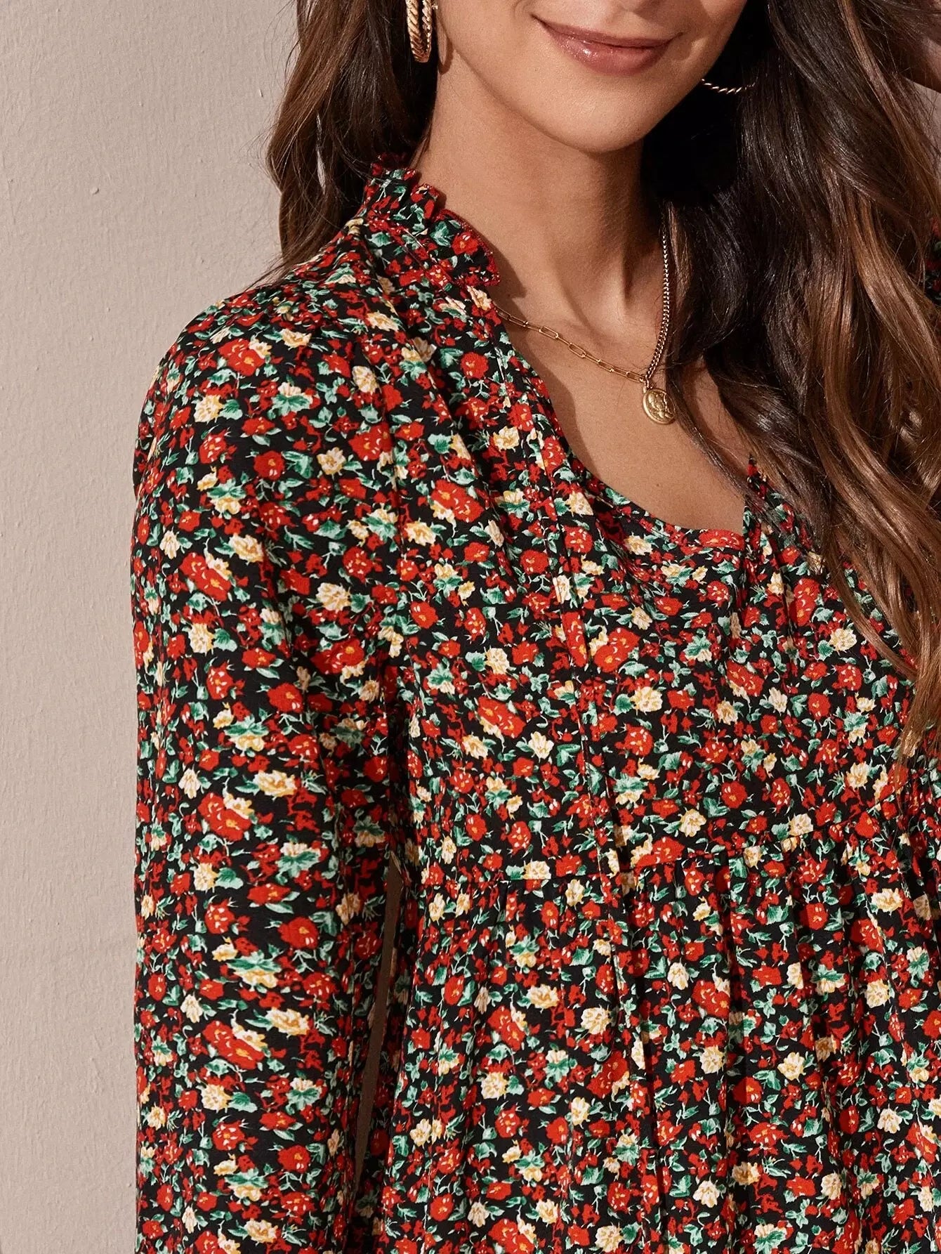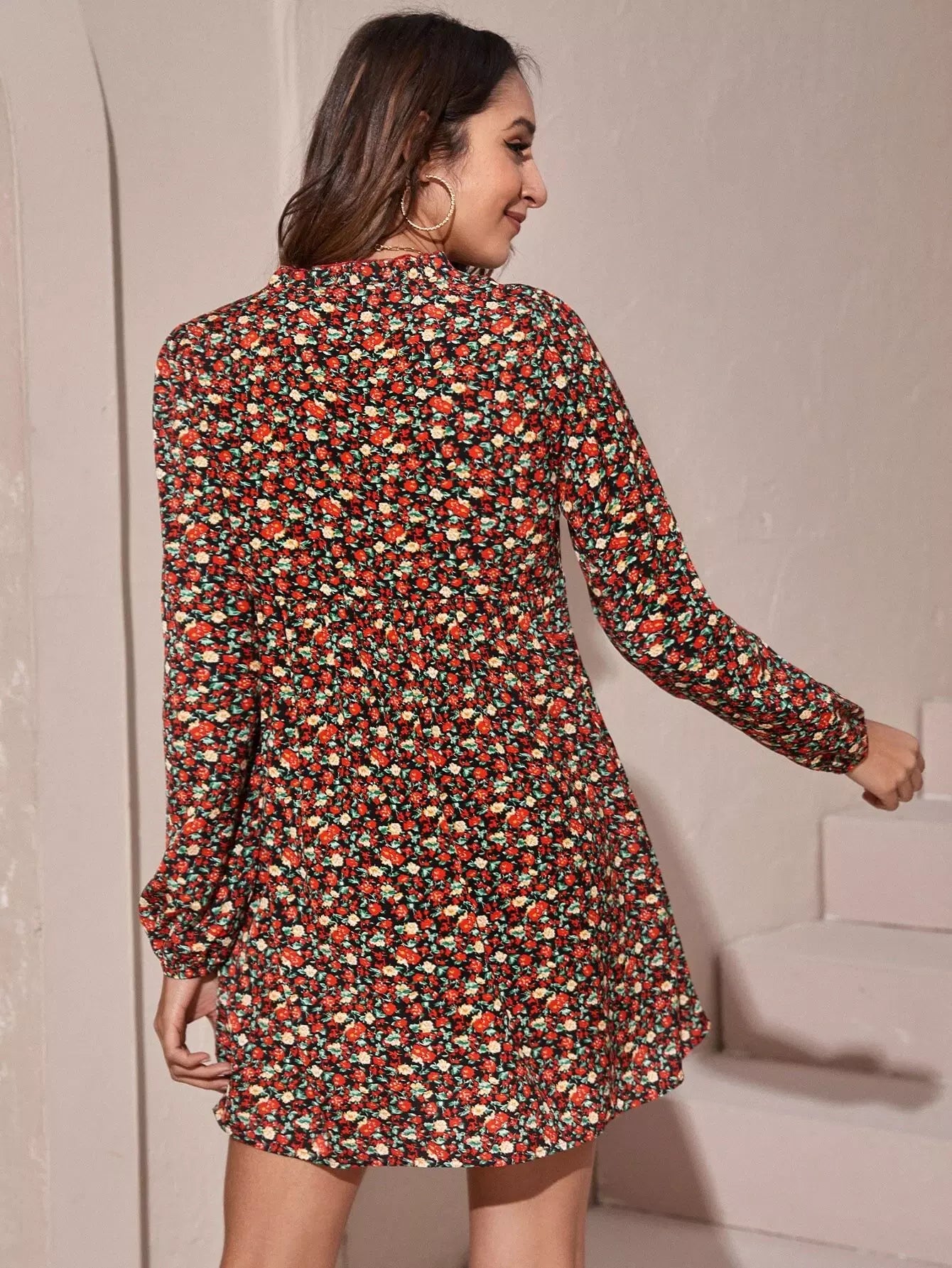 فستان قصير منقوش بالزهور بأكمام واسعة ورقبة على شكل فانوس