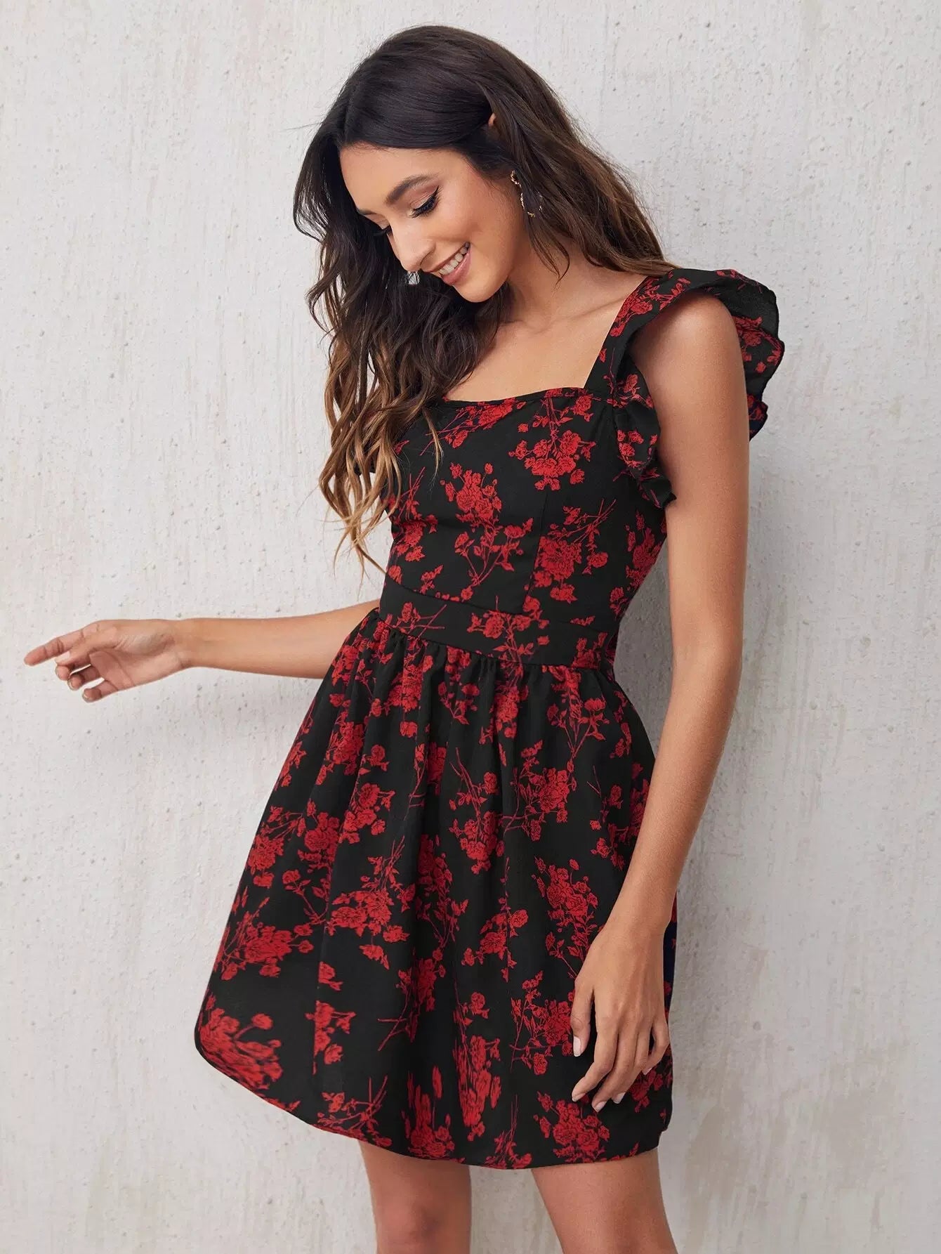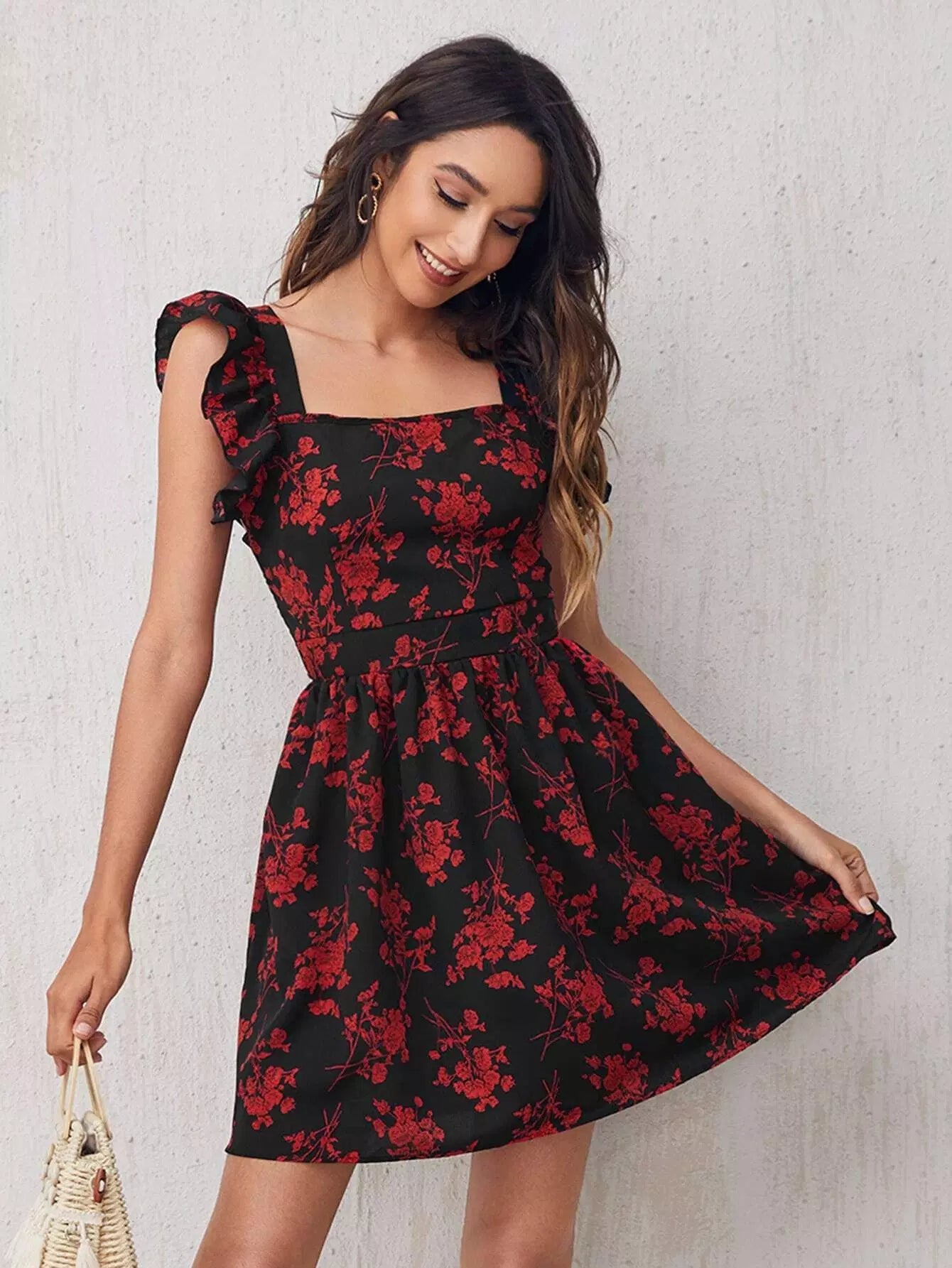 فستان مفتوح من الخلف بربطة عنق مكشكشة بفتحة ذراع مكشكشة بطبعة زهور