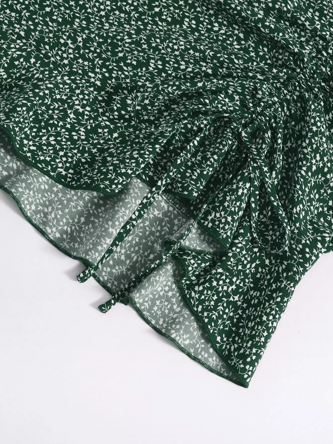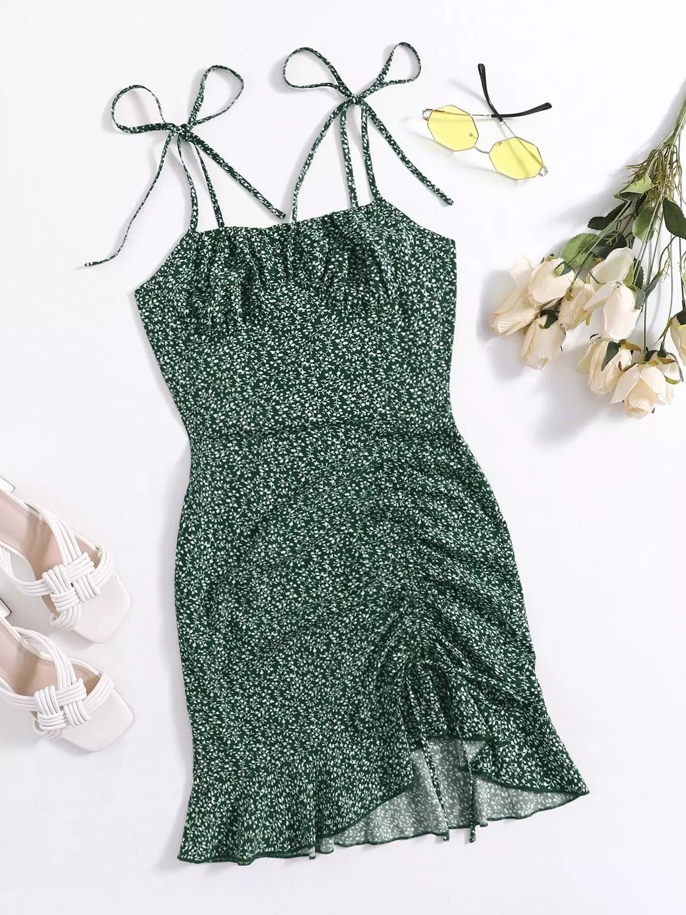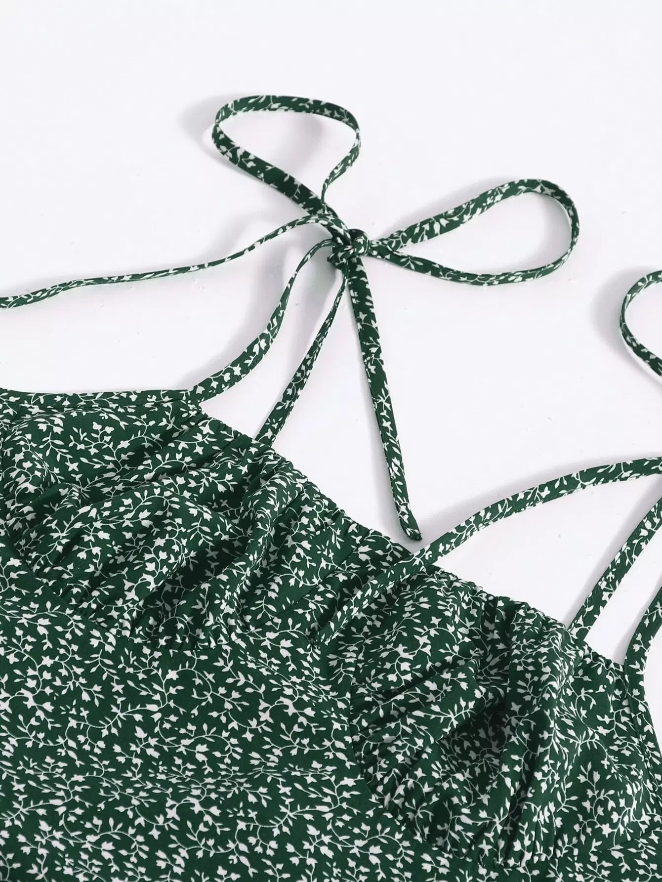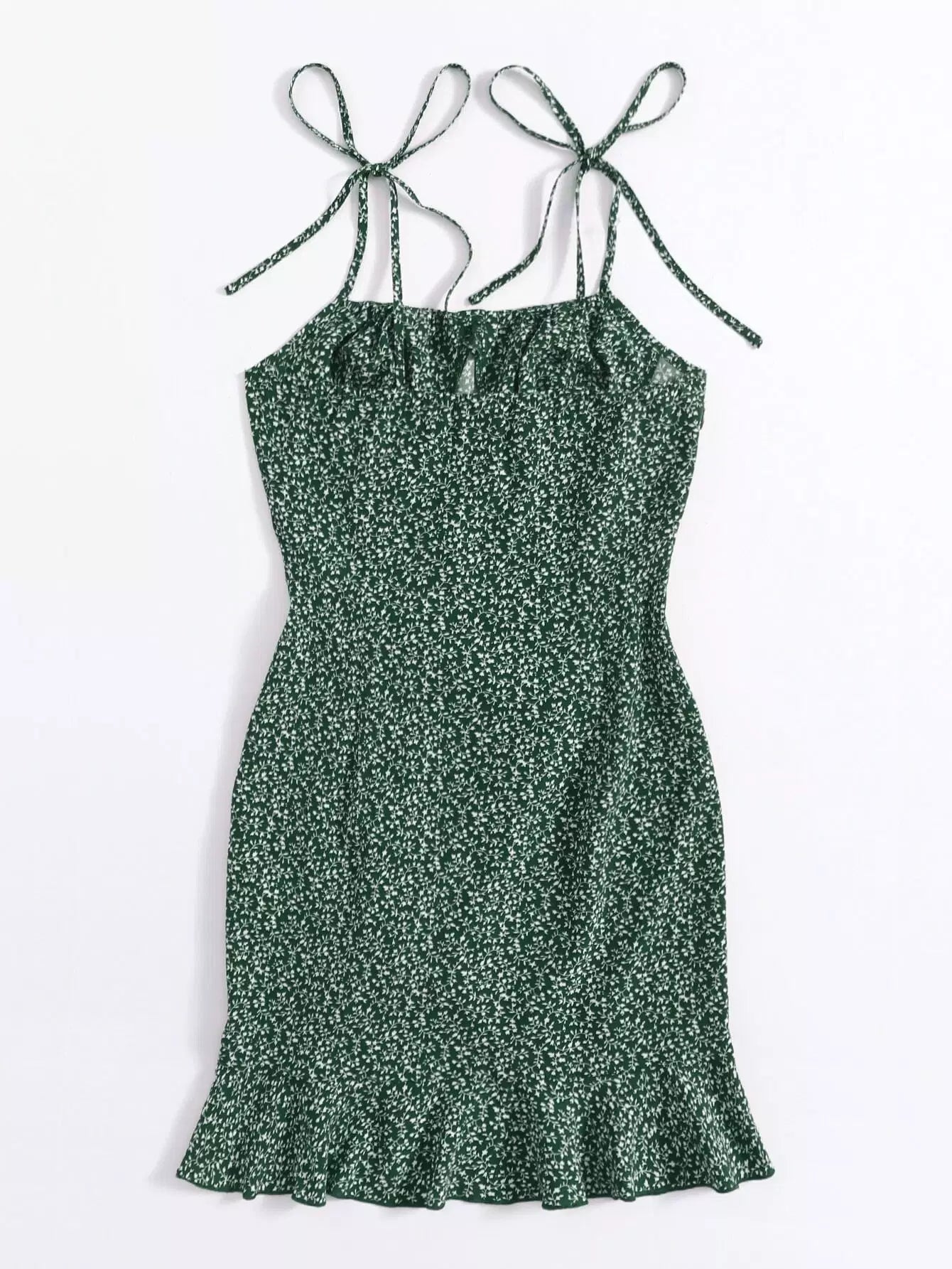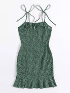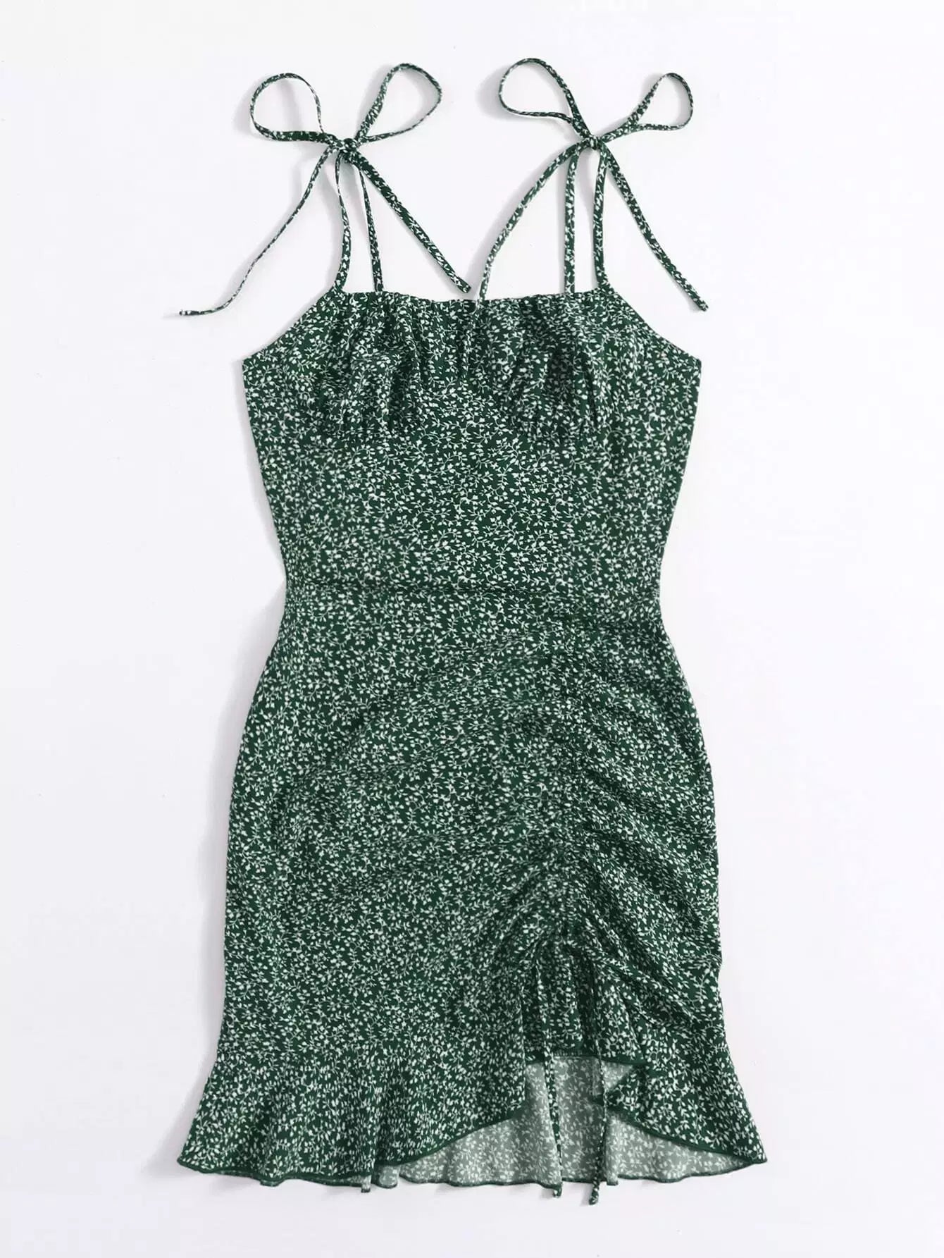 فستان من النباتات بكتف مربوط وحزام سحب أمامي وحاشية مكشكشة في كل مكان